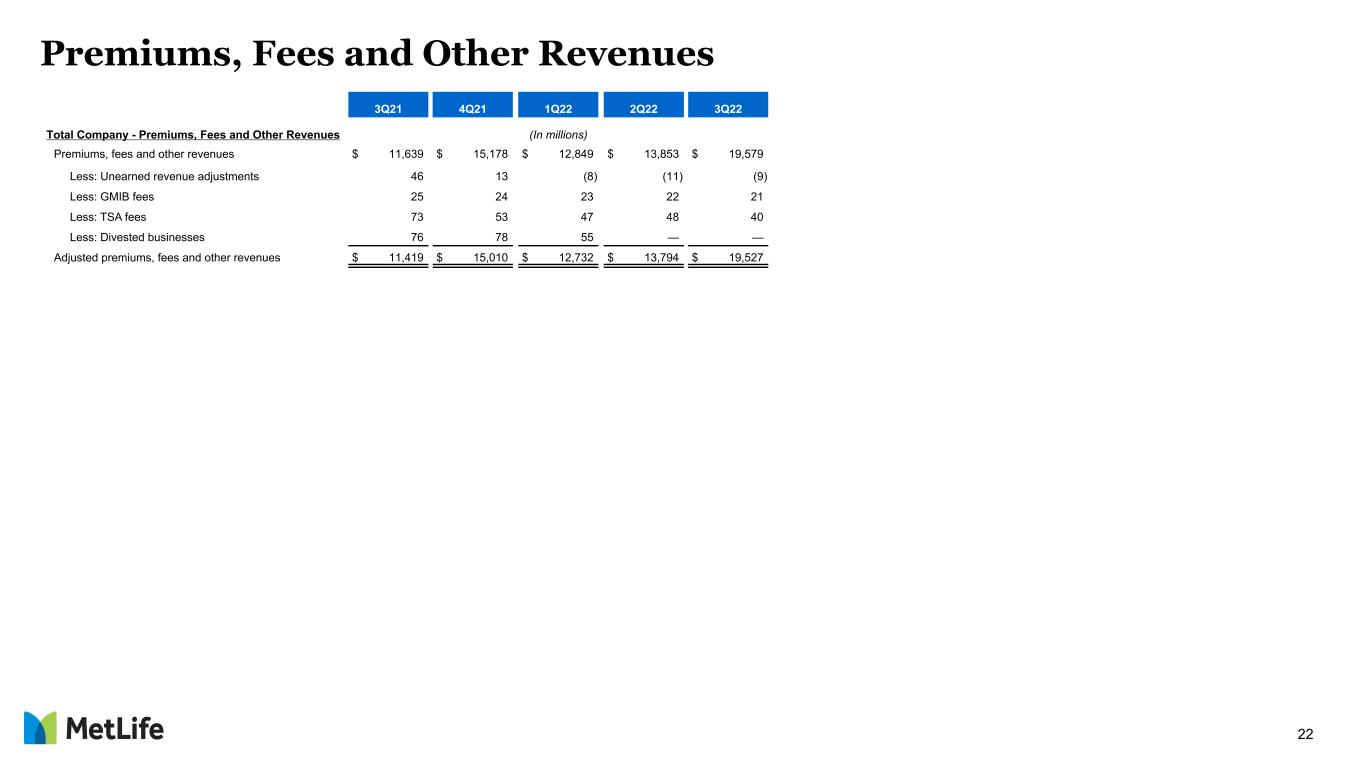 メットライフの 2022 年第 3 四半期の保険料、手数料及びその他の収益は 196 億ドルで、前年同期から 68%増加しました。調整後の保険料、手数料及びその他の収益は、報告ベースで 71%増加し、恒常為替レートベースで前年同期から 78%増加し、195 億ドルでした。