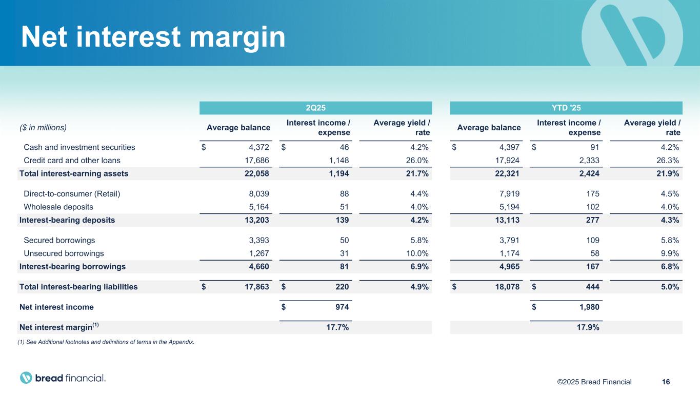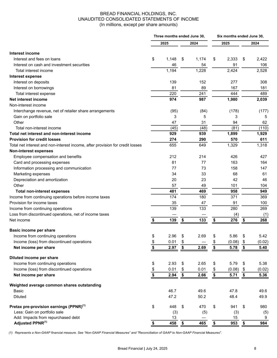 Bread Financial | July 24, 2025 8 Three months ended June 30, Six months ended June 30, 2025 2024 2025 2024 Interest income Interest and fees on loans $ 1,148 $ 1,174 $ 2,333 $ 2,422 Interest on cash and investment securities 46 54 91 106 Total interest income 1,194 1,228 2,424 2,528 Interest expense Interest on deposits 139 152 277 308 Interest on borrowings 81 89 167 181 Total interest expense 220 241 444 489 Net interest income 974 987 1,980 2,039 Non-interest income Interchange revenue, net of retailer share arrangements (95) (84) (178) (177) Gain on portfolio sale 3 5 3 5 Other 47 31 94 62 Total non-interest income (45) (48) (81) (110) Total net interest and non-interest income 929 939 1,899 1,929 Provision for credit losses 274 290 570 611 Total net interest and non-interest income, after provision for credit losses 655 649 1,329 1,318 Non-interest expenses Employee compensation and benefits 212 214 426 427 Card and processing expenses 81 77 163 164 Information processing and communication 77 73 158 147 Marketing expenses 34 33 68 61 Depreciation and amortization 20 23 42 46 Other 57 49 101 104 Total non-interest expenses 481 469 958 949 Income from continuing operations before income taxes 174 180 371 369 Provision for income taxes 35 47 91 100 Income from continuing operations 139 133 280 269 Loss from discontinued operations, net of income taxes — — (4) (1) Net income $ 139 $ 133 $ 276 $ 268 Basic income per share Income from continuing operations $ 2.96 $ 2.69 $ 5.86 $ 5.42 Income (loss) from discontinued operations $ 0.01 $ — $ (0.08) $ (0.02) Net income per share $ 2.97 $ 2.69 $ 5.78 $ 5.40 Diluted income per share Income from continuing operations $ 2.93 $ 2.65 $ 5.79 $ 5.38 Income (loss) from discontinued operations $ 0.01 $ 0.01 $ (0.08) $ (0.02) Net income per share $ 2.94 $ 2.66 $ 5.71 $ 5.36 Weighted average common shares outstanding Basic 46.7 49.6 47.8 49.6 Diluted 47.2 50.2 48.4 49.9 Pretax pre-provision earnings (PPNR)(1) $ 448 $ 470 $ 941 $ 980 Less: Gain on portfolio sale (3) (5) (3) (5) Add: Impacts from repurchased debt 13 — 15 9 Adjusted PPNR(1) $ 458 $ 465 $ 953 $ 984 BREAD FINANCIAL HOLDINGS, INC. UNAUDITED CONSOLIDATED STATEMENTS OF INCOME (In millions, except per share amounts) (1) Represents a Non-GAAP financial measure. See “Non-GAAP Financial Measures” and "Reconciliation of GAAP to Non-GAAP Financial Measures".