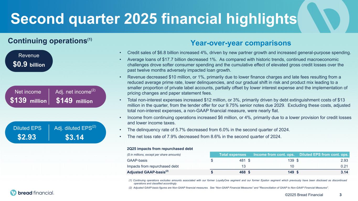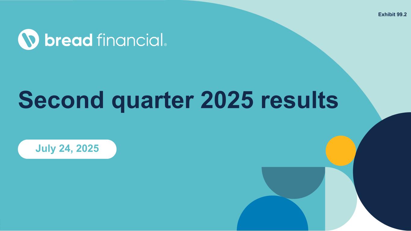 Bread Financial | July 24, 2025 2 "Our second quarter results again underscored the financial resilience of our business model, as we continued to generate high levels of capital and cash flow, despite elevated, albeit improving, credit metrics. Consumer financial health in 2025 has remained stable as second quarter credit sales grew 4% year-over-year and credit metrics continued to gradually improve. Income from continuing operations increased 4% year-over-year, primarily due to a lower provision for credit losses and lower income taxes, with adjusted total non-interest expenses, a non-GAAP financial measure, essentially flat year-over year despite inflationary and wage pressures as a result of our focus on operational excellence. "Net interest margin declined sequentially to 17.7%, following seasonal loan yield trends, pressured by lower billed late fees from lower delinquencies and an elevated cash position, partially offset by the gradual build of implemented pricing changes. Given improving delinquency trends and our improved net loss rate outlook, we are projecting lower billed late fees for the remainder of the year, modestly pressuring our full year revenue expectation. "Our efforts to strengthen and optimize our balance sheet are ongoing. In April we completed our $150 million board-authorized share repurchase program with 3.2 million shares repurchased year-to-date, while improving our CET1 ratio to 13.0% from 12.0% in the first quarter of 2025. Additionally, in June we completed a $150 million tender offer for our 9.75% senior notes due 2029, using excess cash on hand to reduce higher cost debt. Direct-to- consumer deposits increased 12% year-over-year to $8.1 billion at quarter-end. Our average direct-to-consumer deposits now represent 45% of total funding, up from 40% a year ago and approaching our target of more than 50%. "Our credit metrics continue to benefit from our disciplined credit risk management. As previously disclosed, the hurricane-related customer-friendly actions we took in October and November of 2024 negatively impacted second quarter losses by approximately $13 million or 30 basis points. Given macroeconomic uncertainty, including potential tariff and employment impacts, we remain vigilant with our credit strategies. As a result of our better than expected credit performance during the first half of 2025, we have improved our full year 2025 net loss rate guidance. "The second quarter reserve rate of 11.9% at quarter-end reflects our improving credit metrics and higher-quality new account acquisitions. We continue to maintain prudent weightings on the economic scenarios in our credit reserve modeling given the wide range of potential macroeconomic outcomes. "We remain confident in our ability to achieve solid financial results in 2025 and deliver strong long-term returns." - Perry Beberman, executive vice president and chief financial officer 2025 full year outlook • "Our 2025 outlook reflects continued consumer resiliency, inflation remaining above the Fed target rate, and a healthy labor market. Our outlook also anticipates interest rate decreases by the Federal Reserve, which will modestly pressure total net interest income. • Average loan growth: "We expect 2025 average credit card and other loans to be flat to slightly down versus full year 2024. • Total revenue: "We anticipate total revenue, excluding any gain on portfolio sale, to be relatively flat versus full year 2024. • Total expenses: "As a result of efficiencies gained from ongoing operational excellence initiatives, along with disciplined expense management and prudent investments, we expect to generate nominal positive operating leverage in 2025, excluding any gain on portfolio sale and the pretax impacts from our repurchased debt, including convertible and senior notes. • Net loss rate: "We anticipate a 2025 net loss rate in the range of 7.8% to 7.9%. • Effective tax rate: "We expect our full year normalized effective tax rate to be in the range of 25% to 26%, with quarter-over-quarter variability due to the timing of certain discrete items." CFO COMMENTARY