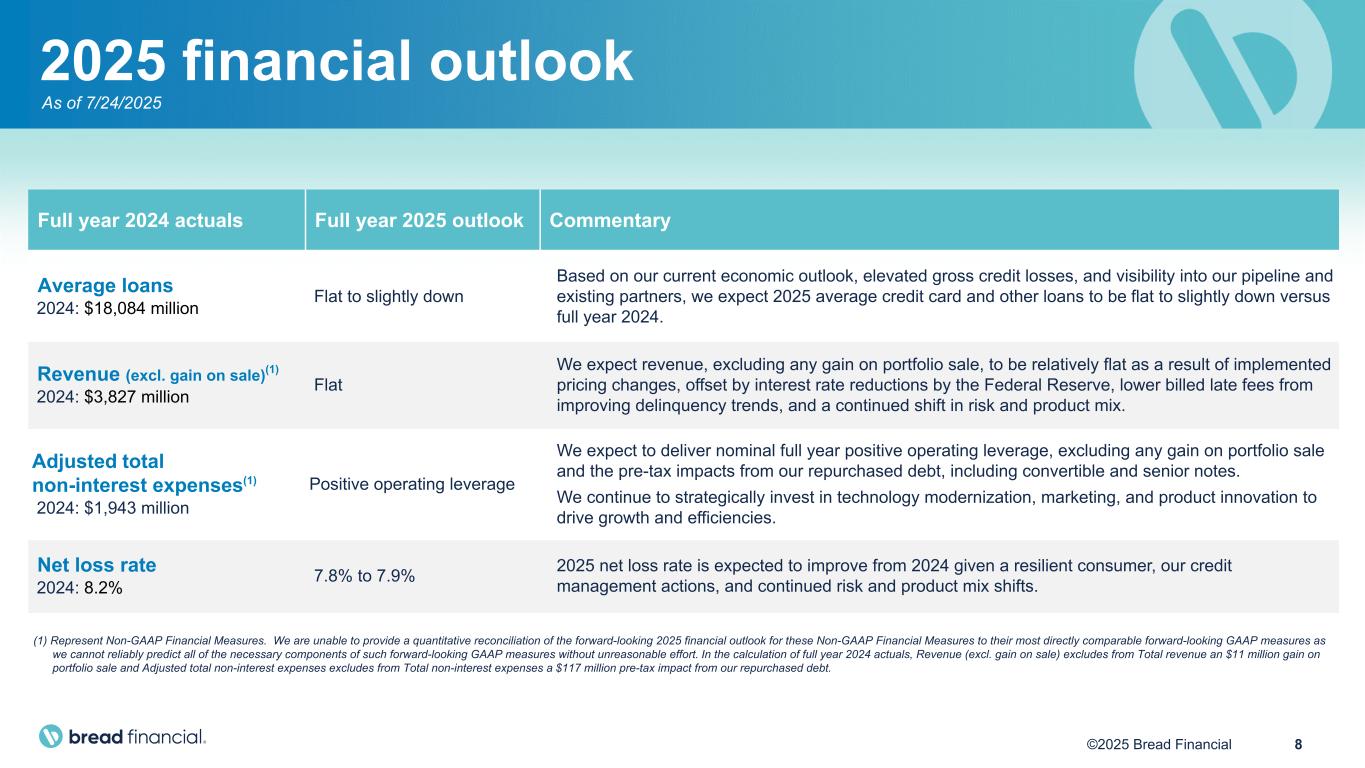 Bread Financial | July 24, 2025 6 Non-GAAP financial measures We prepare our Consolidated Financial Statements in accordance with accounting principles generally accepted in the United States of America (GAAP). However, certain information included herein constitutes Non-GAAP Financial Measures. Our calculations of Non-GAAP Financial Measures may differ from the calculations of similarly titled measures by other companies. In particular: • We may from time to time repurchase debt, including our outstanding senior unsecured notes, subordinated notes or convertible notes. From a GAAP perspective we may pay a premium to induce these repurchases, or in certain cases repurchase at a discount, which would result in an impact to Total non-interest expenses, with a corresponding impact also reflected in Net income and consequently our Earnings per diluted share. We have shown adjustments to these three financial statement line items, for total Company as well as for continuing operations, to exclude the impacts from our repurchased debt transactions. We use Adjusted total non-interest expenses, Adjusted net income, and Adjusted earnings per diluted share to evaluate the ongoing operations of the Company excluding the volatility that can occur from the impacts of our repurchased debt transactions. • Pretax pre-provision earnings (PPNR) represents Income from continuing operations before income taxes and the Provision for credit losses. PPNR excluding any gain on portfolio sale and impacts from repurchased debt then excludes from PPNR the gain on any portfolio sale in the period, as well as the loss or gain on any repurchased debt in the period. We use PPNR and PPNR excluding any gain on portfolio sale and impacts from repurchased debt as metrics to evaluate our results of operations before income taxes, excluding the volatility that can occur within Provision for credit losses and the one-time nature of a gain on the sale of a portfolio and/or the impacts from repurchased debt. • Return on average tangible common equity (ROTCE) represents annualized Income from continuing operations divided by average Tangible common equity. Tangible common equity (TCE) represents Total stockholders' equity reduced by Goodwill and intangible assets, net. We use ROTCE as a metric to evaluate the Company's performance. • Tangible book value per common share represents TCE divided by shares outstanding. We use Tangible book value per common share, a metric used across the industry, to estimate liquidation value. We believe the use of these Non-GAAP financial measures provide additional clarity in understanding our results of operations and trends. For a reconciliation of these Non-GAAP financial measures to the most directly comparable GAAP measures, please see the “Reconciliation of GAAP to Non-GAAP Financial Measures”.