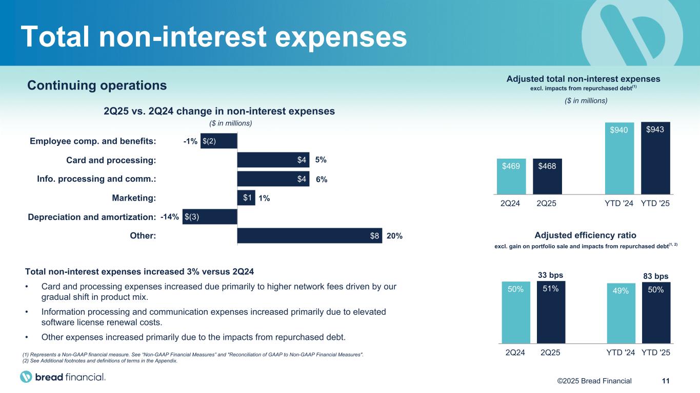 Bread Financial | July 24, 2025 10 BREAD FINANCIAL HOLDINGS, INC. RECONCILIATION OF GAAP TO NON-GAAP FINANCIAL MEASURES (In millions, except percentages) As of or for the three months ended June 30, As of or for the six months ended June 30, 2025 2024 % change 2025 2024 % change Adjusted net income Income from continuing operations $ 139 $ 133 4 $ 280 $ 269 4 Loss from discontinued operations — — 121 (4) (1) 220 Net income 139 133 4 276 268 3 Impacts from repurchased debt 10 — nm 12 7 68 Adjusted net income $ 149 $ 133 12 $ 288 $ 275 5 Adjusted income from continuing operations $ 149 $ 133 12 $ 292 $ 276 6 Weighted average shares outstanding – diluted 47.2 50.2 48.4 49.9 Adjusted income per diluted share Net income from continuing operations per diluted share $ 2.93 $ 2.65 11 $ 5.79 $ 5.38 8 Net income (loss) from discontinued operations per diluted share 0.01 0.01 135 (0.08) (0.02) 230 Net income per diluted share $ 2.94 $ 2.66 11 $ 5.71 $ 5.36 7 Impacts from repurchased debt 0.21 — nm 0.25 0.15 73 Adjusted net income per diluted share $ 3.15 $ 2.66 19 $ 5.96 $ 5.51 8 Adjusted income from continuing operations per diluted share $ 3.14 $ 2.65 18 $ 6.04 $ 5.53 9 Adjusted total non-interest expenses Total non-interest expenses $ 481 $ 469 3 $ 958 $ 949 1 Impacts from repurchased debt 13 — nm 15 9 64 Adjusted total non-interest expenses $ 468 $ 469 — $ 943 $ 940 — Pretax pre-provision earnings Income from continuing operations before income taxes $ 174 $ 180 (3) $ 371 $ 369 1 Provision for credit losses 274 290 (5) 570 611 (7) Pretax pre-provision earnings (PPNR) 448 470 (5) $ 941 $ 980 (4) Less: Gain on portfolio sale (3) (5) (37) (3) (5) (37) Add: Impacts from repurchased debt 13 — nm 15 9 64 Adjusted PPNR $ 458 $ 465 (1) $ 953 $ 984 (3) nm – Not meaningful, denoting a variance of 1,000 percent or more. Continued on the following page