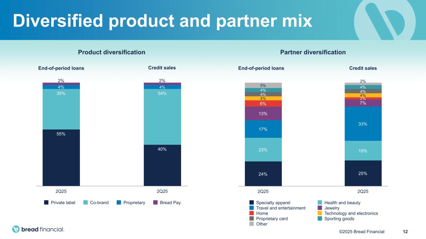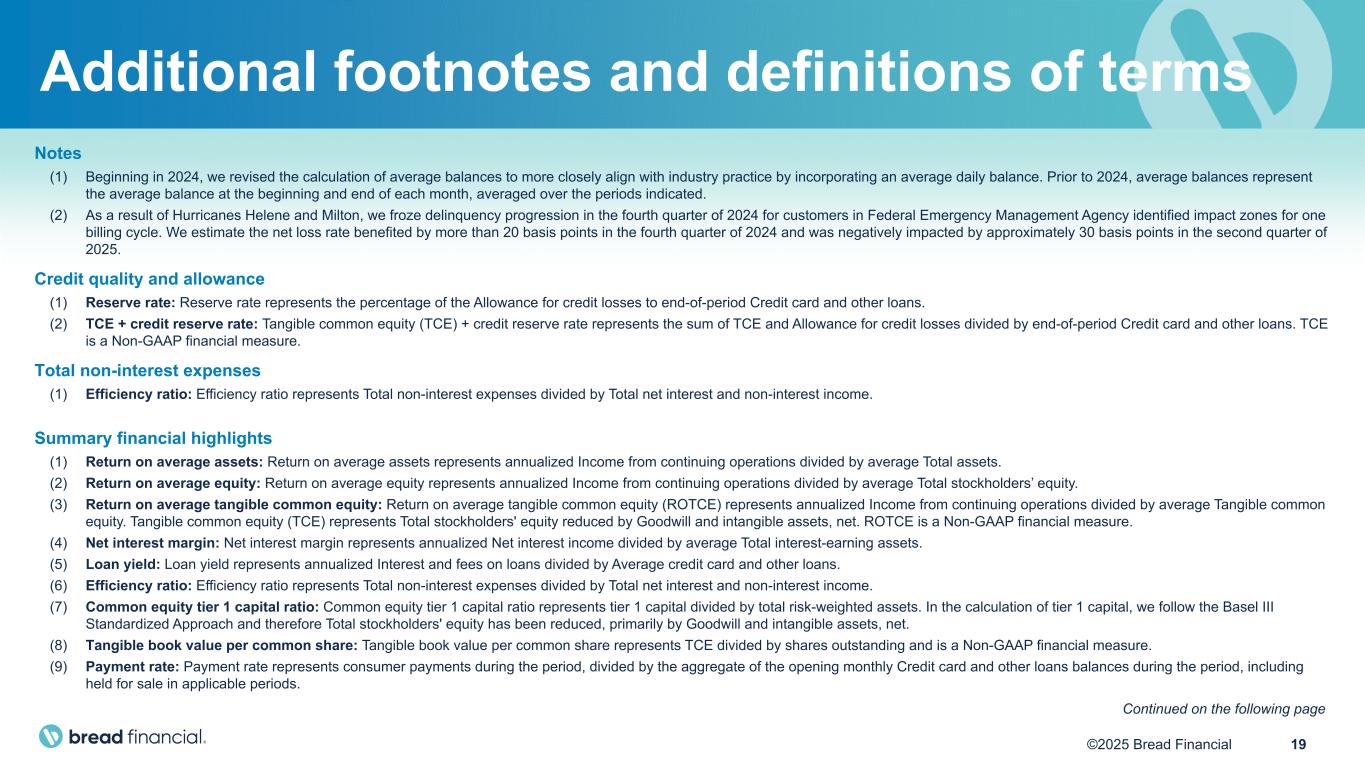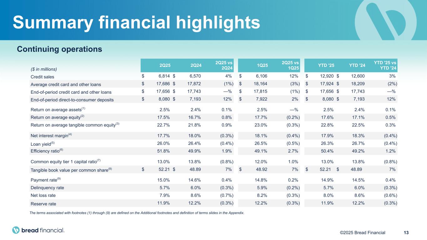 Bread Financial | July 24, 2025 12 BREAD FINANCIAL HOLDINGS, INC. UNAUDITED SUMMARY FINANCIAL HIGHLIGHTS (In millions, except per share amounts and percentages) As of or for the three months ended June 30, As of or for the six months ended June 30, 2025 2024 % change 2025 2024 % change Credit sales $ 6,814 $ 6,570 4 $ 12,920 $ 12,600 3 Average credit card and other loans $ 17,686 $ 17,872 (1) $ 17,924 $ 18,209 (2) End-of-period credit card and other loans $ 17,656 $ 17,743 — $ 17,656 $ 17,743 — End-of-period direct-to-consumer deposits $ 8,080 $ 7,193 12 $ 8,080 $ 7,193 12 Return on average assets(1) 2.5% 2.4% 0.1 2.5% 2.4% 0.1 Return on average equity(2) 17.5% 16.7% 0.8 17.6% 17.1% 0.5 Return on average tangible common equity(3) 22.7 % 21.8 % 0.9 22.8% 22.5% 0.3 Net interest margin(4) 17.7% 18.0% (0.3) 17.9% 18.3% (0.4) Loan yield(5) 26.0% 26.4% (0.4) 26.3% 26.7% (0.4) Efficiency ratio(6) 51.8% 49.9% 1.9 50.4% 49.2% 1.2 Common equity tier 1 capital ratio(7) 13.0% 13.8% (0.8) 13.0% 13.8% (0.8) Tangible book value per common share(8) $ 52.21 $ 48.89 7 $ 52.21 $ 48.89 7 Payment rate(9) 15.0% 14.6% 0.4 14.9% 14.5% 0.4 Delinquency rate 5.7% 6.0% (0.3) 5.7% 6.0% (0.3) Net loss rate 7.9% 8.6% (0.7) 8.0% 8.6% (0.6) Reserve rate 11.9% 12.2% (0.3) 11.9% 12.2% (0.3) (1) Return on average assets represents annualized Income from continuing operations divided by average Total assets. (2) Return on average equity represents annualized Income from continuing operations divided by average Total stockholders’ equity. (3) Return on average tangible common equity (ROTCE) represents annualized Income from continuing operations divided by average Tangible common equity. Tangible common equity (TCE) represents Total stockholders' equity reduced by Goodwill and intangible assets, net. ROTCE is a Non-GAAP financial measure. (4) Net interest margin represents annualized Net interest income divided by average Total interest-earning assets. (5) Loan yield represents annualized Interest and fees on loans divided by Average credit card and other loans. (6) Efficiency ratio represents Total non-interest expenses divided by Total net interest and non-interest income. (7) Common equity tier 1 capital ratio represents tier 1 capital divided by total risk-weighted assets. In the calculation of tier 1 capital, we follow the Basel III Standardized Approach and therefore Total stockholders' equity has been reduced, primarily by Goodwill and intangible assets, net. (8) Tangible book value per common share represents TCE divided by shares outstanding and is a Non-GAAP financial measure. (9) Payment rate represents consumer payments during the period, divided by the aggregate of the opening monthly Credit card and other loans balances during the period, including held for sale in applicable periods.