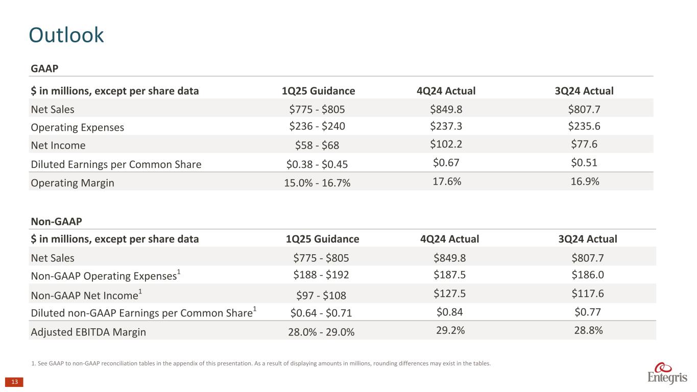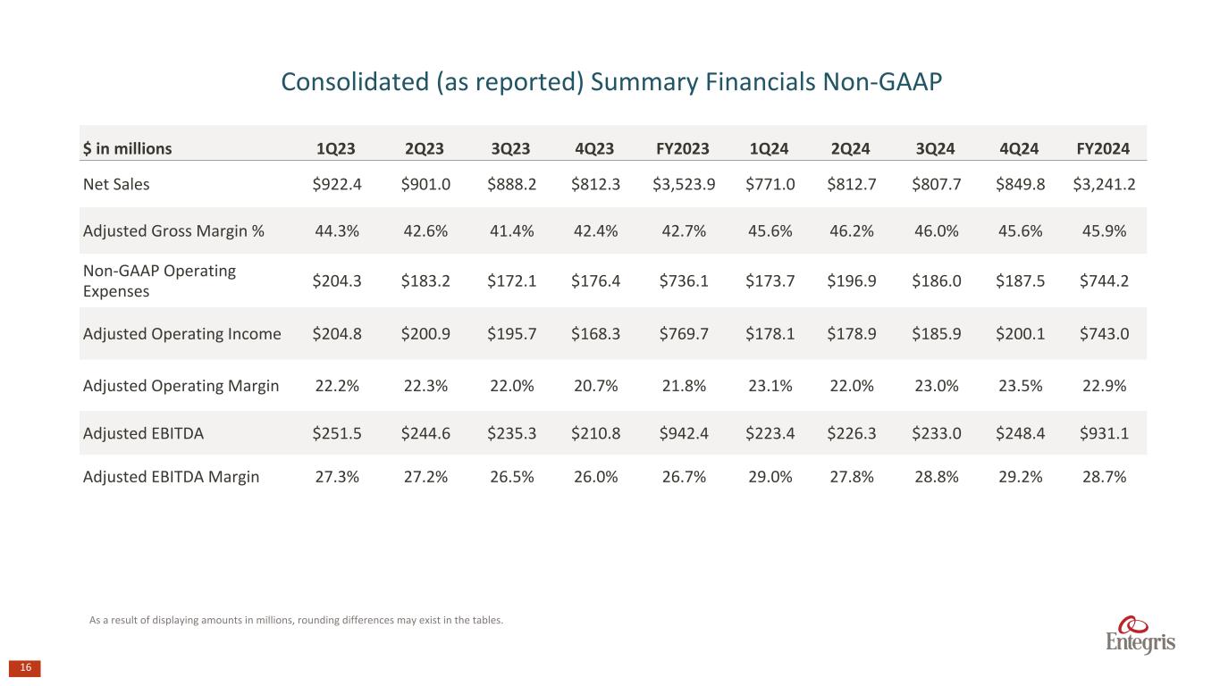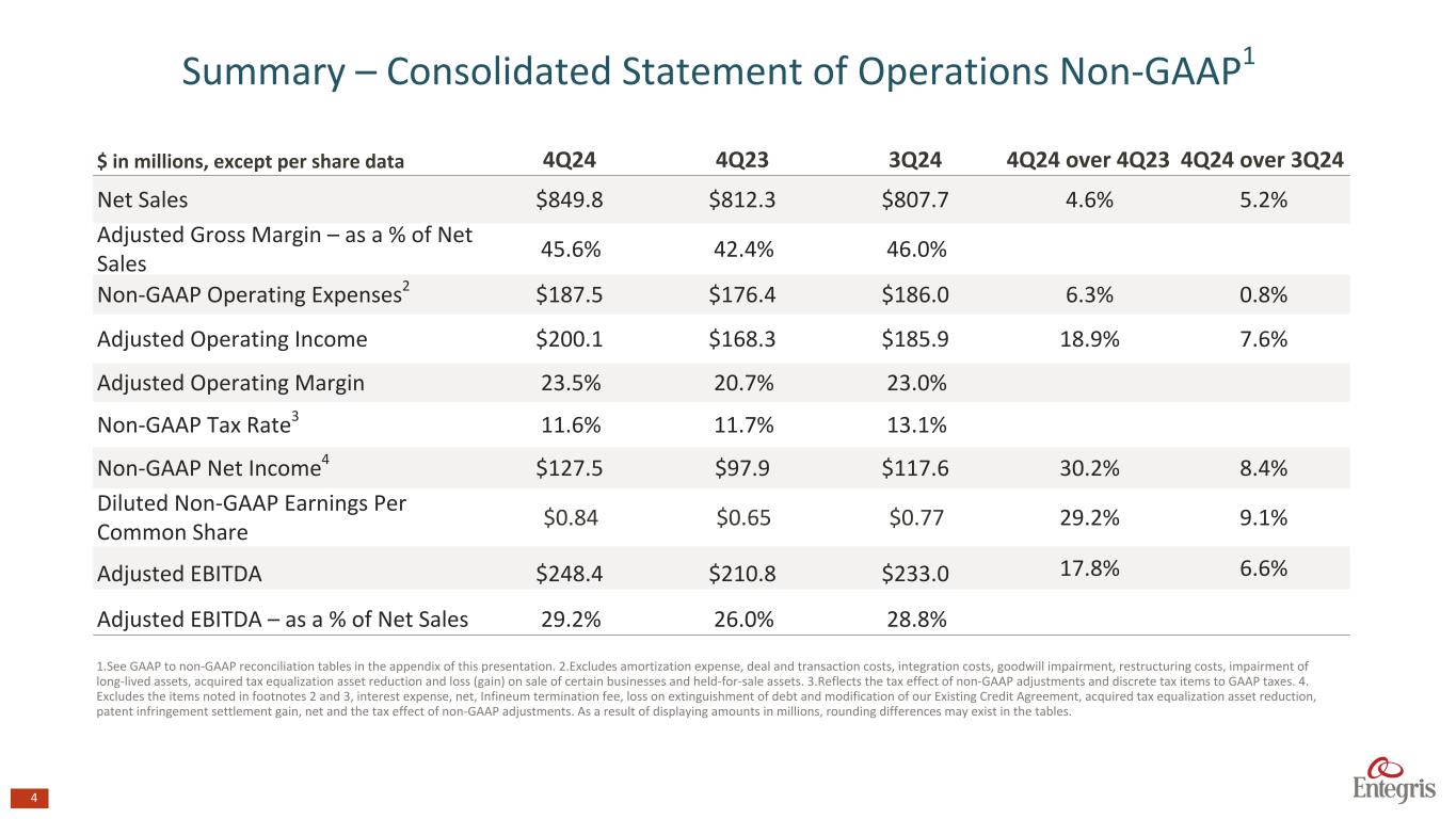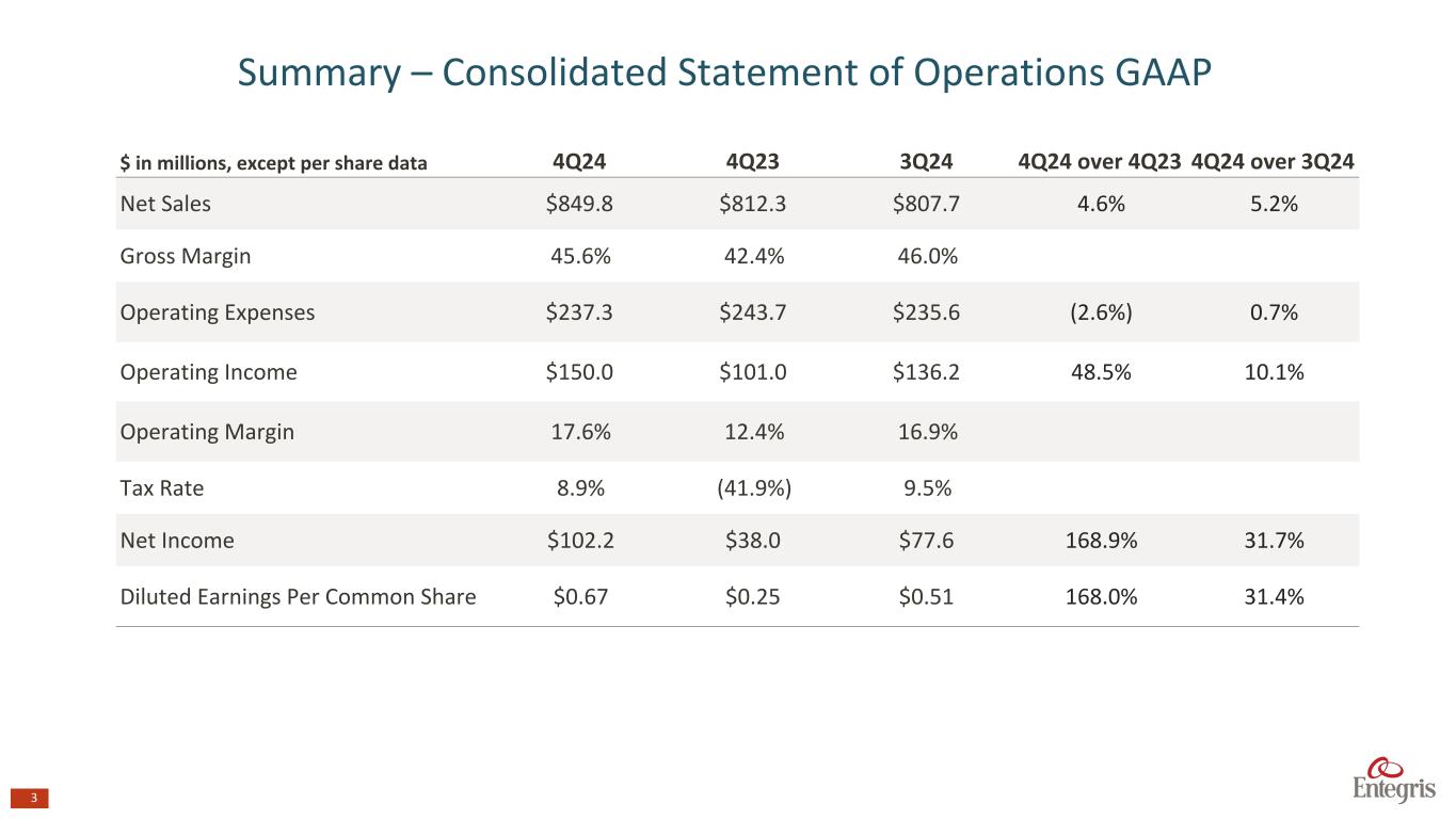 マサチューセッツ州ビレリカ、2025年2月6日 - エンテグリス・インク(NASDAQ: ENTG)は本日、2024年12月31日を期末とする第4四半期の決算を発表した。
