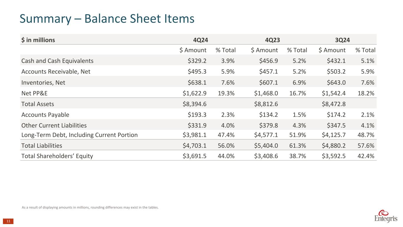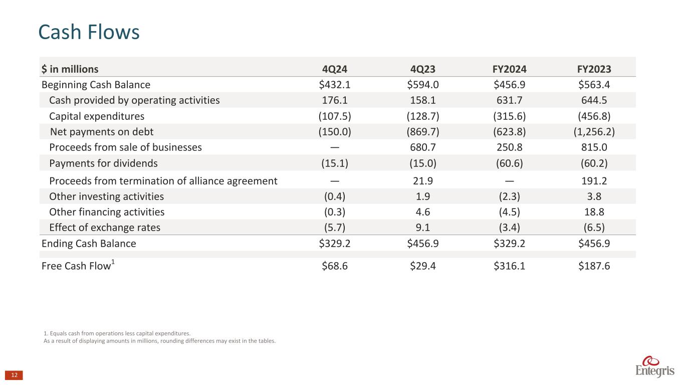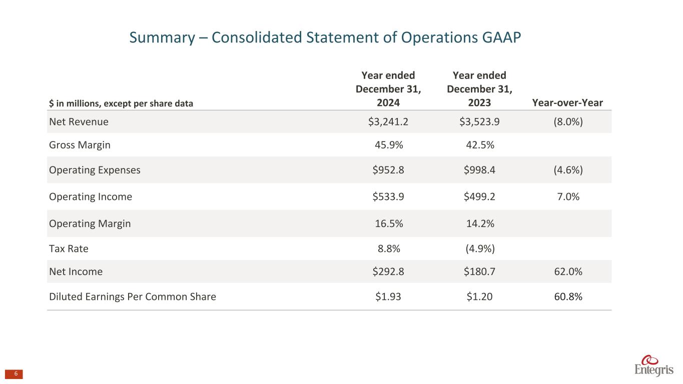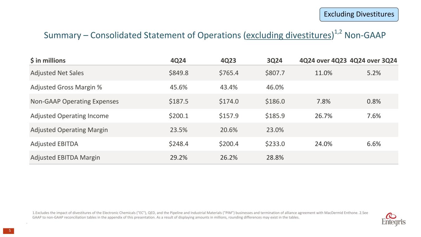 マサチューセッツ州ビレリカ、2025年2月6日 - エンテグリス・インク(NASDAQ: ENTG)は本日、2024年12月31日を期末とする第4四半期の決算を発表した。