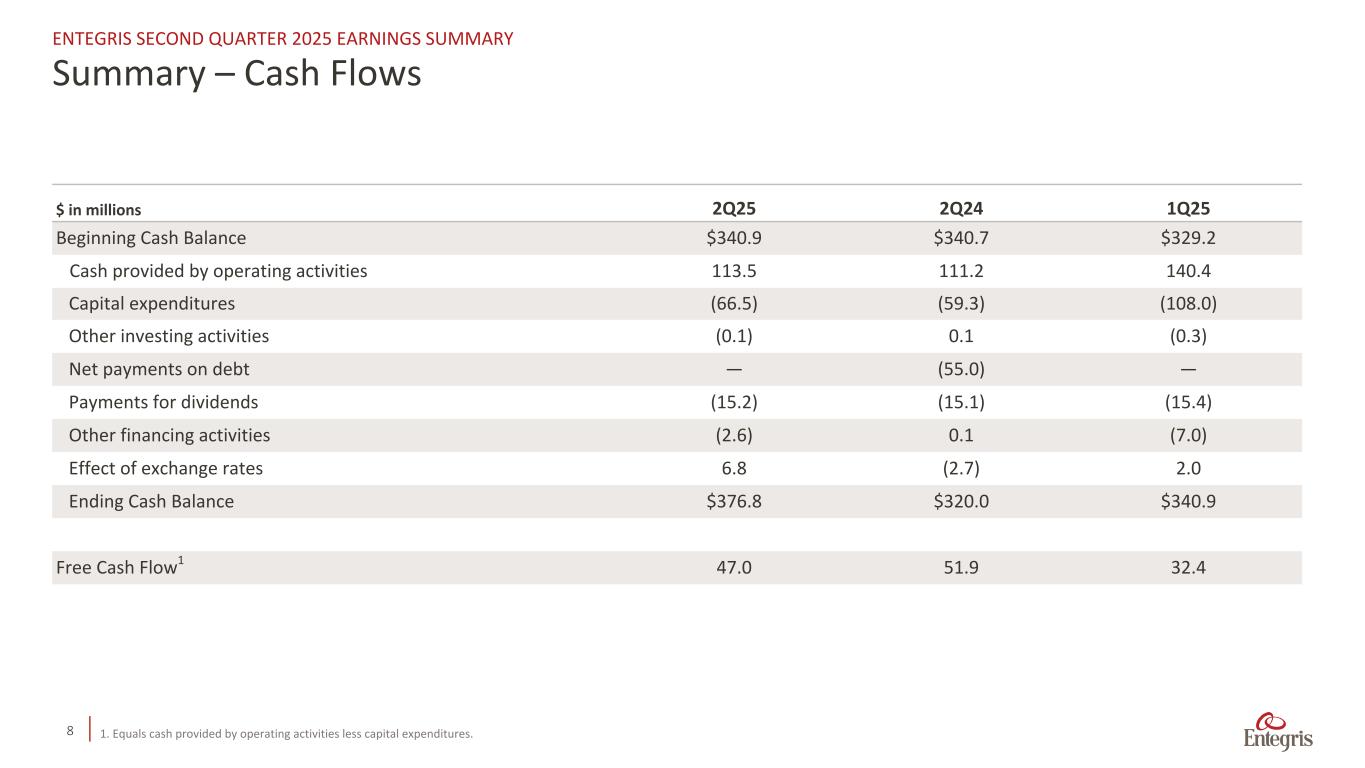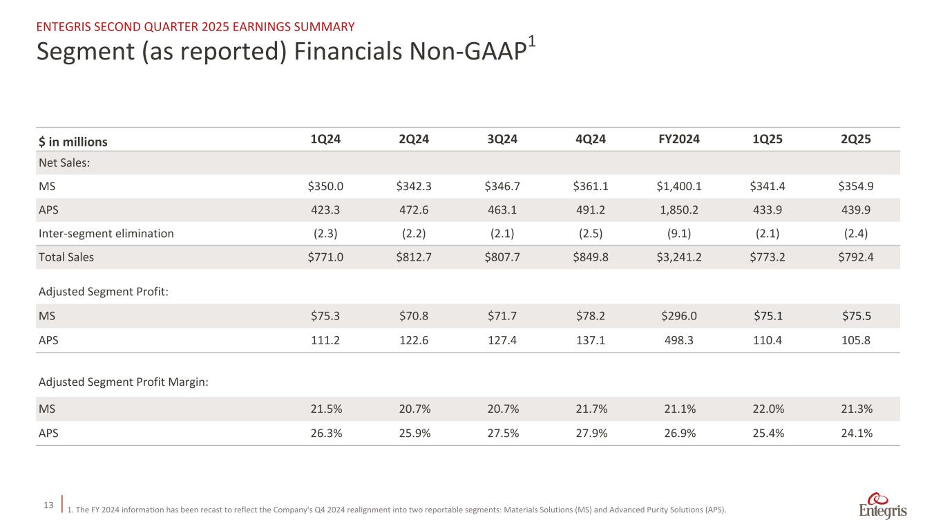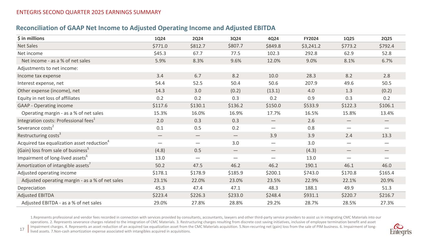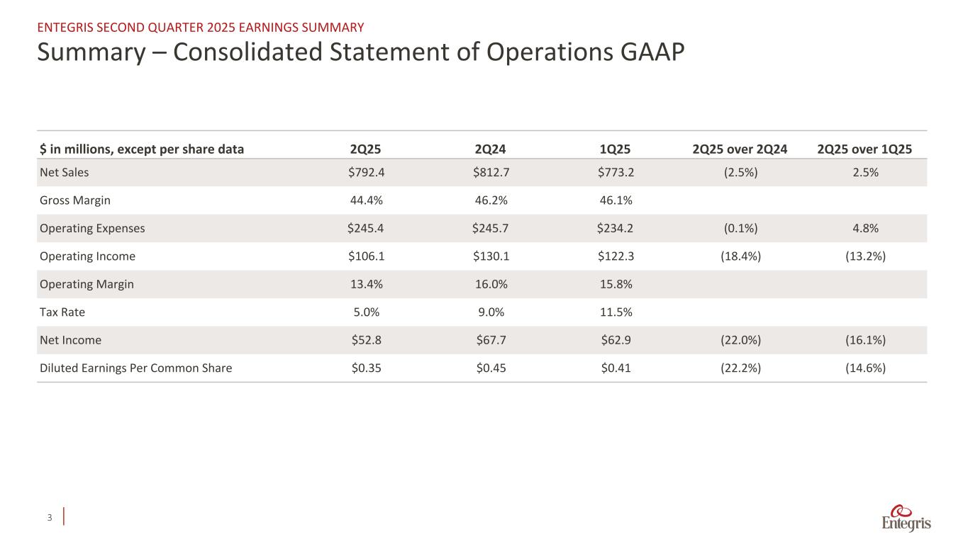 マサチューセッツ州ビレリカ、2025年7月30日 - エンテグリス・インク(NASDAQ: ENTG)は本日、2025年6月28日締めの第2四半期決算を発表した。