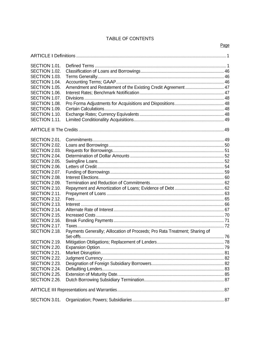 TABLE OF CONTENTS Page ARTICLE I Definitions ................................................................................................................................ 1 SECTION 1.01. Defined Terms ................................................................................................................ 1 SECTION 1.02. Classification of Loans and Borrowings ....................................................................... 46 SECTION 1.03. Terms Generally............................................................................................................ 46 SECTION 1.04. Accounting Terms; GAAP ............................................................................................ 46 SECTION 1.05. Amendment and Restatement of the Existing Credit Agreement ................................. 47 SECTION 1.06. Interest Rates; Benchmark Notification ........................................................................ 47 SECTION 1.07. Divisions ....................................................................................................................... 48 SECTION 1.08. Pro Forma Adjustments for Acquisitions and Dispositions .......................................... 48 SECTION 1.09. Certain Calculations ...................................................................................................... 48 SECTION 1.10. Exchange Rates; Currency Equivalents ........................................................................ 48 SECTION 1.11. Limited Conditionality Acquisitions ............................................................................. 49 ARTICLE II The Credits ............................................................................................................................ 49 SECTION 2.01. Commitments ................................................................................................................ 49 SECTION 2.02. Loans and Borrowings .................................................................................................. 50 SECTION 2.03. Requests for Borrowings ............................................................................................... 51 SECTION 2.04. Determination of Dollar Amounts ................................................................................ 52 SECTION 2.05. Swingline Loans............................................................................................................ 52 SECTION 2.06. Letters of Credit ............................................................................................................ 54 SECTION 2.07. Funding of Borrowings ................................................................................................. 59 SECTION 2.08. Interest Elections ........................................................................................................... 60 SECTION 2.09. Termination and Reduction of Commitments ............................................................... 62 SECTION 2.10. Repayment and Amortization of Loans; Evidence of Debt .......................................... 62 SECTION 2.11. Prepayment of Loans .................................................................................................... 63 SECTION 2.12. Fees ............................................................................................................................... 65 SECTION 2.13. Interest .......................................................................................................................... 66 SECTION 2.14. Alternate Rate of Interest .............................................................................................. 67 SECTION 2.15. Increased Costs ............................................................................................................. 70 SECTION 2.16. Break Funding Payments .............................................................................................. 71 SECTION 2.17. Taxes ............................................................................................................................. 72 SECTION 2.18. Payments Generally; Allocation of Proceeds; Pro Rata Treatment; Sharing of Set-offs .......................................................................................................................... 76 SECTION 2.19. Mitigation Obligations; Replacement of Lenders ......................................................... 78 SECTION 2.20. Expansion Option.......................................................................................................... 79 SECTION 2.21. Market Disruption ......................................................................................................... 81 SECTION 2.22. Judgment Currency ....................................................................................................... 82 SECTION 2.23. Designation of Foreign Subsidiary Borrowers .............................................................. 82 SECTION 2.24. Defaulting Lenders ........................................................................................................ 83 SECTION 2.25. Extension of Maturity Date. .......................................................................................... 85 SECTION 2.26. Dutch Borrowing Subsidiary Termination .................................................................... 87 ARTICLE III Representations and Warranties ........................................................................................... 87 SECTION 3.01. Organization; Powers; Subsidiaries .............................................................................. 87
