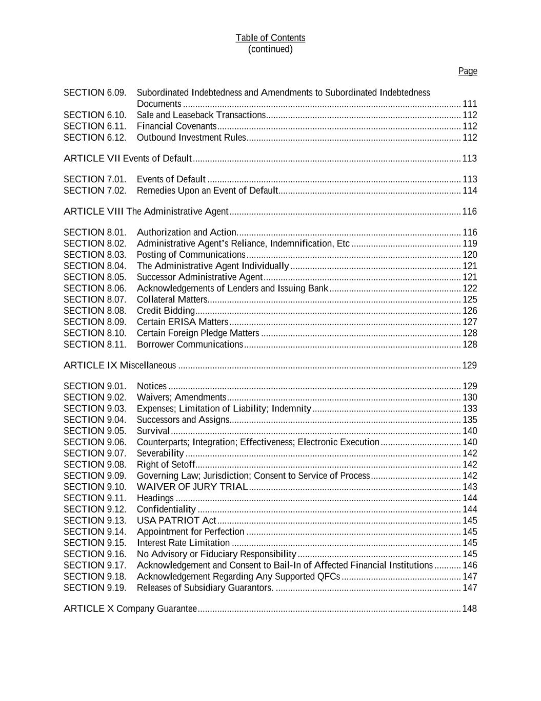 Table of Contents (continued) Page SECTION 6.09. Subordinated Indebtedness and Amendments to Subordinated Indebtedness Documents .................................................................................................................. 111 SECTION 6.10. Sale and Leaseback Transactions ................................................................................ 112 SECTION 6.11. Financial Covenants .................................................................................................... 112 SECTION 6.12. Outbound Investment Rules ........................................................................................ 112 ARTICLE VII Events of Default .............................................................................................................. 113 SECTION 7.01. Events of Default ........................................................................................................ 113 SECTION 7.02. Remedies Upon an Event of Default ........................................................................... 114 ARTICLE VIII The Administrative Agent ............................................................................................... 116 SECTION 8.01. Authorization and Action. ........................................................................................... 116 SECTION 8.02. Administrative Agent’s Reliance, Indemnification, Etc ............................................. 119 SECTION 8.03. Posting of Communications ........................................................................................ 120 SECTION 8.04. The Administrative Agent Individually ...................................................................... 121 SECTION 8.05. Successor Administrative Agent ................................................................................. 121 SECTION 8.06. Acknowledgements of Lenders and Issuing Bank ...................................................... 122 SECTION 8.07. Collateral Matters ........................................................................................................ 125 SECTION 8.08. Credit Bidding ............................................................................................................. 126 SECTION 8.09. Certain ERISA Matters ............................................................................................... 127 SECTION 8.10. Certain Foreign Pledge Matters .................................................................................. 128 SECTION 8.11. Borrower Communications ......................................................................................... 128 ARTICLE IX Miscellaneous .................................................................................................................... 129 SECTION 9.01. Notices ........................................................................................................................ 129 SECTION 9.02. Waivers; Amendments ................................................................................................ 130 SECTION 9.03. Expenses; Limitation of Liability; Indemnity ............................................................. 133 SECTION 9.04. Successors and Assigns ............................................................................................... 135 SECTION 9.05. Survival ....................................................................................................................... 140 SECTION 9.06. Counterparts; Integration; Effectiveness; Electronic Execution ................................. 140 SECTION 9.07. Severability ................................................................................................................. 142 SECTION 9.08. Right of Setoff............................................................................................................. 142 SECTION 9.09. Governing Law; Jurisdiction; Consent to Service of Process ..................................... 142 SECTION 9.10. WAIVER OF JURY TRIAL ....................................................................................... 143 SECTION 9.11. Headings ..................................................................................................................... 144 SECTION 9.12. Confidentiality ............................................................................................................ 144 SECTION 9.13. USA PATRIOT Act .................................................................................................... 145 SECTION 9.14. Appointment for Perfection ........................................................................................ 145 SECTION 9.15. Interest Rate Limitation .............................................................................................. 145 SECTION 9.16. No Advisory or Fiduciary Responsibility ................................................................... 145 SECTION 9.17. Acknowledgement and Consent to Bail-In of Affected Financial Institutions ........... 146 SECTION 9.18. Acknowledgement Regarding Any Supported QFCs ................................................. 147 SECTION 9.19. Releases of Subsidiary Guarantors. ............................................................................ 147 ARTICLE X Company Guarantee ............................................................................................................ 148