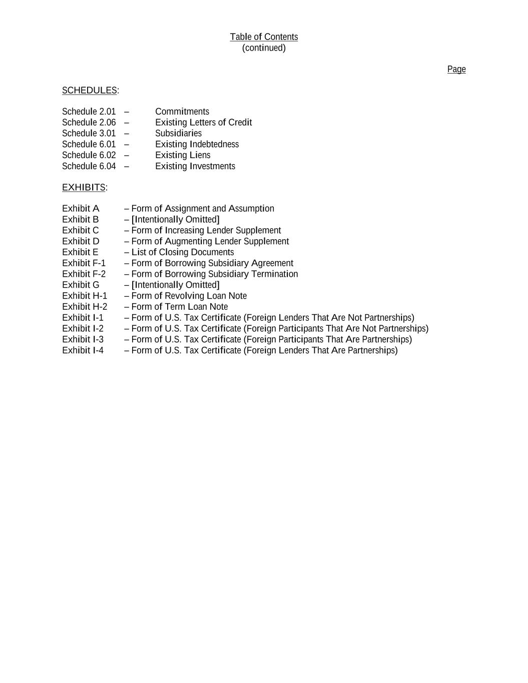 Table of Contents (continued) Page SCHEDULES: Schedule 2.01 – Commitments Schedule 2.06 – Existing Letters of Credit Schedule 3.01 – Subsidiaries Schedule 6.01 – Existing Indebtedness Schedule 6.02 – Existing Liens Schedule 6.04 – Existing Investments EXHIBITS: Exhibit A – Form of Assignment and Assumption Exhibit B – [Intentionally Omitted] Exhibit C – Form of Increasing Lender Supplement Exhibit D – Form of Augmenting Lender Supplement Exhibit E – List of Closing Documents Exhibit F-1 – Form of Borrowing Subsidiary Agreement Exhibit F-2 – Form of Borrowing Subsidiary Termination Exhibit G – [Intentionally Omitted] Exhibit H-1 – Form of Revolving Loan Note Exhibit H-2 – Form of Term Loan Note Exhibit I-1 – Form of U.S. Tax Certificate (Foreign Lenders That Are Not Partnerships) Exhibit I-2 – Form of U.S. Tax Certificate (Foreign Participants That Are Not Partnerships) Exhibit I-3 – Form of U.S. Tax Certificate (Foreign Participants That Are Partnerships) Exhibit I-4 – Form of U.S. Tax Certificate (Foreign Lenders That Are Partnerships)