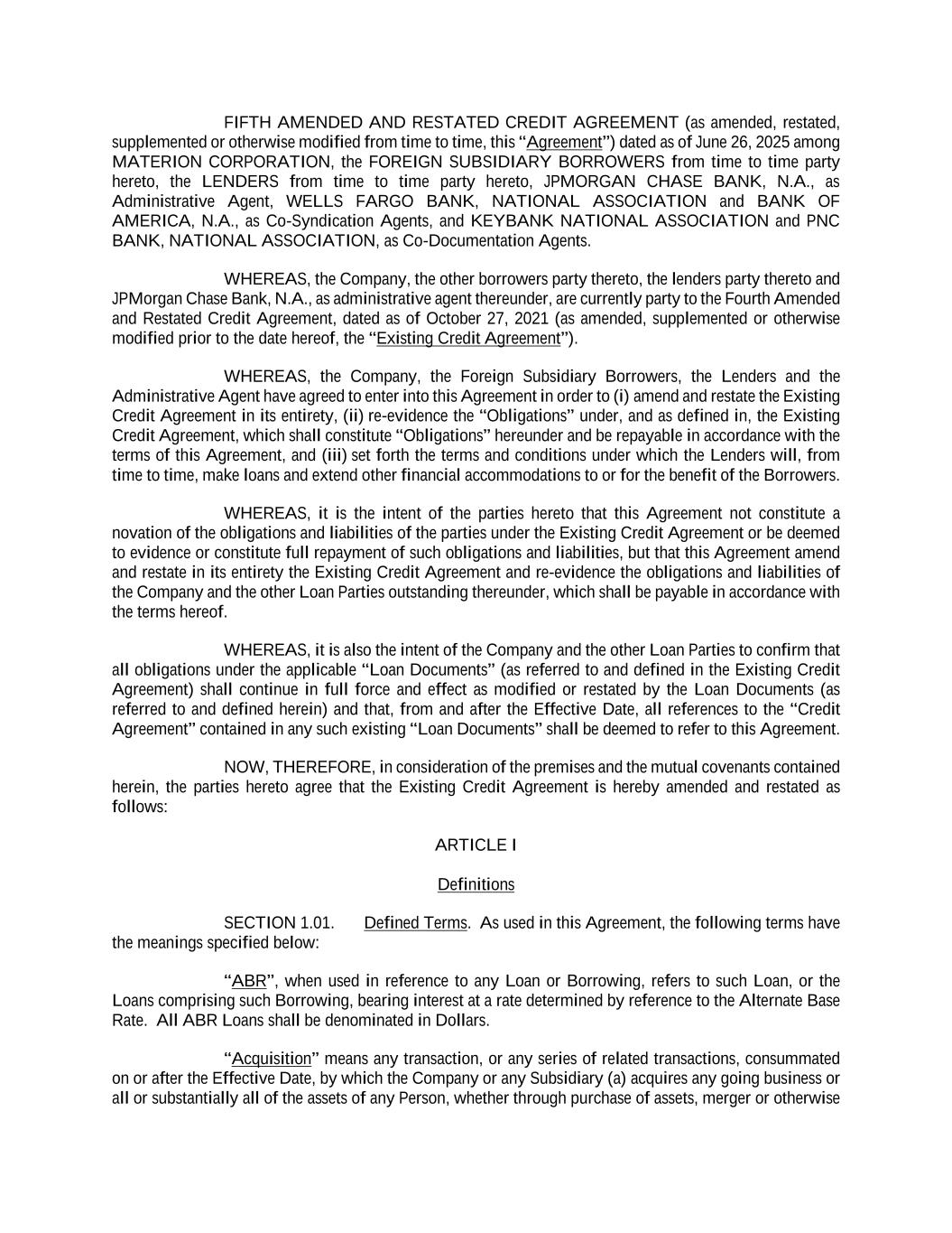 FIFTH AMENDED AND RESTATED CREDIT AGREEMENT (as amended, restated, supplemented or otherwise modified from time to time, this “Agreement”) dated as of June 26, 2025 among MATERION CORPORATION, the FOREIGN SUBSIDIARY BORROWERS from time to time party hereto, the LENDERS from time to time party hereto, JPMORGAN CHASE BANK, N.A., as Administrative Agent, WELLS FARGO BANK, NATIONAL ASSOCIATION and BANK OF AMERICA, N.A., as Co-Syndication Agents, and KEYBANK NATIONAL ASSOCIATION and PNC BANK, NATIONAL ASSOCIATION, as Co-Documentation Agents. WHEREAS, the Company, the other borrowers party thereto, the lenders party thereto and JPMorgan Chase Bank, N.A., as administrative agent thereunder, are currently party to the Fourth Amended and Restated Credit Agreement, dated as of October 27, 2021 (as amended, supplemented or otherwise modified prior to the date hereof, the “Existing Credit Agreement”). WHEREAS, the Company, the Foreign Subsidiary Borrowers, the Lenders and the Administrative Agent have agreed to enter into this Agreement in order to (i) amend and restate the Existing Credit Agreement in its entirety, (ii) re-evidence the “Obligations” under, and as defined in, the Existing Credit Agreement, which shall constitute “Obligations” hereunder and be repayable in accordance with the terms of this Agreement, and (iii) set forth the terms and conditions under which the Lenders will, from time to time, make loans and extend other financial accommodations to or for the benefit of the Borrowers. WHEREAS, it is the intent of the parties hereto that this Agreement not constitute a novation of the obligations and liabilities of the parties under the Existing Credit Agreement or be deemed to evidence or constitute full repayment of such obligations and liabilities, but that this Agreement amend and restate in its entirety the Existing Credit Agreement and re-evidence the obligations and liabilities of the Company and the other Loan Parties outstanding thereunder, which shall be payable in accordance with the terms hereof. WHEREAS, it is also the intent of the Company and the other Loan Parties to confirm that all obligations under the applicable “Loan Documents” (as referred to and defined in the Existing Credit Agreement) shall continue in full force and effect as modified or restated by the Loan Documents (as referred to and defined herein) and that, from and after the Effective Date, all references to the “Credit Agreement” contained in any such existing “Loan Documents” shall be deemed to refer to this Agreement. NOW, THEREFORE, in consideration of the premises and the mutual covenants contained herein, the parties hereto agree that the Existing Credit Agreement is hereby amended and restated as follows: ARTICLE I Definitions SECTION 1.01. Defined Terms. As used in this Agreement, the following terms have the meanings specified below: “ABR”, when used in reference to any Loan or Borrowing, refers to such Loan, or the Loans comprising such Borrowing, bearing interest at a rate determined by reference to the Alternate Base Rate. All ABR Loans shall be denominated in Dollars. “Acquisition” means any transaction, or any series of related transactions, consummated on or after the Effective Date, by which the Company or any Subsidiary (a) acquires any going business or all or substantially all of the assets of any Person, whether through purchase of assets, merger or otherwise