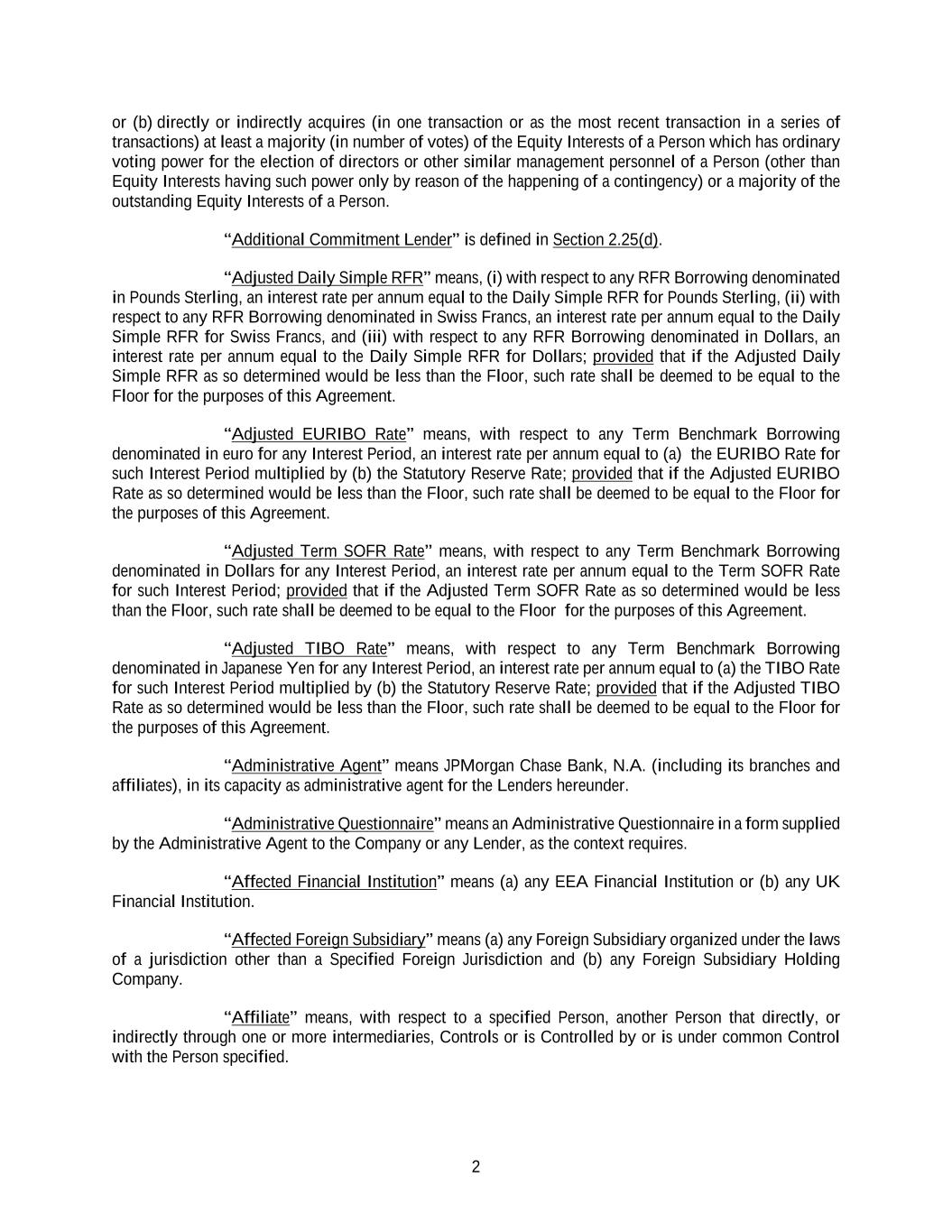 2 or (b) directly or indirectly acquires (in one transaction or as the most recent transaction in a series of transactions) at least a majority (in number of votes) of the Equity Interests of a Person which has ordinary voting power for the election of directors or other similar management personnel of a Person (other than Equity Interests having such power only by reason of the happening of a contingency) or a majority of the outstanding Equity Interests of a Person. “Additional Commitment Lender” is defined in Section 2.25(d). “Adjusted Daily Simple RFR” means, (i) with respect to any RFR Borrowing denominated in Pounds Sterling, an interest rate per annum equal to the Daily Simple RFR for Pounds Sterling, (ii) with respect to any RFR Borrowing denominated in Swiss Francs, an interest rate per annum equal to the Daily Simple RFR for Swiss Francs, and (iii) with respect to any RFR Borrowing denominated in Dollars, an interest rate per annum equal to the Daily Simple RFR for Dollars; provided that if the Adjusted Daily Simple RFR as so determined would be less than the Floor, such rate shall be deemed to be equal to the Floor for the purposes of this Agreement. “Adjusted EURIBO Rate” means, with respect to any Term Benchmark Borrowing denominated in euro for any Interest Period, an interest rate per annum equal to (a) the EURIBO Rate for such Interest Period multiplied by (b) the Statutory Reserve Rate; provided that if the Adjusted EURIBO Rate as so determined would be less than the Floor, such rate shall be deemed to be equal to the Floor for the purposes of this Agreement. “Adjusted Term SOFR Rate” means, with respect to any Term Benchmark Borrowing denominated in Dollars for any Interest Period, an interest rate per annum equal to the Term SOFR Rate for such Interest Period; provided that if the Adjusted Term SOFR Rate as so determined would be less than the Floor, such rate shall be deemed to be equal to the Floor for the purposes of this Agreement. “Adjusted TIBO Rate” means, with respect to any Term Benchmark Borrowing denominated in Japanese Yen for any Interest Period, an interest rate per annum equal to (a) the TIBO Rate for such Interest Period multiplied by (b) the Statutory Reserve Rate; provided that if the Adjusted TIBO Rate as so determined would be less than the Floor, such rate shall be deemed to be equal to the Floor for the purposes of this Agreement. “Administrative Agent” means JPMorgan Chase Bank, N.A. (including its branches and affiliates), in its capacity as administrative agent for the Lenders hereunder. “Administrative Questionnaire” means an Administrative Questionnaire in a form supplied by the Administrative Agent to the Company or any Lender, as the context requires. “Affected Financial Institution” means (a) any EEA Financial Institution or (b) any UK Financial Institution. “Affected Foreign Subsidiary” means (a) any Foreign Subsidiary organized under the laws of a jurisdiction other than a Specified Foreign Jurisdiction and (b) any Foreign Subsidiary Holding Company. “Affiliate” means, with respect to a specified Person, another Person that directly, or indirectly through one or more intermediaries, Controls or is Controlled by or is under common Control with the Person specified.