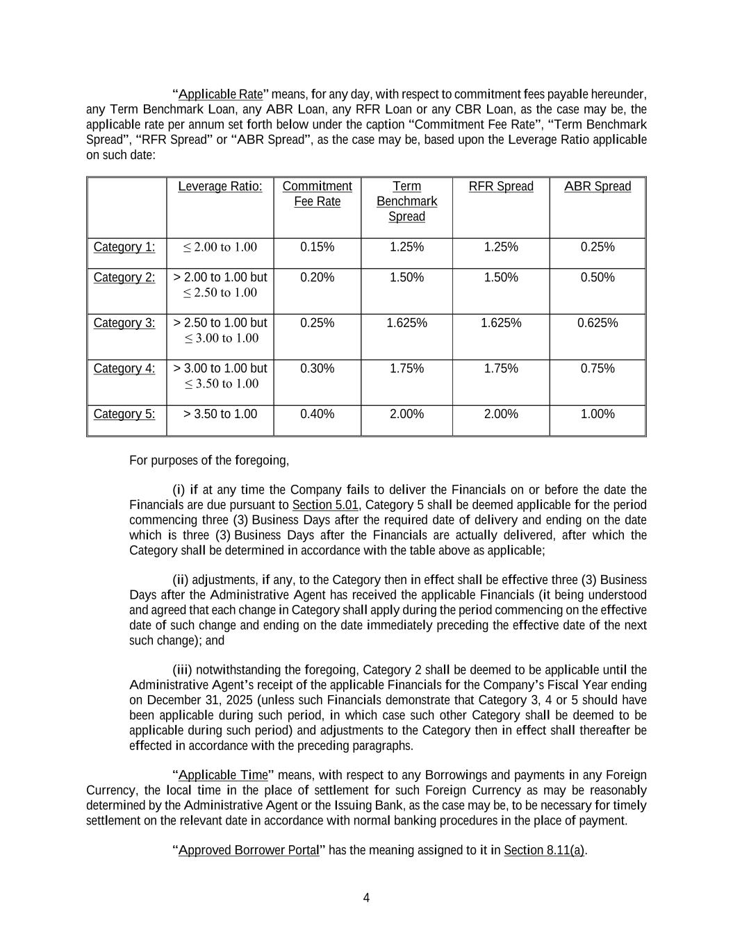 4 “Applicable Rate” means, for any day, with respect to commitment fees payable hereunder, any Term Benchmark Loan, any ABR Loan, any RFR Loan or any CBR Loan, as the case may be, the applicable rate per annum set forth below under the caption “Commitment Fee Rate”, “Term Benchmark Spread”, “RFR Spread” or “ABR Spread”, as the case may be, based upon the Leverage Ratio applicable on such date: Leverage Ratio: Commitment Fee Rate Term Benchmark Spread RFR Spread ABR Spread Category 1: ≤ 2.00 to 1.00 0.15% 1.25% 1.25% 0.25% Category 2: > 2.00 to 1.00 but ≤ 2.50 to 1.00 0.20% 1.50% 1.50% 0.50% Category 3: > 2.50 to 1.00 but ≤ 3.00 to 1.00 0.25% 1.625% 1.625% 0.625% Category 4: > 3.00 to 1.00 but ≤ 3.50 to 1.00 0.30% 1.75% 1.75% 0.75% Category 5: > 3.50 to 1.00 0.40% 2.00% 2.00% 1.00% For purposes of the foregoing, (i) if at any time the Company fails to deliver the Financials on or before the date the Financials are due pursuant to Section 5.01, Category 5 shall be deemed applicable for the period commencing three (3) Business Days after the required date of delivery and ending on the date which is three (3) Business Days after the Financials are actually delivered, after which the Category shall be determined in accordance with the table above as applicable; (ii) adjustments, if any, to the Category then in effect shall be effective three (3) Business Days after the Administrative Agent has received the applicable Financials (it being understood and agreed that each change in Category shall apply during the period commencing on the effective date of such change and ending on the date immediately preceding the effective date of the next such change); and (iii) notwithstanding the foregoing, Category 2 shall be deemed to be applicable until the Administrative Agent’s receipt of the applicable Financials for the Company’s Fiscal Year ending on December 31, 2025 (unless such Financials demonstrate that Category 3, 4 or 5 should have been applicable during such period, in which case such other Category shall be deemed to be applicable during such period) and adjustments to the Category then in effect shall thereafter be effected in accordance with the preceding paragraphs. “Applicable Time” means, with respect to any Borrowings and payments in any Foreign Currency, the local time in the place of settlement for such Foreign Currency as may be reasonably determined by the Administrative Agent or the Issuing Bank, as the case may be, to be necessary for timely settlement on the relevant date in accordance with normal banking procedures in the place of payment. “Approved Borrower Portal” has the meaning assigned to it in Section 8.11(a).