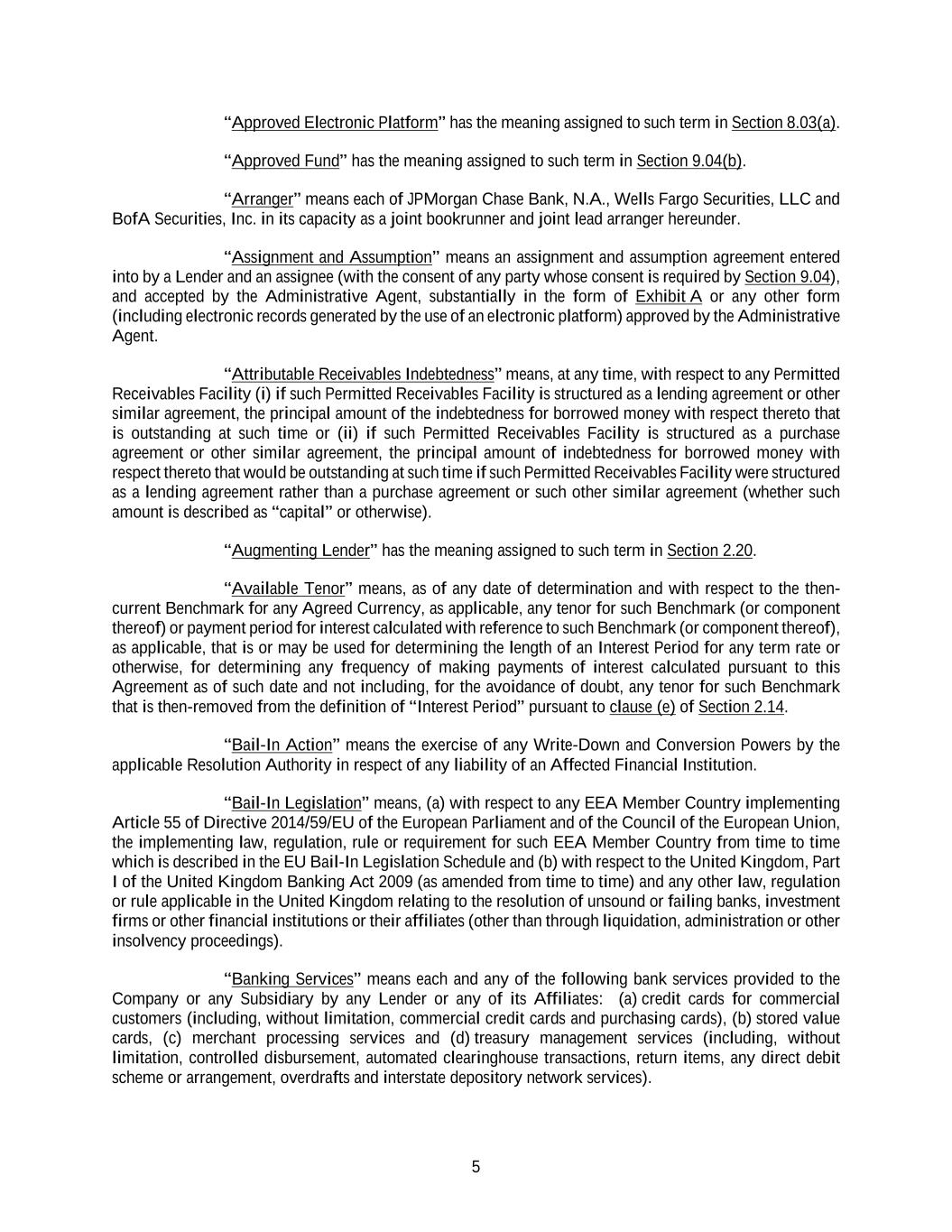 5 “Approved Electronic Platform” has the meaning assigned to such term in Section 8.03(a). “Approved Fund” has the meaning assigned to such term in Section 9.04(b). “Arranger” means each of JPMorgan Chase Bank, N.A., Wells Fargo Securities, LLC and BofA Securities, Inc. in its capacity as a joint bookrunner and joint lead arranger hereunder. “Assignment and Assumption” means an assignment and assumption agreement entered into by a Lender and an assignee (with the consent of any party whose consent is required by Section 9.04), and accepted by the Administrative Agent, substantially in the form of Exhibit A or any other form (including electronic records generated by the use of an electronic platform) approved by the Administrative Agent. “Attributable Receivables Indebtedness” means, at any time, with respect to any Permitted Receivables Facility (i) if such Permitted Receivables Facility is structured as a lending agreement or other similar agreement, the principal amount of the indebtedness for borrowed money with respect thereto that is outstanding at such time or (ii) if such Permitted Receivables Facility is structured as a purchase agreement or other similar agreement, the principal amount of indebtedness for borrowed money with respect thereto that would be outstanding at such time if such Permitted Receivables Facility were structured as a lending agreement rather than a purchase agreement or such other similar agreement (whether such amount is described as “capital” or otherwise). “Augmenting Lender” has the meaning assigned to such term in Section 2.20. “Available Tenor” means, as of any date of determination and with respect to the then- current Benchmark for any Agreed Currency, as applicable, any tenor for such Benchmark (or component thereof) or payment period for interest calculated with reference to such Benchmark (or component thereof), as applicable, that is or may be used for determining the length of an Interest Period for any term rate or otherwise, for determining any frequency of making payments of interest calculated pursuant to this Agreement as of such date and not including, for the avoidance of doubt, any tenor for such Benchmark that is then-removed from the definition of “Interest Period” pursuant to clause (e) of Section 2.14. “Bail-In Action” means the exercise of any Write-Down and Conversion Powers by the applicable Resolution Authority in respect of any liability of an Affected Financial Institution. “Bail-In Legislation” means, (a) with respect to any EEA Member Country implementing Article 55 of Directive 2014/59/EU of the European Parliament and of the Council of the European Union, the implementing law, regulation, rule or requirement for such EEA Member Country from time to time which is described in the EU Bail-In Legislation Schedule and (b) with respect to the United Kingdom, Part I of the United Kingdom Banking Act 2009 (as amended from time to time) and any other law, regulation or rule applicable in the United Kingdom relating to the resolution of unsound or failing banks, investment firms or other financial institutions or their affiliates (other than through liquidation, administration or other insolvency proceedings). “Banking Services” means each and any of the following bank services provided to the Company or any Subsidiary by any Lender or any of its Affiliates: (a) credit cards for commercial customers (including, without limitation, commercial credit cards and purchasing cards), (b) stored value cards, (c) merchant processing services and (d) treasury management services (including, without limitation, controlled disbursement, automated clearinghouse transactions, return items, any direct debit scheme or arrangement, overdrafts and interstate depository network services).