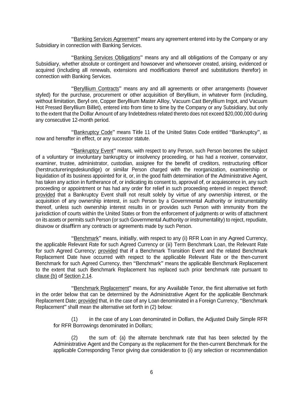 6 “Banking Services Agreement” means any agreement entered into by the Company or any Subsidiary in connection with Banking Services. “Banking Services Obligations” means any and all obligations of the Company or any Subsidiary, whether absolute or contingent and howsoever and whensoever created, arising, evidenced or acquired (including all renewals, extensions and modifications thereof and substitutions therefor) in connection with Banking Services. “Beryllium Contracts” means any and all agreements or other arrangements (however styled) for the purchase, procurement or other acquisition of Beryllium, in whatever form (including, without limitation, Beryl ore, Copper Beryllium Master Alloy, Vacuum Cast Beryllium Ingot, and Vacuum Hot Pressed Beryllium Billet), entered into from time to time by the Company or any Subsidiary, but only to the extent that the Dollar Amount of any Indebtedness related thereto does not exceed $20,000,000 during any consecutive 12-month period. “Bankruptcy Code” means Title 11 of the United States Code entitled “Bankruptcy”, as now and hereafter in effect, or any successor statute. “Bankruptcy Event” means, with respect to any Person, such Person becomes the subject of a voluntary or involuntary bankruptcy or insolvency proceeding, or has had a receiver, conservator, examiner, trustee, administrator, custodian, assignee for the benefit of creditors, restructuring officer (herstructureringsdeskundige) or similar Person charged with the reorganization, examinership or liquidation of its business appointed for it, or, in the good faith determination of the Administrative Agent, has taken any action in furtherance of, or indicating its consent to, approval of, or acquiescence in, any such proceeding or appointment or has had any order for relief in such proceeding entered in respect thereof; provided that a Bankruptcy Event shall not result solely by virtue of any ownership interest, or the acquisition of any ownership interest, in such Person by a Governmental Authority or instrumentality thereof, unless such ownership interest results in or provides such Person with immunity from the jurisdiction of courts within the United States or from the enforcement of judgments or writs of attachment on its assets or permits such Person (or such Governmental Authority or instrumentality) to reject, repudiate, disavow or disaffirm any contracts or agreements made by such Person. “Benchmark” means, initially, with respect to any (i) RFR Loan in any Agreed Currency, the applicable Relevant Rate for such Agreed Currency or (ii) Term Benchmark Loan, the Relevant Rate for such Agreed Currency; provided that if a Benchmark Transition Event and the related Benchmark Replacement Date have occurred with respect to the applicable Relevant Rate or the then-current Benchmark for such Agreed Currency, then “Benchmark” means the applicable Benchmark Replacement to the extent that such Benchmark Replacement has replaced such prior benchmark rate pursuant to clause (b) of Section 2.14. “Benchmark Replacement” means, for any Available Tenor, the first alternative set forth in the order below that can be determined by the Administrative Agent for the applicable Benchmark Replacement Date; provided that, in the case of any Loan denominated in a Foreign Currency, “Benchmark Replacement” shall mean the alternative set forth in (2) below: (1) in the case of any Loan denominated in Dollars, the Adjusted Daily Simple RFR for RFR Borrowings denominated in Dollars; (2) the sum of: (a) the alternate benchmark rate that has been selected by the Administrative Agent and the Company as the replacement for the then-current Benchmark for the applicable Corresponding Tenor giving due consideration to (i) any selection or recommendation