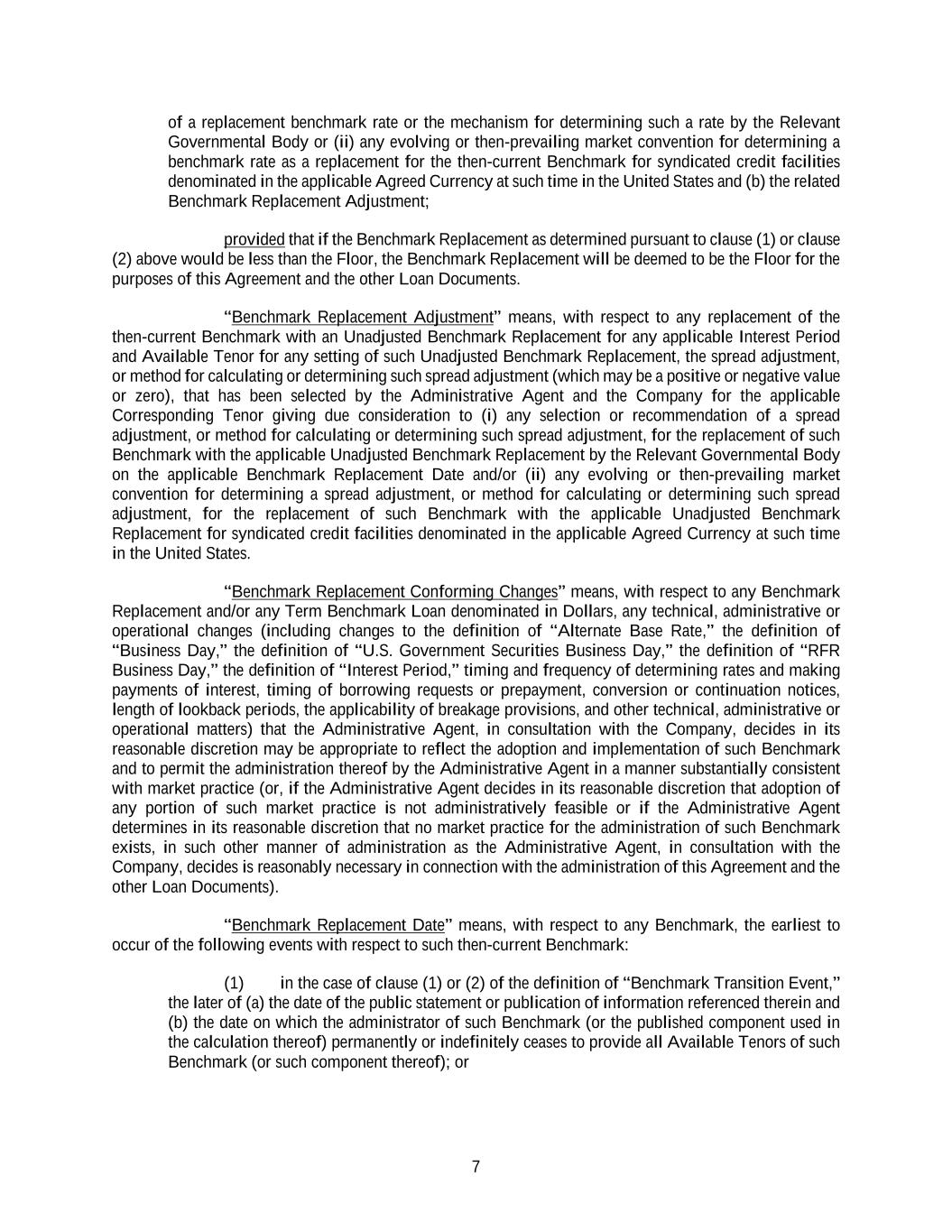 7 of a replacement benchmark rate or the mechanism for determining such a rate by the Relevant Governmental Body or (ii) any evolving or then-prevailing market convention for determining a benchmark rate as a replacement for the then-current Benchmark for syndicated credit facilities denominated in the applicable Agreed Currency at such time in the United States and (b) the related Benchmark Replacement Adjustment; provided that if the Benchmark Replacement as determined pursuant to clause (1) or clause (2) above would be less than the Floor, the Benchmark Replacement will be deemed to be the Floor for the purposes of this Agreement and the other Loan Documents. “Benchmark Replacement Adjustment” means, with respect to any replacement of the then-current Benchmark with an Unadjusted Benchmark Replacement for any applicable Interest Period and Available Tenor for any setting of such Unadjusted Benchmark Replacement, the spread adjustment, or method for calculating or determining such spread adjustment (which may be a positive or negative value or zero), that has been selected by the Administrative Agent and the Company for the applicable Corresponding Tenor giving due consideration to (i) any selection or recommendation of a spread adjustment, or method for calculating or determining such spread adjustment, for the replacement of such Benchmark with the applicable Unadjusted Benchmark Replacement by the Relevant Governmental Body on the applicable Benchmark Replacement Date and/or (ii) any evolving or then-prevailing market convention for determining a spread adjustment, or method for calculating or determining such spread adjustment, for the replacement of such Benchmark with the applicable Unadjusted Benchmark Replacement for syndicated credit facilities denominated in the applicable Agreed Currency at such time in the United States. “Benchmark Replacement Conforming Changes” means, with respect to any Benchmark Replacement and/or any Term Benchmark Loan denominated in Dollars, any technical, administrative or operational changes (including changes to the definition of “Alternate Base Rate,” the definition of “Business Day,” the definition of “U.S. Government Securities Business Day,” the definition of “RFR Business Day,” the definition of “Interest Period,” timing and frequency of determining rates and making payments of interest, timing of borrowing requests or prepayment, conversion or continuation notices, length of lookback periods, the applicability of breakage provisions, and other technical, administrative or operational matters) that the Administrative Agent, in consultation with the Company, decides in its reasonable discretion may be appropriate to reflect the adoption and implementation of such Benchmark and to permit the administration thereof by the Administrative Agent in a manner substantially consistent with market practice (or, if the Administrative Agent decides in its reasonable discretion that adoption of any portion of such market practice is not administratively feasible or if the Administrative Agent determines in its reasonable discretion that no market practice for the administration of such Benchmark exists, in such other manner of administration as the Administrative Agent, in consultation with the Company, decides is reasonably necessary in connection with the administration of this Agreement and the other Loan Documents). “Benchmark Replacement Date” means, with respect to any Benchmark, the earliest to occur of the following events with respect to such then-current Benchmark: (1) in the case of clause (1) or (2) of the definition of “Benchmark Transition Event,” the later of (a) the date of the public statement or publication of information referenced therein and (b) the date on which the administrator of such Benchmark (or the published component used in the calculation thereof) permanently or indefinitely ceases to provide all Available Tenors of such Benchmark (or such component thereof); or