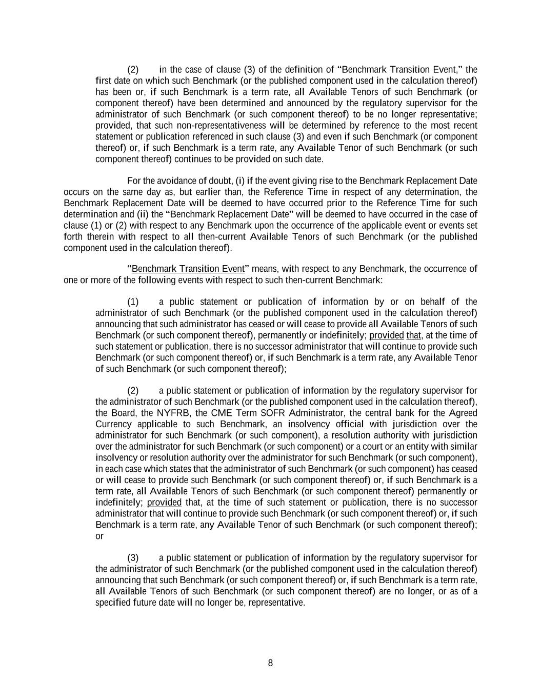 8 (2) in the case of clause (3) of the definition of “Benchmark Transition Event,” the first date on which such Benchmark (or the published component used in the calculation thereof) has been or, if such Benchmark is a term rate, all Available Tenors of such Benchmark (or component thereof) have been determined and announced by the regulatory supervisor for the administrator of such Benchmark (or such component thereof) to be no longer representative; provided, that such non-representativeness will be determined by reference to the most recent statement or publication referenced in such clause (3) and even if such Benchmark (or component thereof) or, if such Benchmark is a term rate, any Available Tenor of such Benchmark (or such component thereof) continues to be provided on such date. For the avoidance of doubt, (i) if the event giving rise to the Benchmark Replacement Date occurs on the same day as, but earlier than, the Reference Time in respect of any determination, the Benchmark Replacement Date will be deemed to have occurred prior to the Reference Time for such determination and (ii) the “Benchmark Replacement Date” will be deemed to have occurred in the case of clause (1) or (2) with respect to any Benchmark upon the occurrence of the applicable event or events set forth therein with respect to all then-current Available Tenors of such Benchmark (or the published component used in the calculation thereof). “Benchmark Transition Event” means, with respect to any Benchmark, the occurrence of one or more of the following events with respect to such then-current Benchmark: (1) a public statement or publication of information by or on behalf of the administrator of such Benchmark (or the published component used in the calculation thereof) announcing that such administrator has ceased or will cease to provide all Available Tenors of such Benchmark (or such component thereof), permanently or indefinitely; provided that, at the time of such statement or publication, there is no successor administrator that will continue to provide such Benchmark (or such component thereof) or, if such Benchmark is a term rate, any Available Tenor of such Benchmark (or such component thereof); (2) a public statement or publication of information by the regulatory supervisor for the administrator of such Benchmark (or the published component used in the calculation thereof), the Board, the NYFRB, the CME Term SOFR Administrator, the central bank for the Agreed Currency applicable to such Benchmark, an insolvency official with jurisdiction over the administrator for such Benchmark (or such component), a resolution authority with jurisdiction over the administrator for such Benchmark (or such component) or a court or an entity with similar insolvency or resolution authority over the administrator for such Benchmark (or such component), in each case which states that the administrator of such Benchmark (or such component) has ceased or will cease to provide such Benchmark (or such component thereof) or, if such Benchmark is a term rate, all Available Tenors of such Benchmark (or such component thereof) permanently or indefinitely; provided that, at the time of such statement or publication, there is no successor administrator that will continue to provide such Benchmark (or such component thereof) or, if such Benchmark is a term rate, any Available Tenor of such Benchmark (or such component thereof); or (3) a public statement or publication of information by the regulatory supervisor for the administrator of such Benchmark (or the published component used in the calculation thereof) announcing that such Benchmark (or such component thereof) or, if such Benchmark is a term rate, all Available Tenors of such Benchmark (or such component thereof) are no longer, or as of a specified future date will no longer be, representative.