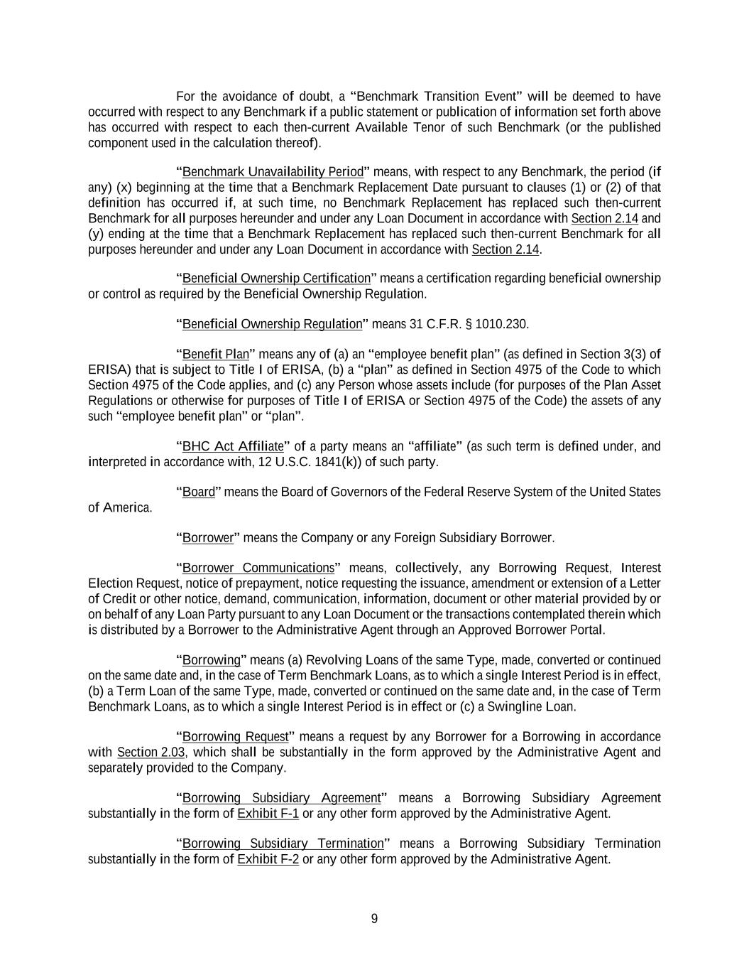 9 For the avoidance of doubt, a “Benchmark Transition Event” will be deemed to have occurred with respect to any Benchmark if a public statement or publication of information set forth above has occurred with respect to each then-current Available Tenor of such Benchmark (or the published component used in the calculation thereof). “Benchmark Unavailability Period” means, with respect to any Benchmark, the period (if any) (x) beginning at the time that a Benchmark Replacement Date pursuant to clauses (1) or (2) of that definition has occurred if, at such time, no Benchmark Replacement has replaced such then-current Benchmark for all purposes hereunder and under any Loan Document in accordance with Section 2.14 and (y) ending at the time that a Benchmark Replacement has replaced such then-current Benchmark for all purposes hereunder and under any Loan Document in accordance with Section 2.14. “Beneficial Ownership Certification” means a certification regarding beneficial ownership or control as required by the Beneficial Ownership Regulation. “Beneficial Ownership Regulation” means 31 C.F.R. § 1010.230. “Benefit Plan” means any of (a) an “employee benefit plan” (as defined in Section 3(3) of ERISA) that is subject to Title I of ERISA, (b) a “plan” as defined in Section 4975 of the Code to which Section 4975 of the Code applies, and (c) any Person whose assets include (for purposes of the Plan Asset Regulations or otherwise for purposes of Title I of ERISA or Section 4975 of the Code) the assets of any such “employee benefit plan” or “plan”. “BHC Act Affiliate” of a party means an “affiliate” (as such term is defined under, and interpreted in accordance with, 12 U.S.C. 1841(k)) of such party. “Board” means the Board of Governors of the Federal Reserve System of the United States of America. “Borrower” means the Company or any Foreign Subsidiary Borrower. “Borrower Communications” means, collectively, any Borrowing Request, Interest Election Request, notice of prepayment, notice requesting the issuance, amendment or extension of a Letter of Credit or other notice, demand, communication, information, document or other material provided by or on behalf of any Loan Party pursuant to any Loan Document or the transactions contemplated therein which is distributed by a Borrower to the Administrative Agent through an Approved Borrower Portal. “Borrowing” means (a) Revolving Loans of the same Type, made, converted or continued on the same date and, in the case of Term Benchmark Loans, as to which a single Interest Period is in effect, (b) a Term Loan of the same Type, made, converted or continued on the same date and, in the case of Term Benchmark Loans, as to which a single Interest Period is in effect or (c) a Swingline Loan. “Borrowing Request” means a request by any Borrower for a Borrowing in accordance with Section 2.03, which shall be substantially in the form approved by the Administrative Agent and separately provided to the Company. “Borrowing Subsidiary Agreement” means a Borrowing Subsidiary Agreement substantially in the form of Exhibit F-1 or any other form approved by the Administrative Agent. “Borrowing Subsidiary Termination” means a Borrowing Subsidiary Termination substantially in the form of Exhibit F-2 or any other form approved by the Administrative Agent.