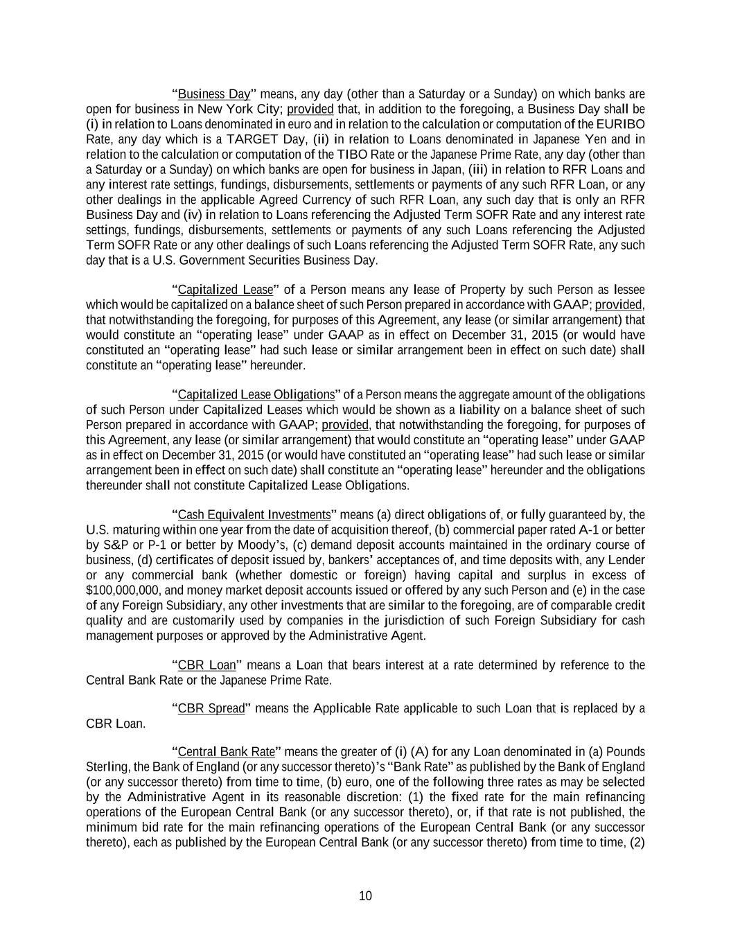 10 “Business Day” means, any day (other than a Saturday or a Sunday) on which banks are open for business in New York City; provided that, in addition to the foregoing, a Business Day shall be (i) in relation to Loans denominated in euro and in relation to the calculation or computation of the EURIBO Rate, any day which is a TARGET Day, (ii) in relation to Loans denominated in Japanese Yen and in relation to the calculation or computation of the TIBO Rate or the Japanese Prime Rate, any day (other than a Saturday or a Sunday) on which banks are open for business in Japan, (iii) in relation to RFR Loans and any interest rate settings, fundings, disbursements, settlements or payments of any such RFR Loan, or any other dealings in the applicable Agreed Currency of such RFR Loan, any such day that is only an RFR Business Day and (iv) in relation to Loans referencing the Adjusted Term SOFR Rate and any interest rate settings, fundings, disbursements, settlements or payments of any such Loans referencing the Adjusted Term SOFR Rate or any other dealings of such Loans referencing the Adjusted Term SOFR Rate, any such day that is a U.S. Government Securities Business Day. “Capitalized Lease” of a Person means any lease of Property by such Person as lessee which would be capitalized on a balance sheet of such Person prepared in accordance with GAAP; provided, that notwithstanding the foregoing, for purposes of this Agreement, any lease (or similar arrangement) that would constitute an “operating lease” under GAAP as in effect on December 31, 2015 (or would have constituted an “operating lease” had such lease or similar arrangement been in effect on such date) shall constitute an “operating lease” hereunder. “Capitalized Lease Obligations” of a Person means the aggregate amount of the obligations of such Person under Capitalized Leases which would be shown as a liability on a balance sheet of such Person prepared in accordance with GAAP; provided, that notwithstanding the foregoing, for purposes of this Agreement, any lease (or similar arrangement) that would constitute an “operating lease” under GAAP as in effect on December 31, 2015 (or would have constituted an “operating lease” had such lease or similar arrangement been in effect on such date) shall constitute an “operating lease” hereunder and the obligations thereunder shall not constitute Capitalized Lease Obligations. “Cash Equivalent Investments” means (a) direct obligations of, or fully guaranteed by, the U.S. maturing within one year from the date of acquisition thereof, (b) commercial paper rated A-1 or better by S&P or P-1 or better by Moody’s, (c) demand deposit accounts maintained in the ordinary course of business, (d) certificates of deposit issued by, bankers’ acceptances of, and time deposits with, any Lender or any commercial bank (whether domestic or foreign) having capital and surplus in excess of $100,000,000, and money market deposit accounts issued or offered by any such Person and (e) in the case of any Foreign Subsidiary, any other investments that are similar to the foregoing, are of comparable credit quality and are customarily used by companies in the jurisdiction of such Foreign Subsidiary for cash management purposes or approved by the Administrative Agent. “CBR Loan” means a Loan that bears interest at a rate determined by reference to the Central Bank Rate or the Japanese Prime Rate. “CBR Spread” means the Applicable Rate applicable to such Loan that is replaced by a CBR Loan. “Central Bank Rate” means the greater of (i) (A) for any Loan denominated in (a) Pounds Sterling, the Bank of England (or any successor thereto)’s “Bank Rate” as published by the Bank of England (or any successor thereto) from time to time, (b) euro, one of the following three rates as may be selected by the Administrative Agent in its reasonable discretion: (1) the fixed rate for the main refinancing operations of the European Central Bank (or any successor thereto), or, if that rate is not published, the minimum bid rate for the main refinancing operations of the European Central Bank (or any successor thereto), each as published by the European Central Bank (or any successor thereto) from time to time, (2)