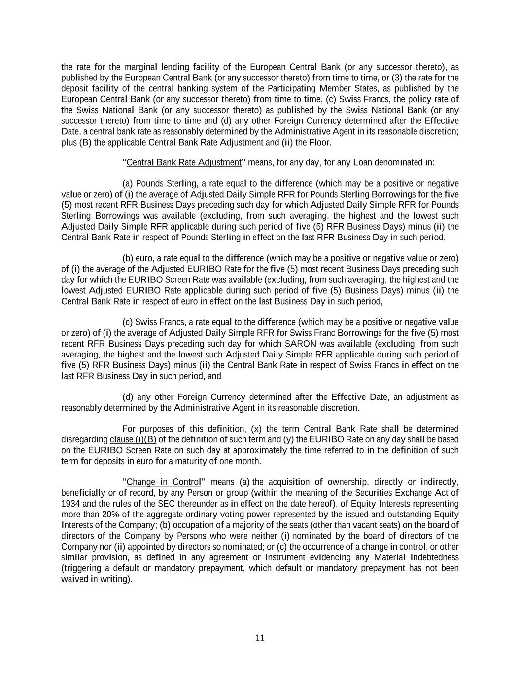 11 the rate for the marginal lending facility of the European Central Bank (or any successor thereto), as published by the European Central Bank (or any successor thereto) from time to time, or (3) the rate for the deposit facility of the central banking system of the Participating Member States, as published by the European Central Bank (or any successor thereto) from time to time, (c) Swiss Francs, the policy rate of the Swiss National Bank (or any successor thereto) as published by the Swiss National Bank (or any successor thereto) from time to time and (d) any other Foreign Currency determined after the Effective Date, a central bank rate as reasonably determined by the Administrative Agent in its reasonable discretion; plus (B) the applicable Central Bank Rate Adjustment and (ii) the Floor. “Central Bank Rate Adjustment” means, for any day, for any Loan denominated in: (a) Pounds Sterling, a rate equal to the difference (which may be a positive or negative value or zero) of (i) the average of Adjusted Daily Simple RFR for Pounds Sterling Borrowings for the five (5) most recent RFR Business Days preceding such day for which Adjusted Daily Simple RFR for Pounds Sterling Borrowings was available (excluding, from such averaging, the highest and the lowest such Adjusted Daily Simple RFR applicable during such period of five (5) RFR Business Days) minus (ii) the Central Bank Rate in respect of Pounds Sterling in effect on the last RFR Business Day in such period, (b) euro, a rate equal to the difference (which may be a positive or negative value or zero) of (i) the average of the Adjusted EURIBO Rate for the five (5) most recent Business Days preceding such day for which the EURIBO Screen Rate was available (excluding, from such averaging, the highest and the lowest Adjusted EURIBO Rate applicable during such period of five (5) Business Days) minus (ii) the Central Bank Rate in respect of euro in effect on the last Business Day in such period, (c) Swiss Francs, a rate equal to the difference (which may be a positive or negative value or zero) of (i) the average of Adjusted Daily Simple RFR for Swiss Franc Borrowings for the five (5) most recent RFR Business Days preceding such day for which SARON was available (excluding, from such averaging, the highest and the lowest such Adjusted Daily Simple RFR applicable during such period of five (5) RFR Business Days) minus (ii) the Central Bank Rate in respect of Swiss Francs in effect on the last RFR Business Day in such period, and (d) any other Foreign Currency determined after the Effective Date, an adjustment as reasonably determined by the Administrative Agent in its reasonable discretion. For purposes of this definition, (x) the term Central Bank Rate shall be determined disregarding clause (i)(B) of the definition of such term and (y) the EURIBO Rate on any day shall be based on the EURIBO Screen Rate on such day at approximately the time referred to in the definition of such term for deposits in euro for a maturity of one month. “Change in Control” means (a) the acquisition of ownership, directly or indirectly, beneficially or of record, by any Person or group (within the meaning of the Securities Exchange Act of 1934 and the rules of the SEC thereunder as in effect on the date hereof), of Equity Interests representing more than 20% of the aggregate ordinary voting power represented by the issued and outstanding Equity Interests of the Company; (b) occupation of a majority of the seats (other than vacant seats) on the board of directors of the Company by Persons who were neither (i) nominated by the board of directors of the Company nor (ii) appointed by directors so nominated; or (c) the occurrence of a change in control, or other similar provision, as defined in any agreement or instrument evidencing any Material Indebtedness (triggering a default or mandatory prepayment, which default or mandatory prepayment has not been waived in writing).