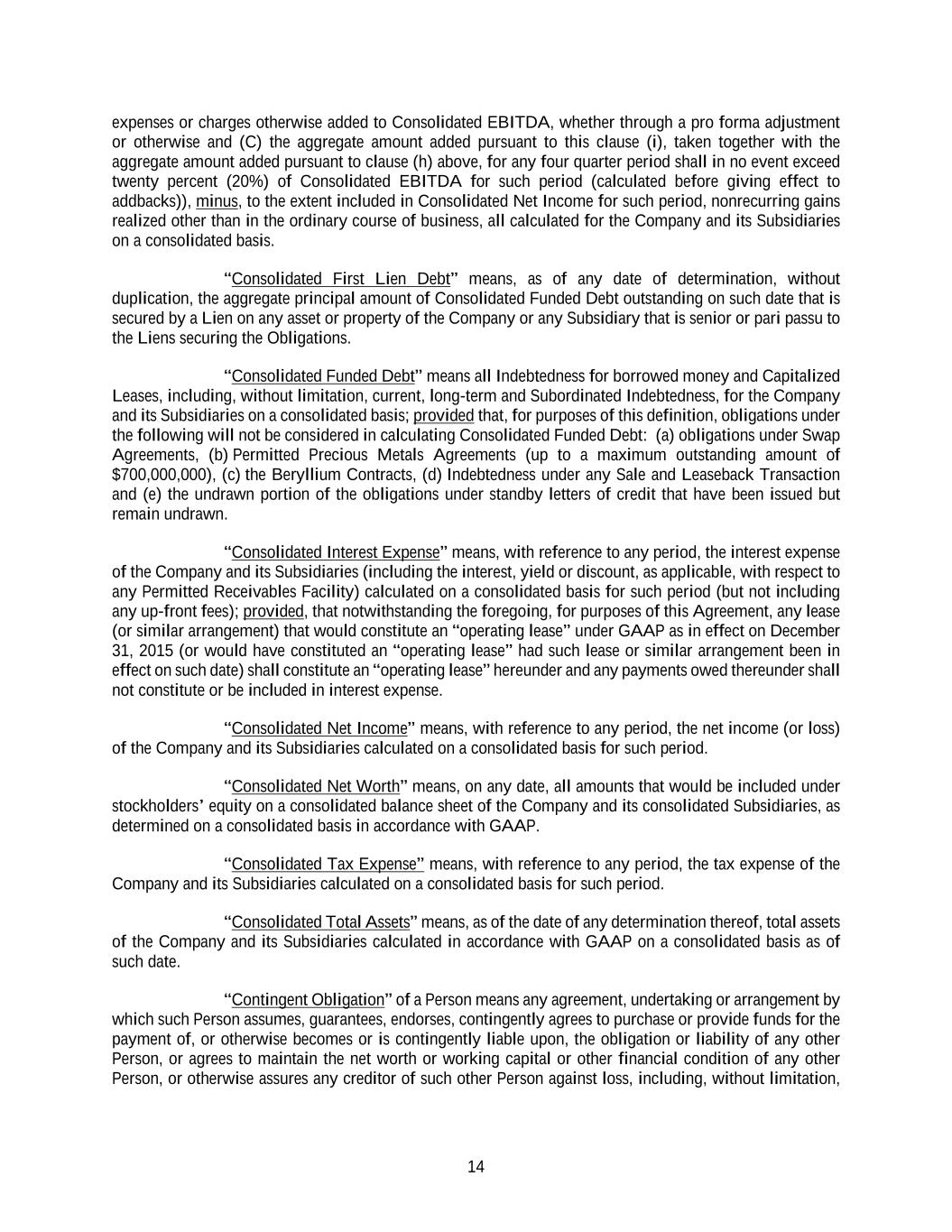 14 expenses or charges otherwise added to Consolidated EBITDA, whether through a pro forma adjustment or otherwise and (C) the aggregate amount added pursuant to this clause (i), taken together with the aggregate amount added pursuant to clause (h) above, for any four quarter period shall in no event exceed twenty percent (20%) of Consolidated EBITDA for such period (calculated before giving effect to addbacks)), minus, to the extent included in Consolidated Net Income for such period, nonrecurring gains realized other than in the ordinary course of business, all calculated for the Company and its Subsidiaries on a consolidated basis. “Consolidated First Lien Debt” means, as of any date of determination, without duplication, the aggregate principal amount of Consolidated Funded Debt outstanding on such date that is secured by a Lien on any asset or property of the Company or any Subsidiary that is senior or pari passu to the Liens securing the Obligations. “Consolidated Funded Debt” means all Indebtedness for borrowed money and Capitalized Leases, including, without limitation, current, long-term and Subordinated Indebtedness, for the Company and its Subsidiaries on a consolidated basis; provided that, for purposes of this definition, obligations under the following will not be considered in calculating Consolidated Funded Debt: (a) obligations under Swap Agreements, (b) Permitted Precious Metals Agreements (up to a maximum outstanding amount of $700,000,000), (c) the Beryllium Contracts, (d) Indebtedness under any Sale and Leaseback Transaction and (e) the undrawn portion of the obligations under standby letters of credit that have been issued but remain undrawn. “Consolidated Interest Expense” means, with reference to any period, the interest expense of the Company and its Subsidiaries (including the interest, yield or discount, as applicable, with respect to any Permitted Receivables Facility) calculated on a consolidated basis for such period (but not including any up-front fees); provided, that notwithstanding the foregoing, for purposes of this Agreement, any lease (or similar arrangement) that would constitute an “operating lease” under GAAP as in effect on December 31, 2015 (or would have constituted an “operating lease” had such lease or similar arrangement been in effect on such date) shall constitute an “operating lease” hereunder and any payments owed thereunder shall not constitute or be included in interest expense. “Consolidated Net Income” means, with reference to any period, the net income (or loss) of the Company and its Subsidiaries calculated on a consolidated basis for such period. “Consolidated Net Worth” means, on any date, all amounts that would be included under stockholders’ equity on a consolidated balance sheet of the Company and its consolidated Subsidiaries, as determined on a consolidated basis in accordance with GAAP. “Consolidated Tax Expense” means, with reference to any period, the tax expense of the Company and its Subsidiaries calculated on a consolidated basis for such period. “Consolidated Total Assets” means, as of the date of any determination thereof, total assets of the Company and its Subsidiaries calculated in accordance with GAAP on a consolidated basis as of such date. “Contingent Obligation” of a Person means any agreement, undertaking or arrangement by which such Person assumes, guarantees, endorses, contingently agrees to purchase or provide funds for the payment of, or otherwise becomes or is contingently liable upon, the obligation or liability of any other Person, or agrees to maintain the net worth or working capital or other financial condition of any other Person, or otherwise assures any creditor of such other Person against loss, including, without limitation,