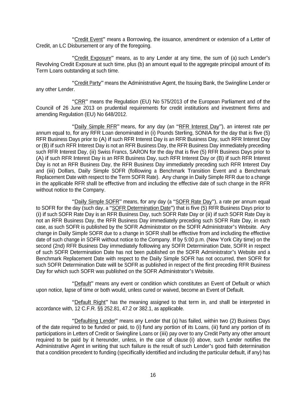 16 “Credit Event” means a Borrowing, the issuance, amendment or extension of a Letter of Credit, an LC Disbursement or any of the foregoing. “Credit Exposure” means, as to any Lender at any time, the sum of (a) such Lender’s Revolving Credit Exposure at such time, plus (b) an amount equal to the aggregate principal amount of its Term Loans outstanding at such time. “Credit Party” means the Administrative Agent, the Issuing Bank, the Swingline Lender or any other Lender. “CRR” means the Regulation (EU) No 575/2013 of the European Parliament and of the Council of 26 June 2013 on prudential requirements for credit institutions and investment firms and amending Regulation (EU) No 648/2012. “Daily Simple RFR” means, for any day (an “RFR Interest Day”), an interest rate per annum equal to, for any RFR Loan denominated in (i) Pounds Sterling, SONIA for the day that is five (5) RFR Business Days prior to (A) if such RFR Interest Day is an RFR Business Day, such RFR Interest Day or (B) if such RFR Interest Day is not an RFR Business Day, the RFR Business Day immediately preceding such RFR Interest Day, (ii) Swiss Francs, SARON for the day that is five (5) RFR Business Days prior to (A) if such RFR Interest Day is an RFR Business Day, such RFR Interest Day or (B) if such RFR Interest Day is not an RFR Business Day, the RFR Business Day immediately preceding such RFR Interest Day and (iii) Dollars, Daily Simple SOFR (following a Benchmark Transition Event and a Benchmark Replacement Date with respect to the Term SOFR Rate). Any change in Daily Simple RFR due to a change in the applicable RFR shall be effective from and including the effective date of such change in the RFR without notice to the Company. “Daily Simple SOFR” means, for any day (a “SOFR Rate Day”), a rate per annum equal to SOFR for the day (such day, a “SOFR Determination Date”) that is five (5) RFR Business Days prior to (i) if such SOFR Rate Day is an RFR Business Day, such SOFR Rate Day or (ii) if such SOFR Rate Day is not an RFR Business Day, the RFR Business Day immediately preceding such SOFR Rate Day, in each case, as such SOFR is published by the SOFR Administrator on the SOFR Administrator’s Website. Any change in Daily Simple SOFR due to a change in SOFR shall be effective from and including the effective date of such change in SOFR without notice to the Company. If by 5:00 p.m. (New York City time) on the second (2nd) RFR Business Day immediately following any SOFR Determination Date, SOFR in respect of such SOFR Determination Date has not been published on the SOFR Administrator’s Website and a Benchmark Replacement Date with respect to the Daily Simple SOFR has not occurred, then SOFR for such SOFR Determination Date will be SOFR as published in respect of the first preceding RFR Business Day for which such SOFR was published on the SOFR Administrator’s Website. “Default” means any event or condition which constitutes an Event of Default or which upon notice, lapse of time or both would, unless cured or waived, become an Event of Default. “Default Right” has the meaning assigned to that term in, and shall be interpreted in accordance with, 12 C.F.R. §§ 252.81, 47.2 or 382.1, as applicable. “Defaulting Lender” means any Lender that (a) has failed, within two (2) Business Days of the date required to be funded or paid, to (i) fund any portion of its Loans, (ii) fund any portion of its participations in Letters of Credit or Swingline Loans or (iii) pay over to any Credit Party any other amount required to be paid by it hereunder, unless, in the case of clause (i) above, such Lender notifies the Administrative Agent in writing that such failure is the result of such Lender’s good faith determination that a condition precedent to funding (specifically identified and including the particular default, if any) has