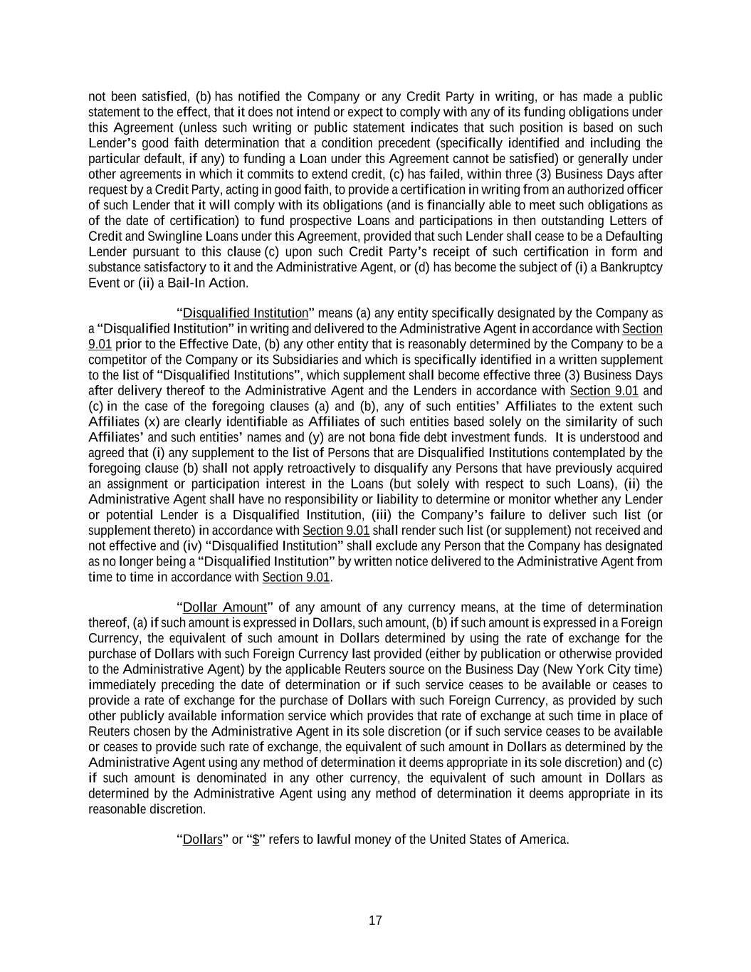 17 not been satisfied, (b) has notified the Company or any Credit Party in writing, or has made a public statement to the effect, that it does not intend or expect to comply with any of its funding obligations under this Agreement (unless such writing or public statement indicates that such position is based on such Lender’s good faith determination that a condition precedent (specifically identified and including the particular default, if any) to funding a Loan under this Agreement cannot be satisfied) or generally under other agreements in which it commits to extend credit, (c) has failed, within three (3) Business Days after request by a Credit Party, acting in good faith, to provide a certification in writing from an authorized officer of such Lender that it will comply with its obligations (and is financially able to meet such obligations as of the date of certification) to fund prospective Loans and participations in then outstanding Letters of Credit and Swingline Loans under this Agreement, provided that such Lender shall cease to be a Defaulting Lender pursuant to this clause (c) upon such Credit Party’s receipt of such certification in form and substance satisfactory to it and the Administrative Agent, or (d) has become the subject of (i) a Bankruptcy Event or (ii) a Bail-In Action. “Disqualified Institution” means (a) any entity specifically designated by the Company as a “Disqualified Institution” in writing and delivered to the Administrative Agent in accordance with Section 9.01 prior to the Effective Date, (b) any other entity that is reasonably determined by the Company to be a competitor of the Company or its Subsidiaries and which is specifically identified in a written supplement to the list of “Disqualified Institutions”, which supplement shall become effective three (3) Business Days after delivery thereof to the Administrative Agent and the Lenders in accordance with Section 9.01 and (c) in the case of the foregoing clauses (a) and (b), any of such entities’ Affiliates to the extent such Affiliates (x) are clearly identifiable as Affiliates of such entities based solely on the similarity of such Affiliates’ and such entities’ names and (y) are not bona fide debt investment funds. It is understood and agreed that (i) any supplement to the list of Persons that are Disqualified Institutions contemplated by the foregoing clause (b) shall not apply retroactively to disqualify any Persons that have previously acquired an assignment or participation interest in the Loans (but solely with respect to such Loans), (ii) the Administrative Agent shall have no responsibility or liability to determine or monitor whether any Lender or potential Lender is a Disqualified Institution, (iii) the Company’s failure to deliver such list (or supplement thereto) in accordance with Section 9.01 shall render such list (or supplement) not received and not effective and (iv) “Disqualified Institution” shall exclude any Person that the Company has designated as no longer being a “Disqualified Institution” by written notice delivered to the Administrative Agent from time to time in accordance with Section 9.01. “Dollar Amount” of any amount of any currency means, at the time of determination thereof, (a) if such amount is expressed in Dollars, such amount, (b) if such amount is expressed in a Foreign Currency, the equivalent of such amount in Dollars determined by using the rate of exchange for the purchase of Dollars with such Foreign Currency last provided (either by publication or otherwise provided to the Administrative Agent) by the applicable Reuters source on the Business Day (New York City time) immediately preceding the date of determination or if such service ceases to be available or ceases to provide a rate of exchange for the purchase of Dollars with such Foreign Currency, as provided by such other publicly available information service which provides that rate of exchange at such time in place of Reuters chosen by the Administrative Agent in its sole discretion (or if such service ceases to be available or ceases to provide such rate of exchange, the equivalent of such amount in Dollars as determined by the Administrative Agent using any method of determination it deems appropriate in its sole discretion) and (c) if such amount is denominated in any other currency, the equivalent of such amount in Dollars as determined by the Administrative Agent using any method of determination it deems appropriate in its reasonable discretion. “Dollars” or “$” refers to lawful money of the United States of America.