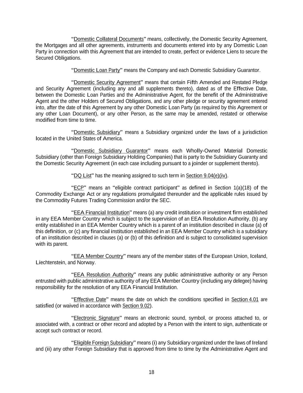 18 “Domestic Collateral Documents” means, collectively, the Domestic Security Agreement, the Mortgages and all other agreements, instruments and documents entered into by any Domestic Loan Party in connection with this Agreement that are intended to create, perfect or evidence Liens to secure the Secured Obligations. “Domestic Loan Party” means the Company and each Domestic Subsidiary Guarantor. “Domestic Security Agreement” means that certain Fifth Amended and Restated Pledge and Security Agreement (including any and all supplements thereto), dated as of the Effective Date, between the Domestic Loan Parties and the Administrative Agent, for the benefit of the Administrative Agent and the other Holders of Secured Obligations, and any other pledge or security agreement entered into, after the date of this Agreement by any other Domestic Loan Party (as required by this Agreement or any other Loan Document), or any other Person, as the same may be amended, restated or otherwise modified from time to time. “Domestic Subsidiary” means a Subsidiary organized under the laws of a jurisdiction located in the United States of America. “Domestic Subsidiary Guarantor” means each Wholly-Owned Material Domestic Subsidiary (other than Foreign Subsidiary Holding Companies) that is party to the Subsidiary Guaranty and the Domestic Security Agreement (in each case including pursuant to a joinder or supplement thereto). “DQ List” has the meaning assigned to such term in Section 9.04(e)(iv). “ECP” means an “eligible contract participant” as defined in Section 1(a)(18) of the Commodity Exchange Act or any regulations promulgated thereunder and the applicable rules issued by the Commodity Futures Trading Commission and/or the SEC. “EEA Financial Institution” means (a) any credit institution or investment firm established in any EEA Member Country which is subject to the supervision of an EEA Resolution Authority, (b) any entity established in an EEA Member Country which is a parent of an institution described in clause (a) of this definition, or (c) any financial institution established in an EEA Member Country which is a subsidiary of an institution described in clauses (a) or (b) of this definition and is subject to consolidated supervision with its parent. “EEA Member Country” means any of the member states of the European Union, Iceland, Liechtenstein, and Norway. “EEA Resolution Authority” means any public administrative authority or any Person entrusted with public administrative authority of any EEA Member Country (including any delegee) having responsibility for the resolution of any EEA Financial Institution. “Effective Date” means the date on which the conditions specified in Section 4.01 are satisfied (or waived in accordance with Section 9.02). “Electronic Signature” means an electronic sound, symbol, or process attached to, or associated with, a contract or other record and adopted by a Person with the intent to sign, authenticate or accept such contract or record. “Eligible Foreign Subsidiary” means (i) any Subsidiary organized under the laws of Ireland and (ii) any other Foreign Subsidiary that is approved from time to time by the Administrative Agent and