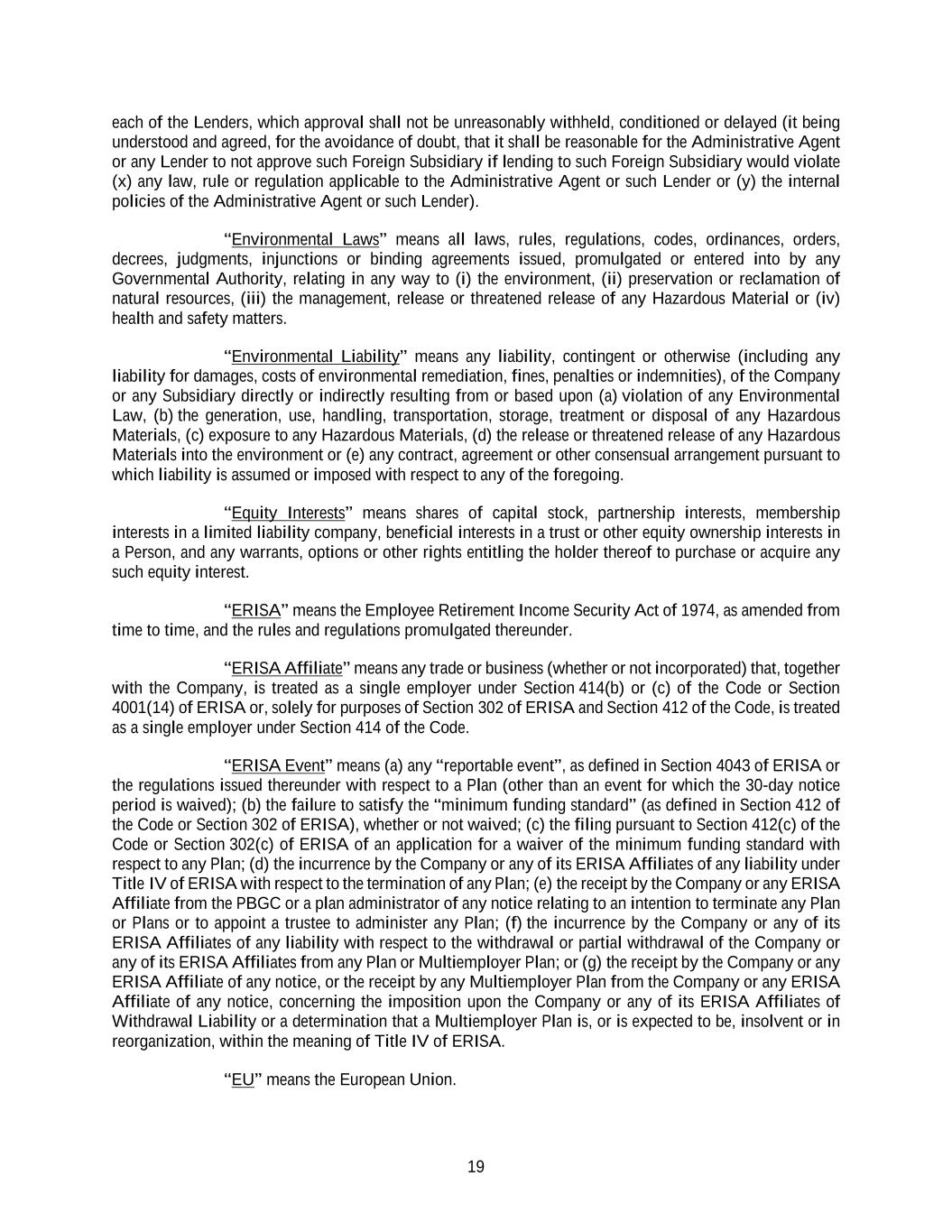 19 each of the Lenders, which approval shall not be unreasonably withheld, conditioned or delayed (it being understood and agreed, for the avoidance of doubt, that it shall be reasonable for the Administrative Agent or any Lender to not approve such Foreign Subsidiary if lending to such Foreign Subsidiary would violate (x) any law, rule or regulation applicable to the Administrative Agent or such Lender or (y) the internal policies of the Administrative Agent or such Lender). “Environmental Laws” means all laws, rules, regulations, codes, ordinances, orders, decrees, judgments, injunctions or binding agreements issued, promulgated or entered into by any Governmental Authority, relating in any way to (i) the environment, (ii) preservation or reclamation of natural resources, (iii) the management, release or threatened release of any Hazardous Material or (iv) health and safety matters. “Environmental Liability” means any liability, contingent or otherwise (including any liability for damages, costs of environmental remediation, fines, penalties or indemnities), of the Company or any Subsidiary directly or indirectly resulting from or based upon (a) violation of any Environmental Law, (b) the generation, use, handling, transportation, storage, treatment or disposal of any Hazardous Materials, (c) exposure to any Hazardous Materials, (d) the release or threatened release of any Hazardous Materials into the environment or (e) any contract, agreement or other consensual arrangement pursuant to which liability is assumed or imposed with respect to any of the foregoing. “Equity Interests” means shares of capital stock, partnership interests, membership interests in a limited liability company, beneficial interests in a trust or other equity ownership interests in a Person, and any warrants, options or other rights entitling the holder thereof to purchase or acquire any such equity interest. “ERISA” means the Employee Retirement Income Security Act of 1974, as amended from time to time, and the rules and regulations promulgated thereunder. “ERISA Affiliate” means any trade or business (whether or not incorporated) that, together with the Company, is treated as a single employer under Section 414(b) or (c) of the Code or Section 4001(14) of ERISA or, solely for purposes of Section 302 of ERISA and Section 412 of the Code, is treated as a single employer under Section 414 of the Code. “ERISA Event” means (a) any “reportable event”, as defined in Section 4043 of ERISA or the regulations issued thereunder with respect to a Plan (other than an event for which the 30-day notice period is waived); (b) the failure to satisfy the “minimum funding standard” (as defined in Section 412 of the Code or Section 302 of ERISA), whether or not waived; (c) the filing pursuant to Section 412(c) of the Code or Section 302(c) of ERISA of an application for a waiver of the minimum funding standard with respect to any Plan; (d) the incurrence by the Company or any of its ERISA Affiliates of any liability under Title IV of ERISA with respect to the termination of any Plan; (e) the receipt by the Company or any ERISA Affiliate from the PBGC or a plan administrator of any notice relating to an intention to terminate any Plan or Plans or to appoint a trustee to administer any Plan; (f) the incurrence by the Company or any of its ERISA Affiliates of any liability with respect to the withdrawal or partial withdrawal of the Company or any of its ERISA Affiliates from any Plan or Multiemployer Plan; or (g) the receipt by the Company or any ERISA Affiliate of any notice, or the receipt by any Multiemployer Plan from the Company or any ERISA Affiliate of any notice, concerning the imposition upon the Company or any of its ERISA Affiliates of Withdrawal Liability or a determination that a Multiemployer Plan is, or is expected to be, insolvent or in reorganization, within the meaning of Title IV of ERISA. “EU” means the European Union.