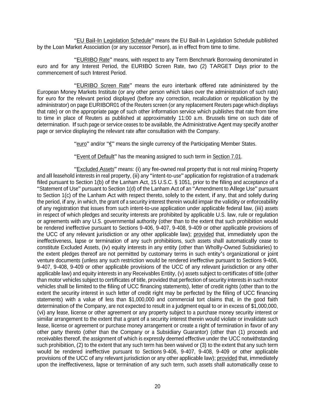 20 “EU Bail-In Legislation Schedule” means the EU Bail-In Legislation Schedule published by the Loan Market Association (or any successor Person), as in effect from time to time. “EURIBO Rate” means, with respect to any Term Benchmark Borrowing denominated in euro and for any Interest Period, the EURIBO Screen Rate, two (2) TARGET Days prior to the commencement of such Interest Period. “EURIBO Screen Rate” means the euro interbank offered rate administered by the European Money Markets Institute (or any other person which takes over the administration of such rate) for euro for the relevant period displayed (before any correction, recalculation or republication by the administrator) on page EURIBOR01 of the Reuters screen (or any replacement Reuters page which displays that rate) or on the appropriate page of such other information service which publishes that rate from time to time in place of Reuters as published at approximately 11:00 a.m. Brussels time on such date of determination. If such page or service ceases to be available, the Administrative Agent may specify another page or service displaying the relevant rate after consultation with the Company. “euro” and/or “€” means the single currency of the Participating Member States. “Event of Default” has the meaning assigned to such term in Section 7.01. “Excluded Assets” means: (i) any fee-owned real property that is not real mining Property and all leasehold interests in real property, (ii) any “intent-to-use” application for registration of a trademark filed pursuant to Section 1(b) of the Lanham Act, 15 U.S.C. § 1051, prior to the filing and acceptance of a “Statement of Use” pursuant to Section 1(d) of the Lanham Act of an “Amendment to Allege Use” pursuant to Section 1(c) of the Lanham Act with respect thereto, solely to the extent, if any, that and solely during the period, if any, in which, the grant of a security interest therein would impair the validity or enforceability of any registration that issues from such intent-to-use application under applicable federal law, (iii) assets in respect of which pledges and security interests are prohibited by applicable U.S. law, rule or regulation or agreements with any U.S. governmental authority (other than to the extent that such prohibition would be rendered ineffective pursuant to Sections 9-406, 9-407, 9-408, 9-409 or other applicable provisions of the UCC of any relevant jurisdiction or any other applicable law); provided that, immediately upon the ineffectiveness, lapse or termination of any such prohibitions, such assets shall automatically cease to constitute Excluded Assets, (iv) equity interests in any entity (other than Wholly-Owned Subsidiaries) to the extent pledges thereof are not permitted by customary terms in such entity’s organizational or joint venture documents (unless any such restriction would be rendered ineffective pursuant to Sections 9-406, 9-407, 9-408, 9-409 or other applicable provisions of the UCC of any relevant jurisdiction or any other applicable law) and equity interests in any Receivables Entity, (v) assets subject to certificates of title (other than motor vehicles subject to certificates of title, provided that perfection of security interests in such motor vehicles shall be limited to the filing of UCC financing statements), letter of credit rights (other than to the extent the security interest in such letter of credit right may be perfected by the filing of UCC financing statements) with a value of less than $1,000,000 and commercial tort claims that, in the good faith determination of the Company, are not expected to result in a judgment equal to or in excess of $1,000,000, (vi) any lease, license or other agreement or any property subject to a purchase money security interest or similar arrangement to the extent that a grant of a security interest therein would violate or invalidate such lease, license or agreement or purchase money arrangement or create a right of termination in favor of any other party thereto (other than the Company or a Subsidiary Guarantor) (other than (1) proceeds and receivables thereof, the assignment of which is expressly deemed effective under the UCC notwithstanding such prohibition, (2) to the extent that any such term has been waived or (3) to the extent that any such term would be rendered ineffective pursuant to Sections 9-406, 9-407, 9-408, 9-409 or other applicable provisions of the UCC of any relevant jurisdiction or any other applicable law); provided that, immediately upon the ineffectiveness, lapse or termination of any such term, such assets shall automatically cease to