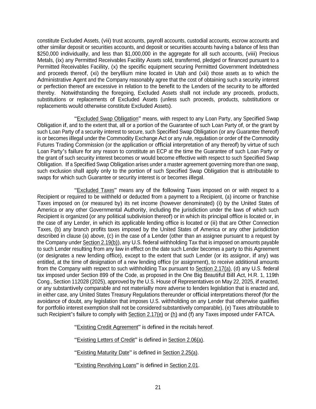 21 constitute Excluded Assets, (vii) trust accounts, payroll accounts, custodial accounts, escrow accounts and other similar deposit or securities accounts, and deposit or securities accounts having a balance of less than $250,000 individually, and less than $1,000,000 in the aggregate for all such accounts, (viii) Precious Metals, (ix) any Permitted Receivables Facility Assets sold, transferred, pledged or financed pursuant to a Permitted Receivables Facility, (x) the specific equipment securing Permitted Government Indebtedness and proceeds thereof, (xi) the beryllium mine located in Utah and (xii) those assets as to which the Administrative Agent and the Company reasonably agree that the cost of obtaining such a security interest or perfection thereof are excessive in relation to the benefit to the Lenders of the security to be afforded thereby. Notwithstanding the foregoing, Excluded Assets shall not include any proceeds, products, substitutions or replacements of Excluded Assets (unless such proceeds, products, substitutions or replacements would otherwise constitute Excluded Assets). “Excluded Swap Obligation” means, with respect to any Loan Party, any Specified Swap Obligation if, and to the extent that, all or a portion of the Guarantee of such Loan Party of, or the grant by such Loan Party of a security interest to secure, such Specified Swap Obligation (or any Guarantee thereof) is or becomes illegal under the Commodity Exchange Act or any rule, regulation or order of the Commodity Futures Trading Commission (or the application or official interpretation of any thereof) by virtue of such Loan Party’s failure for any reason to constitute an ECP at the time the Guarantee of such Loan Party or the grant of such security interest becomes or would become effective with respect to such Specified Swap Obligation. If a Specified Swap Obligation arises under a master agreement governing more than one swap, such exclusion shall apply only to the portion of such Specified Swap Obligation that is attributable to swaps for which such Guarantee or security interest is or becomes illegal. “Excluded Taxes” means any of the following Taxes imposed on or with respect to a Recipient or required to be withheld or deducted from a payment to a Recipient, (a) income or franchise Taxes imposed on (or measured by) its net income (however denominated) (i) by the United States of America or any other Governmental Authority, including the jurisdiction under the laws of which such Recipient is organized (or any political subdivision thereof) or in which its principal office is located or, in the case of any Lender, in which its applicable lending office is located or (ii) that are Other Connection Taxes, (b) any branch profits taxes imposed by the United States of America or any other jurisdiction described in clause (a) above, (c) in the case of a Lender (other than an assignee pursuant to a request by the Company under Section 2.19(b)), any U.S. federal withholding Tax that is imposed on amounts payable to such Lender resulting from any law in effect on the date such Lender becomes a party to this Agreement (or designates a new lending office), except to the extent that such Lender (or its assignor, if any) was entitled, at the time of designation of a new lending office (or assignment), to receive additional amounts from the Company with respect to such withholding Tax pursuant to Section 2.17(a), (d) any U.S. federal tax imposed under Section 899 of the Code, as proposed in the One Big Beautiful Bill Act, H.R. 1, 119th Cong., Section 112028 (2025), approved by the U.S. House of Representatives on May 22, 2025, if enacted, or any substantively comparable and not materially more adverse to lenders legislation that is enacted and, in either case, any United States Treasury Regulations thereunder or official interpretations thereof (for the avoidance of doubt, any legislation that imposes U.S. withholding on any Lender that otherwise qualifies for portfolio interest exemption shall not be considered substantively comparable), (e) Taxes attributable to such Recipient’s failure to comply with Section 2.17(e) or (h) and (f) any Taxes imposed under FATCA. “Existing Credit Agreement” is defined in the recitals hereof. “Existing Letters of Credit” is defined in Section 2.06(a). “Existing Maturity Date” is defined in Section 2.25(a). “Existing Revolving Loans” is defined in Section 2.01.
