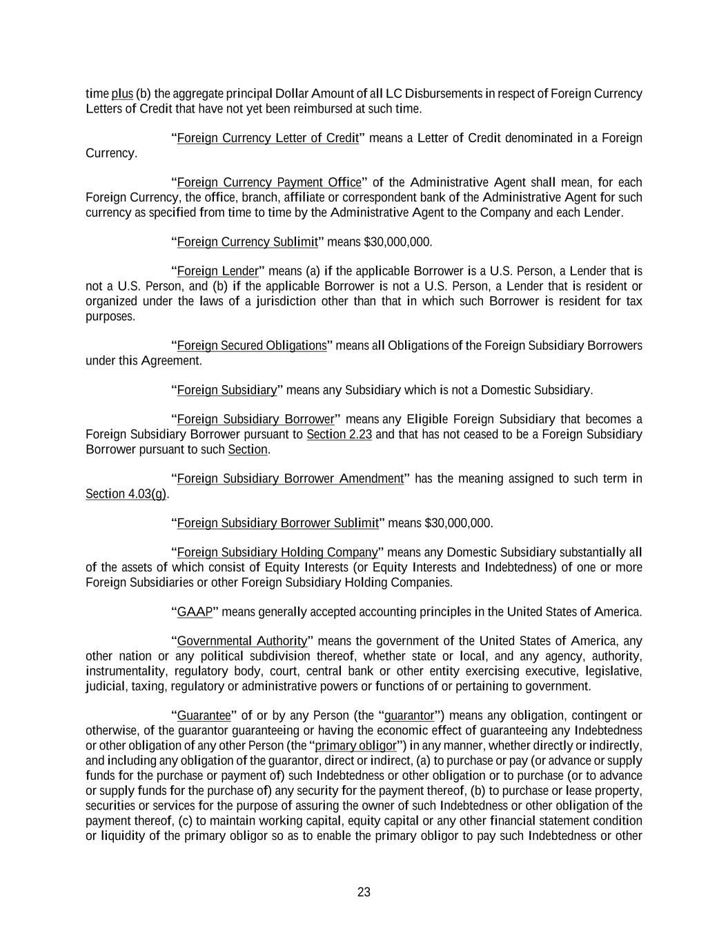 23 time plus (b) the aggregate principal Dollar Amount of all LC Disbursements in respect of Foreign Currency Letters of Credit that have not yet been reimbursed at such time. “Foreign Currency Letter of Credit” means a Letter of Credit denominated in a Foreign Currency. “Foreign Currency Payment Office” of the Administrative Agent shall mean, for each Foreign Currency, the office, branch, affiliate or correspondent bank of the Administrative Agent for such currency as specified from time to time by the Administrative Agent to the Company and each Lender. “Foreign Currency Sublimit” means $30,000,000. “Foreign Lender” means (a) if the applicable Borrower is a U.S. Person, a Lender that is not a U.S. Person, and (b) if the applicable Borrower is not a U.S. Person, a Lender that is resident or organized under the laws of a jurisdiction other than that in which such Borrower is resident for tax purposes. “Foreign Secured Obligations” means all Obligations of the Foreign Subsidiary Borrowers under this Agreement. “Foreign Subsidiary” means any Subsidiary which is not a Domestic Subsidiary. “Foreign Subsidiary Borrower” means any Eligible Foreign Subsidiary that becomes a Foreign Subsidiary Borrower pursuant to Section 2.23 and that has not ceased to be a Foreign Subsidiary Borrower pursuant to such Section. “Foreign Subsidiary Borrower Amendment” has the meaning assigned to such term in Section 4.03(g). “Foreign Subsidiary Borrower Sublimit” means $30,000,000. “Foreign Subsidiary Holding Company” means any Domestic Subsidiary substantially all of the assets of which consist of Equity Interests (or Equity Interests and Indebtedness) of one or more Foreign Subsidiaries or other Foreign Subsidiary Holding Companies. “GAAP” means generally accepted accounting principles in the United States of America. “Governmental Authority” means the government of the United States of America, any other nation or any political subdivision thereof, whether state or local, and any agency, authority, instrumentality, regulatory body, court, central bank or other entity exercising executive, legislative, judicial, taxing, regulatory or administrative powers or functions of or pertaining to government. “Guarantee” of or by any Person (the “guarantor”) means any obligation, contingent or otherwise, of the guarantor guaranteeing or having the economic effect of guaranteeing any Indebtedness or other obligation of any other Person (the “primary obligor”) in any manner, whether directly or indirectly, and including any obligation of the guarantor, direct or indirect, (a) to purchase or pay (or advance or supply funds for the purchase or payment of) such Indebtedness or other obligation or to purchase (or to advance or supply funds for the purchase of) any security for the payment thereof, (b) to purchase or lease property, securities or services for the purpose of assuring the owner of such Indebtedness or other obligation of the payment thereof, (c) to maintain working capital, equity capital or any other financial statement condition or liquidity of the primary obligor so as to enable the primary obligor to pay such Indebtedness or other