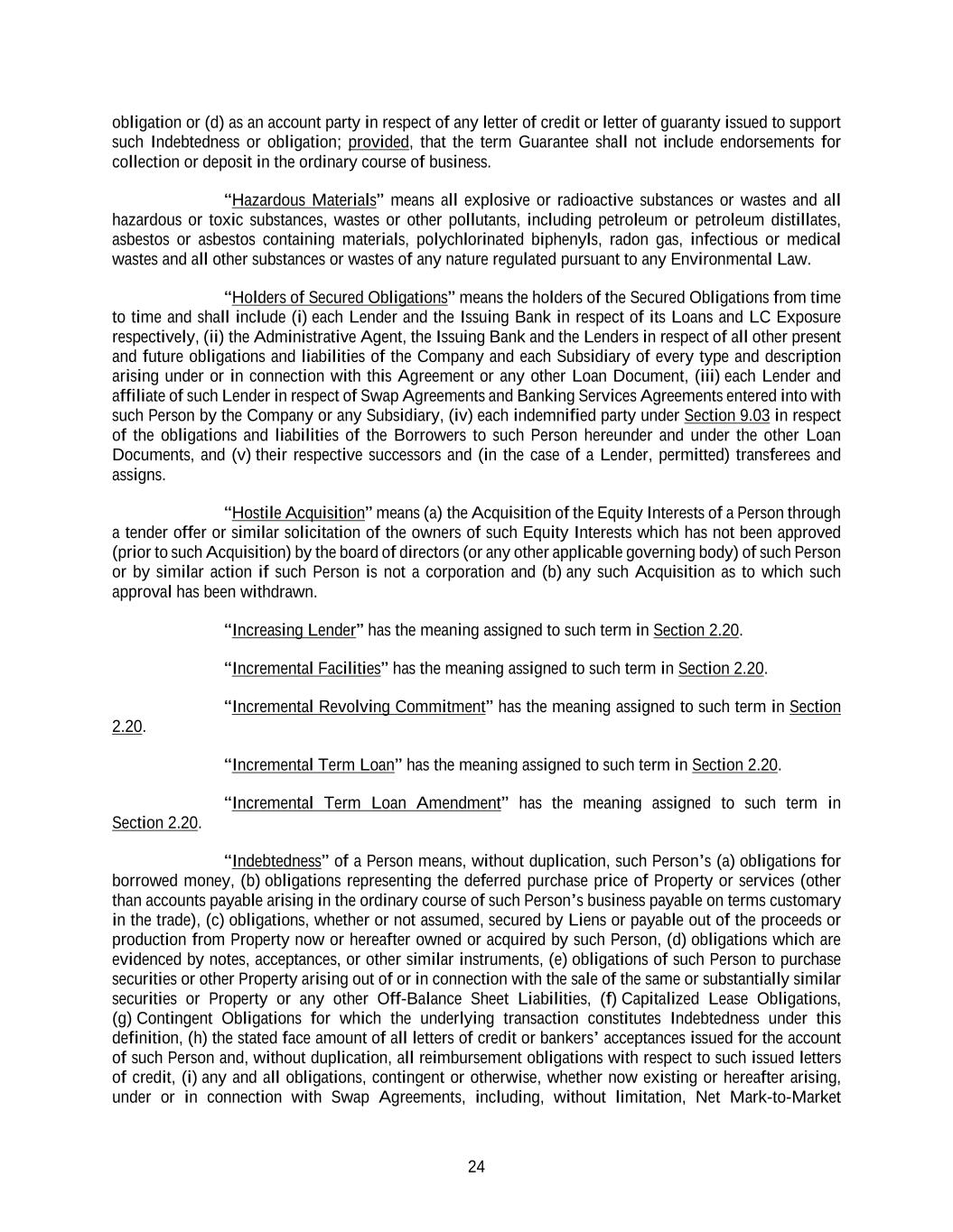 24 obligation or (d) as an account party in respect of any letter of credit or letter of guaranty issued to support such Indebtedness or obligation; provided, that the term Guarantee shall not include endorsements for collection or deposit in the ordinary course of business. “Hazardous Materials” means all explosive or radioactive substances or wastes and all hazardous or toxic substances, wastes or other pollutants, including petroleum or petroleum distillates, asbestos or asbestos containing materials, polychlorinated biphenyls, radon gas, infectious or medical wastes and all other substances or wastes of any nature regulated pursuant to any Environmental Law. “Holders of Secured Obligations” means the holders of the Secured Obligations from time to time and shall include (i) each Lender and the Issuing Bank in respect of its Loans and LC Exposure respectively, (ii) the Administrative Agent, the Issuing Bank and the Lenders in respect of all other present and future obligations and liabilities of the Company and each Subsidiary of every type and description arising under or in connection with this Agreement or any other Loan Document, (iii) each Lender and affiliate of such Lender in respect of Swap Agreements and Banking Services Agreements entered into with such Person by the Company or any Subsidiary, (iv) each indemnified party under Section 9.03 in respect of the obligations and liabilities of the Borrowers to such Person hereunder and under the other Loan Documents, and (v) their respective successors and (in the case of a Lender, permitted) transferees and assigns. “Hostile Acquisition” means (a) the Acquisition of the Equity Interests of a Person through a tender offer or similar solicitation of the owners of such Equity Interests which has not been approved (prior to such Acquisition) by the board of directors (or any other applicable governing body) of such Person or by similar action if such Person is not a corporation and (b) any such Acquisition as to which such approval has been withdrawn. “Increasing Lender” has the meaning assigned to such term in Section 2.20. “Incremental Facilities” has the meaning assigned to such term in Section 2.20. “Incremental Revolving Commitment” has the meaning assigned to such term in Section 2.20. “Incremental Term Loan” has the meaning assigned to such term in Section 2.20. “Incremental Term Loan Amendment” has the meaning assigned to such term in Section 2.20. “Indebtedness” of a Person means, without duplication, such Person’s (a) obligations for borrowed money, (b) obligations representing the deferred purchase price of Property or services (other than accounts payable arising in the ordinary course of such Person’s business payable on terms customary in the trade), (c) obligations, whether or not assumed, secured by Liens or payable out of the proceeds or production from Property now or hereafter owned or acquired by such Person, (d) obligations which are evidenced by notes, acceptances, or other similar instruments, (e) obligations of such Person to purchase securities or other Property arising out of or in connection with the sale of the same or substantially similar securities or Property or any other Off-Balance Sheet Liabilities, (f) Capitalized Lease Obligations, (g) Contingent Obligations for which the underlying transaction constitutes Indebtedness under this definition, (h) the stated face amount of all letters of credit or bankers’ acceptances issued for the account of such Person and, without duplication, all reimbursement obligations with respect to such issued letters of credit, (i) any and all obligations, contingent or otherwise, whether now existing or hereafter arising, under or in connection with Swap Agreements, including, without limitation, Net Mark-to-Market