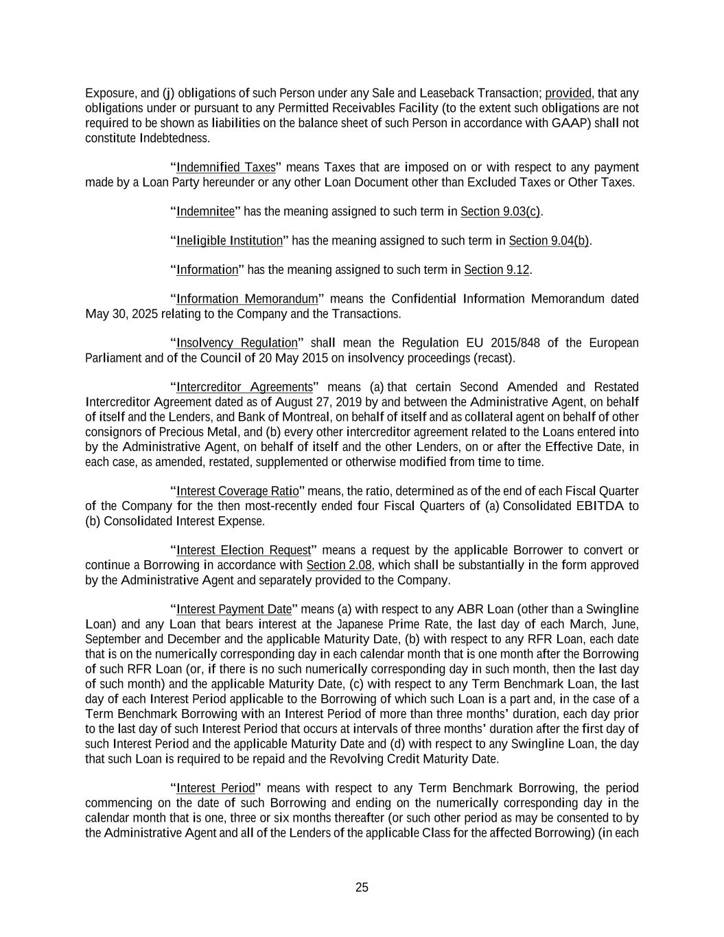 25 Exposure, and (j) obligations of such Person under any Sale and Leaseback Transaction; provided, that any obligations under or pursuant to any Permitted Receivables Facility (to the extent such obligations are not required to be shown as liabilities on the balance sheet of such Person in accordance with GAAP) shall not constitute Indebtedness. “Indemnified Taxes” means Taxes that are imposed on or with respect to any payment made by a Loan Party hereunder or any other Loan Document other than Excluded Taxes or Other Taxes. “Indemnitee” has the meaning assigned to such term in Section 9.03(c). “Ineligible Institution” has the meaning assigned to such term in Section 9.04(b). “Information” has the meaning assigned to such term in Section 9.12. “Information Memorandum” means the Confidential Information Memorandum dated May 30, 2025 relating to the Company and the Transactions. “Insolvency Regulation” shall mean the Regulation EU 2015/848 of the European Parliament and of the Council of 20 May 2015 on insolvency proceedings (recast). “Intercreditor Agreements” means (a) that certain Second Amended and Restated Intercreditor Agreement dated as of August 27, 2019 by and between the Administrative Agent, on behalf of itself and the Lenders, and Bank of Montreal, on behalf of itself and as collateral agent on behalf of other consignors of Precious Metal, and (b) every other intercreditor agreement related to the Loans entered into by the Administrative Agent, on behalf of itself and the other Lenders, on or after the Effective Date, in each case, as amended, restated, supplemented or otherwise modified from time to time. “Interest Coverage Ratio” means, the ratio, determined as of the end of each Fiscal Quarter of the Company for the then most-recently ended four Fiscal Quarters of (a) Consolidated EBITDA to (b) Consolidated Interest Expense. “Interest Election Request” means a request by the applicable Borrower to convert or continue a Borrowing in accordance with Section 2.08, which shall be substantially in the form approved by the Administrative Agent and separately provided to the Company. “Interest Payment Date” means (a) with respect to any ABR Loan (other than a Swingline Loan) and any Loan that bears interest at the Japanese Prime Rate, the last day of each March, June, September and December and the applicable Maturity Date, (b) with respect to any RFR Loan, each date that is on the numerically corresponding day in each calendar month that is one month after the Borrowing of such RFR Loan (or, if there is no such numerically corresponding day in such month, then the last day of such month) and the applicable Maturity Date, (c) with respect to any Term Benchmark Loan, the last day of each Interest Period applicable to the Borrowing of which such Loan is a part and, in the case of a Term Benchmark Borrowing with an Interest Period of more than three months’ duration, each day prior to the last day of such Interest Period that occurs at intervals of three months’ duration after the first day of such Interest Period and the applicable Maturity Date and (d) with respect to any Swingline Loan, the day that such Loan is required to be repaid and the Revolving Credit Maturity Date. “Interest Period” means with respect to any Term Benchmark Borrowing, the period commencing on the date of such Borrowing and ending on the numerically corresponding day in the calendar month that is one, three or six months thereafter (or such other period as may be consented to by the Administrative Agent and all of the Lenders of the applicable Class for the affected Borrowing) (in each