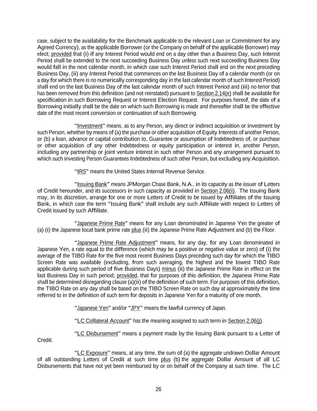 26 case, subject to the availability for the Benchmark applicable to the relevant Loan or Commitment for any Agreed Currency), as the applicable Borrower (or the Company on behalf of the applicable Borrower) may elect; provided that (i) if any Interest Period would end on a day other than a Business Day, such Interest Period shall be extended to the next succeeding Business Day unless such next succeeding Business Day would fall in the next calendar month, in which case such Interest Period shall end on the next preceding Business Day, (ii) any Interest Period that commences on the last Business Day of a calendar month (or on a day for which there is no numerically corresponding day in the last calendar month of such Interest Period) shall end on the last Business Day of the last calendar month of such Interest Period and (iii) no tenor that has been removed from this definition (and not reinstated) pursuant to Section 2.14(e) shall be available for specification in such Borrowing Request or Interest Election Request. For purposes hereof, the date of a Borrowing initially shall be the date on which such Borrowing is made and thereafter shall be the effective date of the most recent conversion or continuation of such Borrowing. “Investment” means, as to any Person, any direct or indirect acquisition or investment by such Person, whether by means of (a) the purchase or other acquisition of Equity Interests of another Person, or (b) a loan, advance or capital contribution to, Guarantee or assumption of Indebtedness of, or purchase or other acquisition of any other Indebtedness or equity participation or interest in, another Person, including any partnership or joint venture interest in such other Person and any arrangement pursuant to which such investing Person Guarantees Indebtedness of such other Person, but excluding any Acquisition. “IRS” means the United States Internal Revenue Service. “Issuing Bank” means JPMorgan Chase Bank, N.A., in its capacity as the issuer of Letters of Credit hereunder, and its successors in such capacity as provided in Section 2.06(i). The Issuing Bank may, in its discretion, arrange for one or more Letters of Credit to be issued by Affiliates of the Issuing Bank, in which case the term “Issuing Bank” shall include any such Affiliate with respect to Letters of Credit issued by such Affiliate. “Japanese Prime Rate” means for any Loan denominated in Japanese Yen the greater of (a) (i) the Japanese local bank prime rate plus (ii) the Japanese Prime Rate Adjustment and (b) the Floor. “Japanese Prime Rate Adjustment” means, for any day, for any Loan denominated in Japanese Yen, a rate equal to the difference (which may be a positive or negative value or zero) of (i) the average of the TIBO Rate for the five most recent Business Days preceding such day for which the TIBO Screen Rate was available (excluding, from such averaging, the highest and the lowest TIBO Rate applicable during such period of five Business Days) minus (ii) the Japanese Prime Rate in effect on the last Business Day in such period; provided, that for purposes of this definition, the Japanese Prime Rate shall be determined disregarding clause (a)(ii) of the definition of such term. For purposes of this definition, the TIBO Rate on any day shall be based on the TIBO Screen Rate on such day at approximately the time referred to in the definition of such term for deposits in Japanese Yen for a maturity of one month. “Japanese Yen” and/or “JPY” means the lawful currency of Japan. “LC Collateral Account” has the meaning assigned to such term in Section 2.06(j). “LC Disbursement” means a payment made by the Issuing Bank pursuant to a Letter of Credit. “LC Exposure” means, at any time, the sum of (a) the aggregate undrawn Dollar Amount of all outstanding Letters of Credit at such time plus (b) the aggregate Dollar Amount of all LC Disbursements that have not yet been reimbursed by or on behalf of the Company at such time. The LC