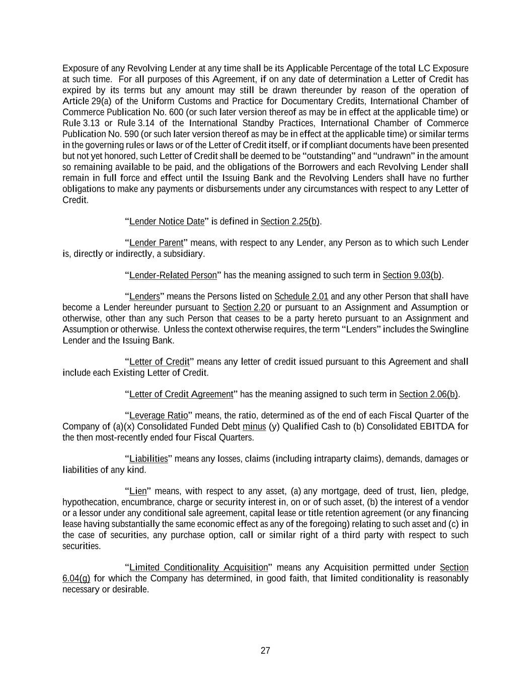 27 Exposure of any Revolving Lender at any time shall be its Applicable Percentage of the total LC Exposure at such time. For all purposes of this Agreement, if on any date of determination a Letter of Credit has expired by its terms but any amount may still be drawn thereunder by reason of the operation of Article 29(a) of the Uniform Customs and Practice for Documentary Credits, International Chamber of Commerce Publication No. 600 (or such later version thereof as may be in effect at the applicable time) or Rule 3.13 or Rule 3.14 of the International Standby Practices, International Chamber of Commerce Publication No. 590 (or such later version thereof as may be in effect at the applicable time) or similar terms in the governing rules or laws or of the Letter of Credit itself, or if compliant documents have been presented but not yet honored, such Letter of Credit shall be deemed to be “outstanding” and “undrawn” in the amount so remaining available to be paid, and the obligations of the Borrowers and each Revolving Lender shall remain in full force and effect until the Issuing Bank and the Revolving Lenders shall have no further obligations to make any payments or disbursements under any circumstances with respect to any Letter of Credit. “Lender Notice Date” is defined in Section 2.25(b). “Lender Parent” means, with respect to any Lender, any Person as to which such Lender is, directly or indirectly, a subsidiary. “Lender-Related Person” has the meaning assigned to such term in Section 9.03(b). “Lenders” means the Persons listed on Schedule 2.01 and any other Person that shall have become a Lender hereunder pursuant to Section 2.20 or pursuant to an Assignment and Assumption or otherwise, other than any such Person that ceases to be a party hereto pursuant to an Assignment and Assumption or otherwise. Unless the context otherwise requires, the term “Lenders” includes the Swingline Lender and the Issuing Bank. “Letter of Credit” means any letter of credit issued pursuant to this Agreement and shall include each Existing Letter of Credit. “Letter of Credit Agreement” has the meaning assigned to such term in Section 2.06(b). “Leverage Ratio” means, the ratio, determined as of the end of each Fiscal Quarter of the Company of (a)(x) Consolidated Funded Debt minus (y) Qualified Cash to (b) Consolidated EBITDA for the then most-recently ended four Fiscal Quarters. “Liabilities” means any losses, claims (including intraparty claims), demands, damages or liabilities of any kind. “Lien” means, with respect to any asset, (a) any mortgage, deed of trust, lien, pledge, hypothecation, encumbrance, charge or security interest in, on or of such asset, (b) the interest of a vendor or a lessor under any conditional sale agreement, capital lease or title retention agreement (or any financing lease having substantially the same economic effect as any of the foregoing) relating to such asset and (c) in the case of securities, any purchase option, call or similar right of a third party with respect to such securities. “Limited Conditionality Acquisition” means any Acquisition permitted under Section 6.04(g) for which the Company has determined, in good faith, that limited conditionality is reasonably necessary or desirable.