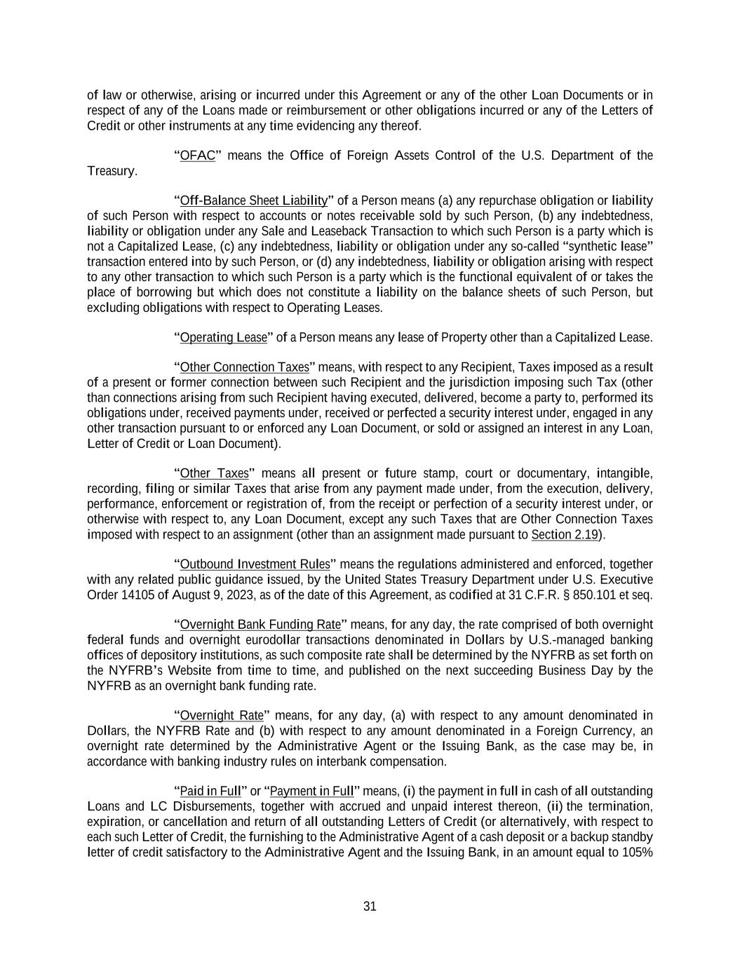 31 of law or otherwise, arising or incurred under this Agreement or any of the other Loan Documents or in respect of any of the Loans made or reimbursement or other obligations incurred or any of the Letters of Credit or other instruments at any time evidencing any thereof. “OFAC” means the Office of Foreign Assets Control of the U.S. Department of the Treasury. “Off-Balance Sheet Liability” of a Person means (a) any repurchase obligation or liability of such Person with respect to accounts or notes receivable sold by such Person, (b) any indebtedness, liability or obligation under any Sale and Leaseback Transaction to which such Person is a party which is not a Capitalized Lease, (c) any indebtedness, liability or obligation under any so-called “synthetic lease” transaction entered into by such Person, or (d) any indebtedness, liability or obligation arising with respect to any other transaction to which such Person is a party which is the functional equivalent of or takes the place of borrowing but which does not constitute a liability on the balance sheets of such Person, but excluding obligations with respect to Operating Leases. “Operating Lease” of a Person means any lease of Property other than a Capitalized Lease. “Other Connection Taxes” means, with respect to any Recipient, Taxes imposed as a result of a present or former connection between such Recipient and the jurisdiction imposing such Tax (other than connections arising from such Recipient having executed, delivered, become a party to, performed its obligations under, received payments under, received or perfected a security interest under, engaged in any other transaction pursuant to or enforced any Loan Document, or sold or assigned an interest in any Loan, Letter of Credit or Loan Document). “Other Taxes” means all present or future stamp, court or documentary, intangible, recording, filing or similar Taxes that arise from any payment made under, from the execution, delivery, performance, enforcement or registration of, from the receipt or perfection of a security interest under, or otherwise with respect to, any Loan Document, except any such Taxes that are Other Connection Taxes imposed with respect to an assignment (other than an assignment made pursuant to Section 2.19). “Outbound Investment Rules” means the regulations administered and enforced, together with any related public guidance issued, by the United States Treasury Department under U.S. Executive Order 14105 of August 9, 2023, as of the date of this Agreement, as codified at 31 C.F.R. § 850.101 et seq. “Overnight Bank Funding Rate” means, for any day, the rate comprised of both overnight federal funds and overnight eurodollar transactions denominated in Dollars by U.S.-managed banking offices of depository institutions, as such composite rate shall be determined by the NYFRB as set forth on the NYFRB’s Website from time to time, and published on the next succeeding Business Day by the NYFRB as an overnight bank funding rate. “Overnight Rate” means, for any day, (a) with respect to any amount denominated in Dollars, the NYFRB Rate and (b) with respect to any amount denominated in a Foreign Currency, an overnight rate determined by the Administrative Agent or the Issuing Bank, as the case may be, in accordance with banking industry rules on interbank compensation. “Paid in Full” or “Payment in Full” means, (i) the payment in full in cash of all outstanding Loans and LC Disbursements, together with accrued and unpaid interest thereon, (ii) the termination, expiration, or cancellation and return of all outstanding Letters of Credit (or alternatively, with respect to each such Letter of Credit, the furnishing to the Administrative Agent of a cash deposit or a backup standby letter of credit satisfactory to the Administrative Agent and the Issuing Bank, in an amount equal to 105%