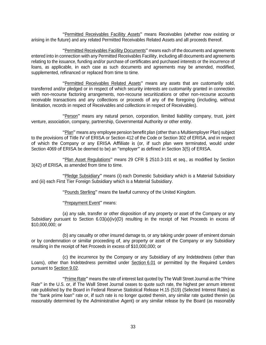 33 “Permitted Receivables Facility Assets” means Receivables (whether now existing or arising in the future) and any related Permitted Receivables Related Assets and all proceeds thereof. “Permitted Receivables Facility Documents” means each of the documents and agreements entered into in connection with any Permitted Receivables Facility, including all documents and agreements relating to the issuance, funding and/or purchase of certificates and purchased interests or the incurrence of loans, as applicable, in each case as such documents and agreements may be amended, modified, supplemented, refinanced or replaced from time to time. “Permitted Receivables Related Assets” means any assets that are customarily sold, transferred and/or pledged or in respect of which security interests are customarily granted in connection with non-recourse factoring arrangements, non-recourse securitizations or other non-recourse accounts receivable transactions and any collections or proceeds of any of the foregoing (including, without limitation, records in respect of Receivables and collections in respect of Receivables). “Person” means any natural person, corporation, limited liability company, trust, joint venture, association, company, partnership, Governmental Authority or other entity. “Plan” means any employee pension benefit plan (other than a Multiemployer Plan) subject to the provisions of Title IV of ERISA or Section 412 of the Code or Section 302 of ERISA, and in respect of which the Company or any ERISA Affiliate is (or, if such plan were terminated, would under Section 4069 of ERISA be deemed to be) an “employer” as defined in Section 3(5) of ERISA. “Plan Asset Regulations” means 29 CFR § 2510.3-101 et seq., as modified by Section 3(42) of ERISA, as amended from time to time. “Pledge Subsidiary” means (i) each Domestic Subsidiary which is a Material Subsidiary and (ii) each First Tier Foreign Subsidiary which is a Material Subsidiary. “Pounds Sterling” means the lawful currency of the United Kingdom. “Prepayment Event” means: (a) any sale, transfer or other disposition of any property or asset of the Company or any Subsidiary pursuant to Section 6.03(a)(iv)(D) resulting in the receipt of Net Proceeds in excess of $10,000,000; or (b) any casualty or other insured damage to, or any taking under power of eminent domain or by condemnation or similar proceeding of, any property or asset of the Company or any Subsidiary resulting in the receipt of Net Proceeds in excess of $10,000,000; or (c) the incurrence by the Company or any Subsidiary of any Indebtedness (other than Loans), other than Indebtedness permitted under Section 6.01 or permitted by the Required Lenders pursuant to Section 9.02. “Prime Rate” means the rate of interest last quoted by The Wall Street Journal as the “Prime Rate” in the U.S. or, if The Wall Street Journal ceases to quote such rate, the highest per annum interest rate published by the Board in Federal Reserve Statistical Release H.15 (519) (Selected Interest Rates) as the “bank prime loan” rate or, if such rate is no longer quoted therein, any similar rate quoted therein (as reasonably determined by the Administrative Agent) or any similar release by the Board (as reasonably