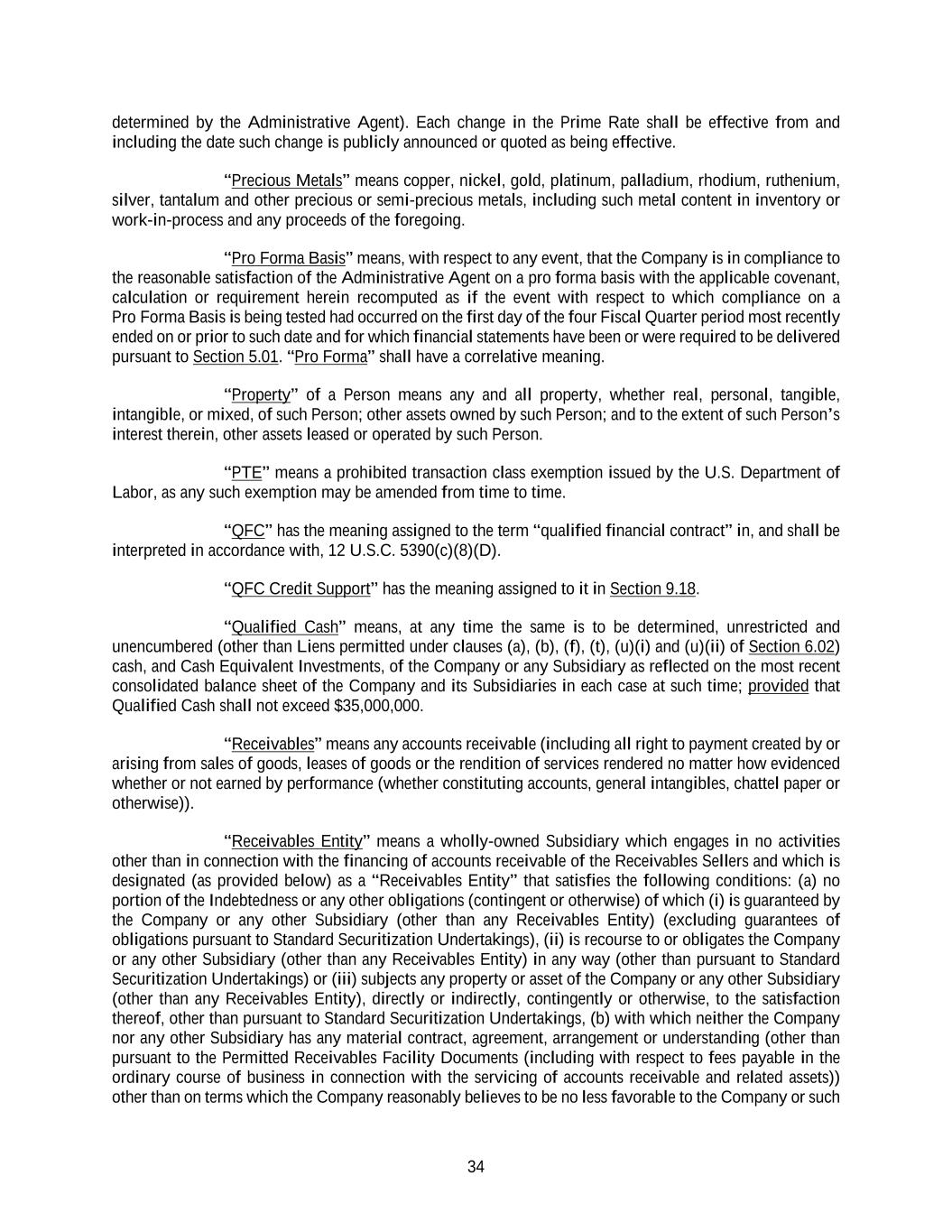 34 determined by the Administrative Agent). Each change in the Prime Rate shall be effective from and including the date such change is publicly announced or quoted as being effective. “Precious Metals” means copper, nickel, gold, platinum, palladium, rhodium, ruthenium, silver, tantalum and other precious or semi-precious metals, including such metal content in inventory or work-in-process and any proceeds of the foregoing. “Pro Forma Basis” means, with respect to any event, that the Company is in compliance to the reasonable satisfaction of the Administrative Agent on a pro forma basis with the applicable covenant, calculation or requirement herein recomputed as if the event with respect to which compliance on a Pro Forma Basis is being tested had occurred on the first day of the four Fiscal Quarter period most recently ended on or prior to such date and for which financial statements have been or were required to be delivered pursuant to Section 5.01. “Pro Forma” shall have a correlative meaning. “Property” of a Person means any and all property, whether real, personal, tangible, intangible, or mixed, of such Person; other assets owned by such Person; and to the extent of such Person’s interest therein, other assets leased or operated by such Person. “PTE” means a prohibited transaction class exemption issued by the U.S. Department of Labor, as any such exemption may be amended from time to time. “QFC” has the meaning assigned to the term “qualified financial contract” in, and shall be interpreted in accordance with, 12 U.S.C. 5390(c)(8)(D). “QFC Credit Support” has the meaning assigned to it in Section 9.18. “Qualified Cash” means, at any time the same is to be determined, unrestricted and unencumbered (other than Liens permitted under clauses (a), (b), (f), (t), (u)(i) and (u)(ii) of Section 6.02) cash, and Cash Equivalent Investments, of the Company or any Subsidiary as reflected on the most recent consolidated balance sheet of the Company and its Subsidiaries in each case at such time; provided that Qualified Cash shall not exceed $35,000,000. “Receivables” means any accounts receivable (including all right to payment created by or arising from sales of goods, leases of goods or the rendition of services rendered no matter how evidenced whether or not earned by performance (whether constituting accounts, general intangibles, chattel paper or otherwise)). “Receivables Entity” means a wholly-owned Subsidiary which engages in no activities other than in connection with the financing of accounts receivable of the Receivables Sellers and which is designated (as provided below) as a “Receivables Entity” that satisfies the following conditions: (a) no portion of the Indebtedness or any other obligations (contingent or otherwise) of which (i) is guaranteed by the Company or any other Subsidiary (other than any Receivables Entity) (excluding guarantees of obligations pursuant to Standard Securitization Undertakings), (ii) is recourse to or obligates the Company or any other Subsidiary (other than any Receivables Entity) in any way (other than pursuant to Standard Securitization Undertakings) or (iii) subjects any property or asset of the Company or any other Subsidiary (other than any Receivables Entity), directly or indirectly, contingently or otherwise, to the satisfaction thereof, other than pursuant to Standard Securitization Undertakings, (b) with which neither the Company nor any other Subsidiary has any material contract, agreement, arrangement or understanding (other than pursuant to the Permitted Receivables Facility Documents (including with respect to fees payable in the ordinary course of business in connection with the servicing of accounts receivable and related assets)) other than on terms which the Company reasonably believes to be no less favorable to the Company or such