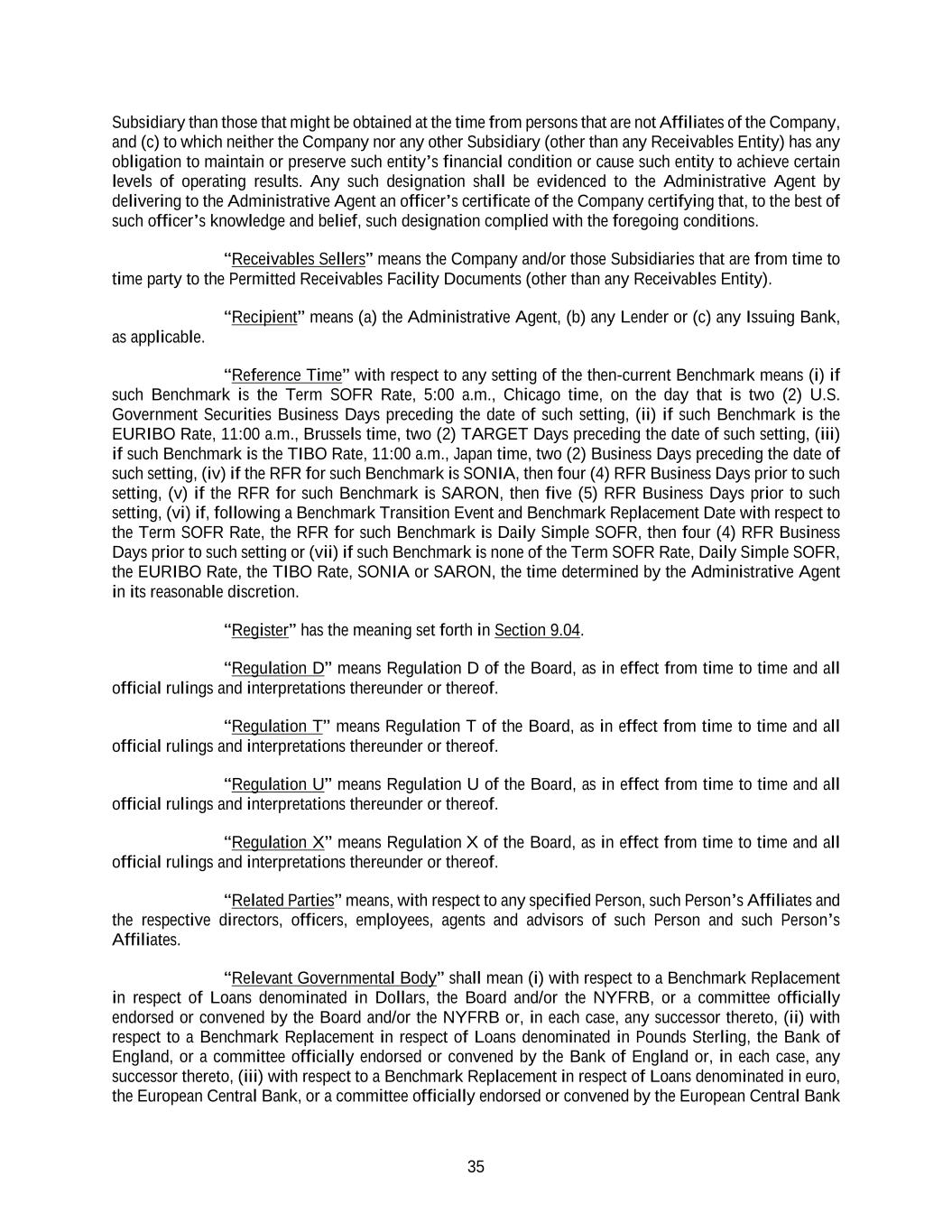 35 Subsidiary than those that might be obtained at the time from persons that are not Affiliates of the Company, and (c) to which neither the Company nor any other Subsidiary (other than any Receivables Entity) has any obligation to maintain or preserve such entity’s financial condition or cause such entity to achieve certain levels of operating results. Any such designation shall be evidenced to the Administrative Agent by delivering to the Administrative Agent an officer’s certificate of the Company certifying that, to the best of such officer’s knowledge and belief, such designation complied with the foregoing conditions. “Receivables Sellers” means the Company and/or those Subsidiaries that are from time to time party to the Permitted Receivables Facility Documents (other than any Receivables Entity). “Recipient” means (a) the Administrative Agent, (b) any Lender or (c) any Issuing Bank, as applicable. “Reference Time” with respect to any setting of the then-current Benchmark means (i) if such Benchmark is the Term SOFR Rate, 5:00 a.m., Chicago time, on the day that is two (2) U.S. Government Securities Business Days preceding the date of such setting, (ii) if such Benchmark is the EURIBO Rate, 11:00 a.m., Brussels time, two (2) TARGET Days preceding the date of such setting, (iii) if such Benchmark is the TIBO Rate, 11:00 a.m., Japan time, two (2) Business Days preceding the date of such setting, (iv) if the RFR for such Benchmark is SONIA, then four (4) RFR Business Days prior to such setting, (v) if the RFR for such Benchmark is SARON, then five (5) RFR Business Days prior to such setting, (vi) if, following a Benchmark Transition Event and Benchmark Replacement Date with respect to the Term SOFR Rate, the RFR for such Benchmark is Daily Simple SOFR, then four (4) RFR Business Days prior to such setting or (vii) if such Benchmark is none of the Term SOFR Rate, Daily Simple SOFR, the EURIBO Rate, the TIBO Rate, SONIA or SARON, the time determined by the Administrative Agent in its reasonable discretion. “Register” has the meaning set forth in Section 9.04. “Regulation D” means Regulation D of the Board, as in effect from time to time and all official rulings and interpretations thereunder or thereof. “Regulation T” means Regulation T of the Board, as in effect from time to time and all official rulings and interpretations thereunder or thereof. “Regulation U” means Regulation U of the Board, as in effect from time to time and all official rulings and interpretations thereunder or thereof. “Regulation X” means Regulation X of the Board, as in effect from time to time and all official rulings and interpretations thereunder or thereof. “Related Parties” means, with respect to any specified Person, such Person’s Affiliates and the respective directors, officers, employees, agents and advisors of such Person and such Person’s Affiliates. “Relevant Governmental Body” shall mean (i) with respect to a Benchmark Replacement in respect of Loans denominated in Dollars, the Board and/or the NYFRB, or a committee officially endorsed or convened by the Board and/or the NYFRB or, in each case, any successor thereto, (ii) with respect to a Benchmark Replacement in respect of Loans denominated in Pounds Sterling, the Bank of England, or a committee officially endorsed or convened by the Bank of England or, in each case, any successor thereto, (iii) with respect to a Benchmark Replacement in respect of Loans denominated in euro, the European Central Bank, or a committee officially endorsed or convened by the European Central Bank