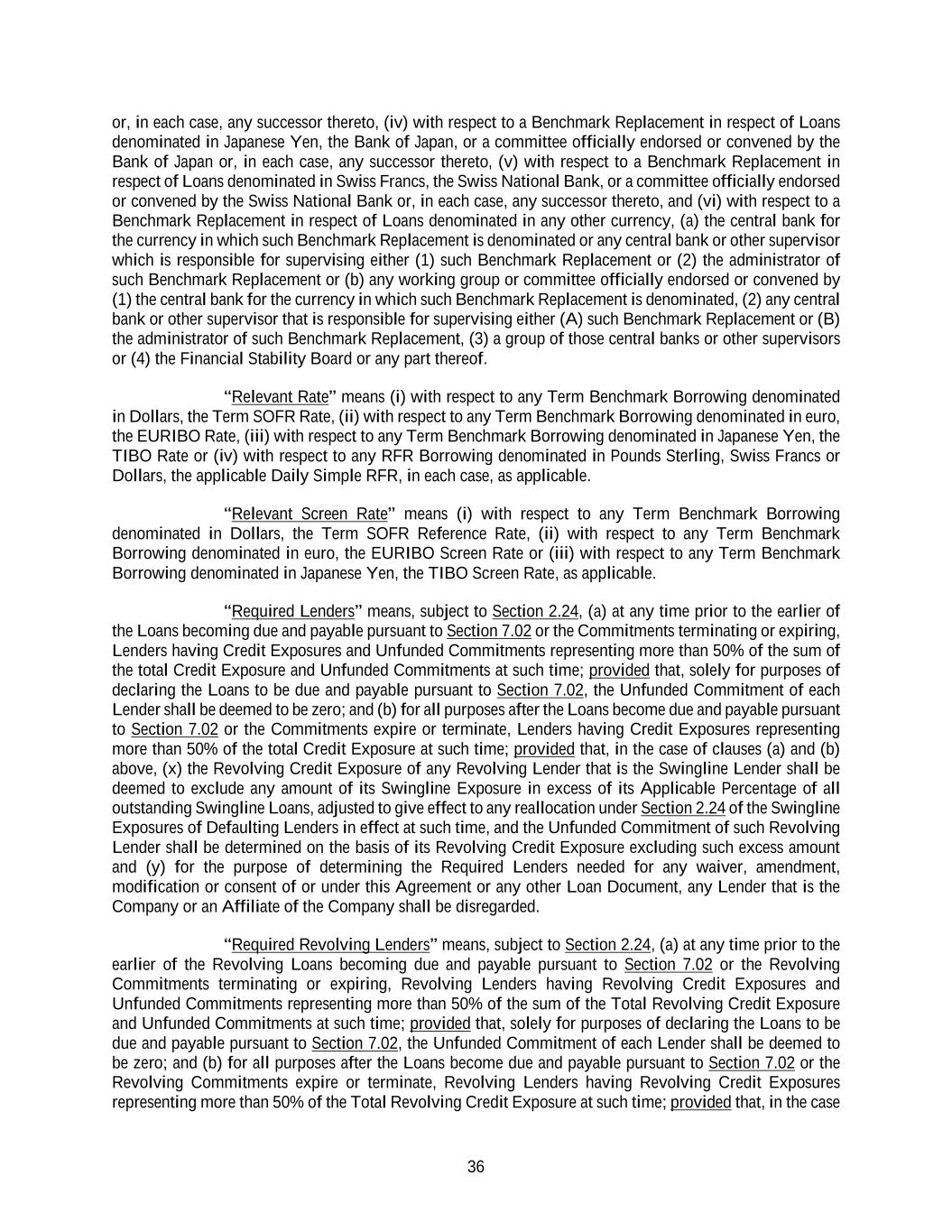 36 or, in each case, any successor thereto, (iv) with respect to a Benchmark Replacement in respect of Loans denominated in Japanese Yen, the Bank of Japan, or a committee officially endorsed or convened by the Bank of Japan or, in each case, any successor thereto, (v) with respect to a Benchmark Replacement in respect of Loans denominated in Swiss Francs, the Swiss National Bank, or a committee officially endorsed or convened by the Swiss National Bank or, in each case, any successor thereto, and (vi) with respect to a Benchmark Replacement in respect of Loans denominated in any other currency, (a) the central bank for the currency in which such Benchmark Replacement is denominated or any central bank or other supervisor which is responsible for supervising either (1) such Benchmark Replacement or (2) the administrator of such Benchmark Replacement or (b) any working group or committee officially endorsed or convened by (1) the central bank for the currency in which such Benchmark Replacement is denominated, (2) any central bank or other supervisor that is responsible for supervising either (A) such Benchmark Replacement or (B) the administrator of such Benchmark Replacement, (3) a group of those central banks or other supervisors or (4) the Financial Stability Board or any part thereof. “Relevant Rate” means (i) with respect to any Term Benchmark Borrowing denominated in Dollars, the Term SOFR Rate, (ii) with respect to any Term Benchmark Borrowing denominated in euro, the EURIBO Rate, (iii) with respect to any Term Benchmark Borrowing denominated in Japanese Yen, the TIBO Rate or (iv) with respect to any RFR Borrowing denominated in Pounds Sterling, Swiss Francs or Dollars, the applicable Daily Simple RFR, in each case, as applicable. “Relevant Screen Rate” means (i) with respect to any Term Benchmark Borrowing denominated in Dollars, the Term SOFR Reference Rate, (ii) with respect to any Term Benchmark Borrowing denominated in euro, the EURIBO Screen Rate or (iii) with respect to any Term Benchmark Borrowing denominated in Japanese Yen, the TIBO Screen Rate, as applicable. “Required Lenders” means, subject to Section 2.24, (a) at any time prior to the earlier of the Loans becoming due and payable pursuant to Section 7.02 or the Commitments terminating or expiring, Lenders having Credit Exposures and Unfunded Commitments representing more than 50% of the sum of the total Credit Exposure and Unfunded Commitments at such time; provided that, solely for purposes of declaring the Loans to be due and payable pursuant to Section 7.02, the Unfunded Commitment of each Lender shall be deemed to be zero; and (b) for all purposes after the Loans become due and payable pursuant to Section 7.02 or the Commitments expire or terminate, Lenders having Credit Exposures representing more than 50% of the total Credit Exposure at such time; provided that, in the case of clauses (a) and (b) above, (x) the Revolving Credit Exposure of any Revolving Lender that is the Swingline Lender shall be deemed to exclude any amount of its Swingline Exposure in excess of its Applicable Percentage of all outstanding Swingline Loans, adjusted to give effect to any reallocation under Section 2.24 of the Swingline Exposures of Defaulting Lenders in effect at such time, and the Unfunded Commitment of such Revolving Lender shall be determined on the basis of its Revolving Credit Exposure excluding such excess amount and (y) for the purpose of determining the Required Lenders needed for any waiver, amendment, modification or consent of or under this Agreement or any other Loan Document, any Lender that is the Company or an Affiliate of the Company shall be disregarded. “Required Revolving Lenders” means, subject to Section 2.24, (a) at any time prior to the earlier of the Revolving Loans becoming due and payable pursuant to Section 7.02 or the Revolving Commitments terminating or expiring, Revolving Lenders having Revolving Credit Exposures and Unfunded Commitments representing more than 50% of the sum of the Total Revolving Credit Exposure and Unfunded Commitments at such time; provided that, solely for purposes of declaring the Loans to be due and payable pursuant to Section 7.02, the Unfunded Commitment of each Lender shall be deemed to be zero; and (b) for all purposes after the Loans become due and payable pursuant to Section 7.02 or the Revolving Commitments expire or terminate, Revolving Lenders having Revolving Credit Exposures representing more than 50% of the Total Revolving Credit Exposure at such time; provided that, in the case