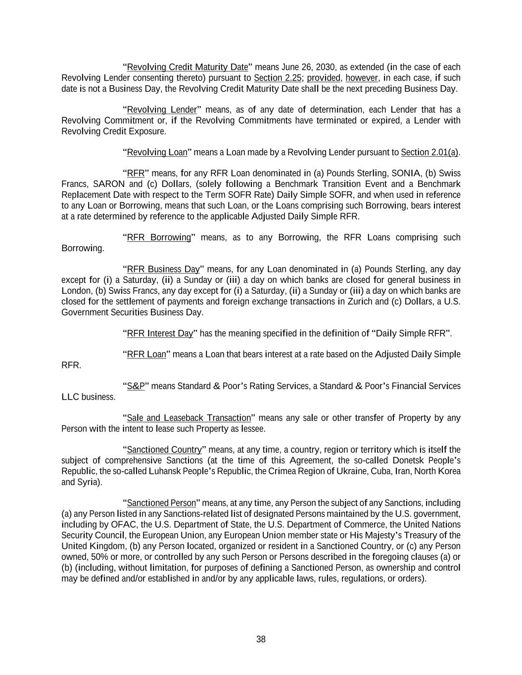 38 “Revolving Credit Maturity Date” means June 26, 2030, as extended (in the case of each Revolving Lender consenting thereto) pursuant to Section 2.25; provided, however, in each case, if such date is not a Business Day, the Revolving Credit Maturity Date shall be the next preceding Business Day. “Revolving Lender” means, as of any date of determination, each Lender that has a Revolving Commitment or, if the Revolving Commitments have terminated or expired, a Lender with Revolving Credit Exposure. “Revolving Loan” means a Loan made by a Revolving Lender pursuant to Section 2.01(a). “RFR” means, for any RFR Loan denominated in (a) Pounds Sterling, SONIA, (b) Swiss Francs, SARON and (c) Dollars, (solely following a Benchmark Transition Event and a Benchmark Replacement Date with respect to the Term SOFR Rate) Daily Simple SOFR, and when used in reference to any Loan or Borrowing, means that such Loan, or the Loans comprising such Borrowing, bears interest at a rate determined by reference to the applicable Adjusted Daily Simple RFR. “RFR Borrowing” means, as to any Borrowing, the RFR Loans comprising such Borrowing. “RFR Business Day” means, for any Loan denominated in (a) Pounds Sterling, any day except for (i) a Saturday, (ii) a Sunday or (iii) a day on which banks are closed for general business in London, (b) Swiss Francs, any day except for (i) a Saturday, (ii) a Sunday or (iii) a day on which banks are closed for the settlement of payments and foreign exchange transactions in Zurich and (c) Dollars, a U.S. Government Securities Business Day. “RFR Interest Day” has the meaning specified in the definition of “Daily Simple RFR”. “RFR Loan” means a Loan that bears interest at a rate based on the Adjusted Daily Simple RFR. “S&P” means Standard & Poor’s Rating Services, a Standard & Poor’s Financial Services LLC business. “Sale and Leaseback Transaction” means any sale or other transfer of Property by any Person with the intent to lease such Property as lessee. “Sanctioned Country” means, at any time, a country, region or territory which is itself the subject of comprehensive Sanctions (at the time of this Agreement, the so-called Donetsk People’s Republic, the so-called Luhansk People’s Republic, the Crimea Region of Ukraine, Cuba, Iran, North Korea and Syria). “Sanctioned Person” means, at any time, any Person the subject of any Sanctions, including (a) any Person listed in any Sanctions-related list of designated Persons maintained by the U.S. government, including by OFAC, the U.S. Department of State, the U.S. Department of Commerce, the United Nations Security Council, the European Union, any European Union member state or His Majesty’s Treasury of the United Kingdom, (b) any Person located, organized or resident in a Sanctioned Country, or (c) any Person owned, 50% or more, or controlled by any such Person or Persons described in the foregoing clauses (a) or (b) (including, without limitation, for purposes of defining a Sanctioned Person, as ownership and control may be defined and/or established in and/or by any applicable laws, rules, regulations, or orders).