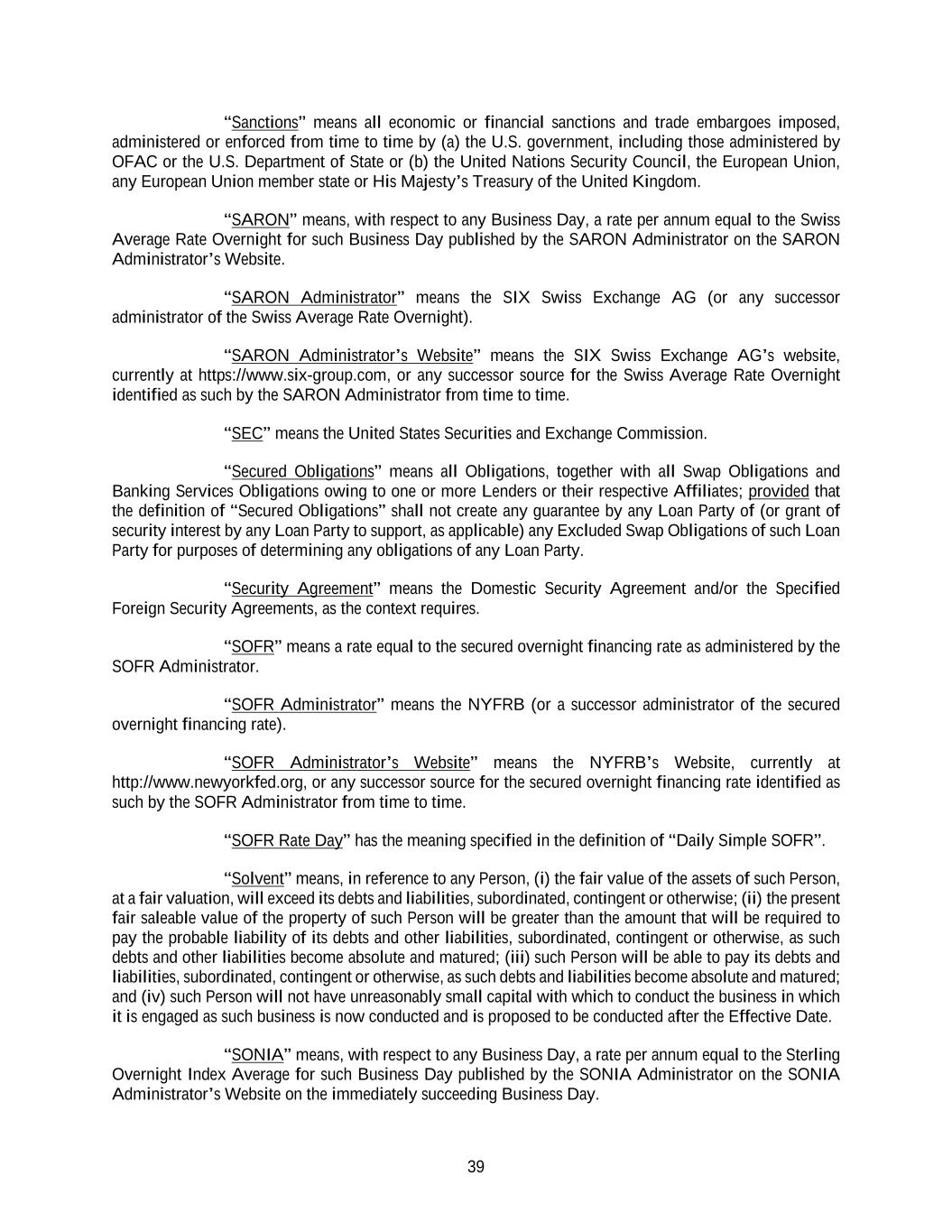 39 “Sanctions” means all economic or financial sanctions and trade embargoes imposed, administered or enforced from time to time by (a) the U.S. government, including those administered by OFAC or the U.S. Department of State or (b) the United Nations Security Council, the European Union, any European Union member state or His Majesty’s Treasury of the United Kingdom. “SARON” means, with respect to any Business Day, a rate per annum equal to the Swiss Average Rate Overnight for such Business Day published by the SARON Administrator on the SARON Administrator’s Website. “SARON Administrator” means the SIX Swiss Exchange AG (or any successor administrator of the Swiss Average Rate Overnight). “SARON Administrator’s Website” means the SIX Swiss Exchange AG’s website, currently at https://www.six-group.com, or any successor source for the Swiss Average Rate Overnight identified as such by the SARON Administrator from time to time. “SEC” means the United States Securities and Exchange Commission. “Secured Obligations” means all Obligations, together with all Swap Obligations and Banking Services Obligations owing to one or more Lenders or their respective Affiliates; provided that the definition of “Secured Obligations” shall not create any guarantee by any Loan Party of (or grant of security interest by any Loan Party to support, as applicable) any Excluded Swap Obligations of such Loan Party for purposes of determining any obligations of any Loan Party. “Security Agreement” means the Domestic Security Agreement and/or the Specified Foreign Security Agreements, as the context requires. “SOFR” means a rate equal to the secured overnight financing rate as administered by the SOFR Administrator. “SOFR Administrator” means the NYFRB (or a successor administrator of the secured overnight financing rate). “SOFR Administrator’s Website” means the NYFRB’s Website, currently at http://www.newyorkfed.org, or any successor source for the secured overnight financing rate identified as such by the SOFR Administrator from time to time. “SOFR Rate Day” has the meaning specified in the definition of “Daily Simple SOFR”. “Solvent” means, in reference to any Person, (i) the fair value of the assets of such Person, at a fair valuation, will exceed its debts and liabilities, subordinated, contingent or otherwise; (ii) the present fair saleable value of the property of such Person will be greater than the amount that will be required to pay the probable liability of its debts and other liabilities, subordinated, contingent or otherwise, as such debts and other liabilities become absolute and matured; (iii) such Person will be able to pay its debts and liabilities, subordinated, contingent or otherwise, as such debts and liabilities become absolute and matured; and (iv) such Person will not have unreasonably small capital with which to conduct the business in which it is engaged as such business is now conducted and is proposed to be conducted after the Effective Date. “SONIA” means, with respect to any Business Day, a rate per annum equal to the Sterling Overnight Index Average for such Business Day published by the SONIA Administrator on the SONIA Administrator’s Website on the immediately succeeding Business Day.