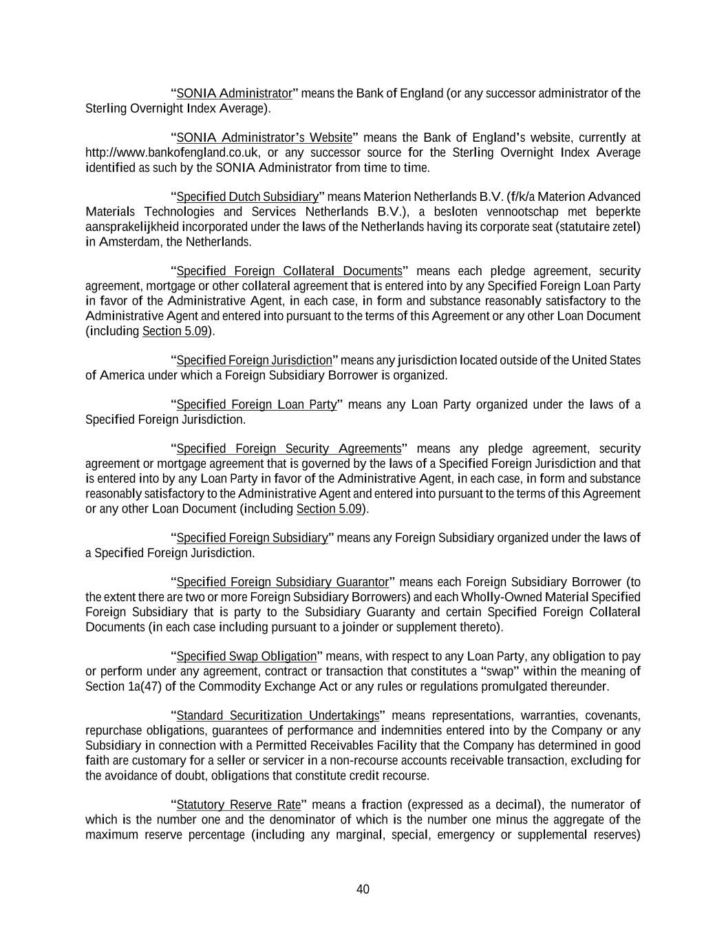 40 “SONIA Administrator” means the Bank of England (or any successor administrator of the Sterling Overnight Index Average). “SONIA Administrator’s Website” means the Bank of England’s website, currently at http://www.bankofengland.co.uk, or any successor source for the Sterling Overnight Index Average identified as such by the SONIA Administrator from time to time. “Specified Dutch Subsidiary” means Materion Netherlands B.V. (f/k/a Materion Advanced Materials Technologies and Services Netherlands B.V.), a besloten vennootschap met beperkte aansprakelijkheid incorporated under the laws of the Netherlands having its corporate seat (statutaire zetel) in Amsterdam, the Netherlands. “Specified Foreign Collateral Documents” means each pledge agreement, security agreement, mortgage or other collateral agreement that is entered into by any Specified Foreign Loan Party in favor of the Administrative Agent, in each case, in form and substance reasonably satisfactory to the Administrative Agent and entered into pursuant to the terms of this Agreement or any other Loan Document (including Section 5.09). “Specified Foreign Jurisdiction” means any jurisdiction located outside of the United States of America under which a Foreign Subsidiary Borrower is organized. “Specified Foreign Loan Party” means any Loan Party organized under the laws of a Specified Foreign Jurisdiction. “Specified Foreign Security Agreements” means any pledge agreement, security agreement or mortgage agreement that is governed by the laws of a Specified Foreign Jurisdiction and that is entered into by any Loan Party in favor of the Administrative Agent, in each case, in form and substance reasonably satisfactory to the Administrative Agent and entered into pursuant to the terms of this Agreement or any other Loan Document (including Section 5.09). “Specified Foreign Subsidiary” means any Foreign Subsidiary organized under the laws of a Specified Foreign Jurisdiction. “Specified Foreign Subsidiary Guarantor” means each Foreign Subsidiary Borrower (to the extent there are two or more Foreign Subsidiary Borrowers) and each Wholly-Owned Material Specified Foreign Subsidiary that is party to the Subsidiary Guaranty and certain Specified Foreign Collateral Documents (in each case including pursuant to a joinder or supplement thereto). “Specified Swap Obligation” means, with respect to any Loan Party, any obligation to pay or perform under any agreement, contract or transaction that constitutes a “swap” within the meaning of Section 1a(47) of the Commodity Exchange Act or any rules or regulations promulgated thereunder. “Standard Securitization Undertakings” means representations, warranties, covenants, repurchase obligations, guarantees of performance and indemnities entered into by the Company or any Subsidiary in connection with a Permitted Receivables Facility that the Company has determined in good faith are customary for a seller or servicer in a non-recourse accounts receivable transaction, excluding for the avoidance of doubt, obligations that constitute credit recourse. “Statutory Reserve Rate” means a fraction (expressed as a decimal), the numerator of which is the number one and the denominator of which is the number one minus the aggregate of the maximum reserve percentage (including any marginal, special, emergency or supplemental reserves)