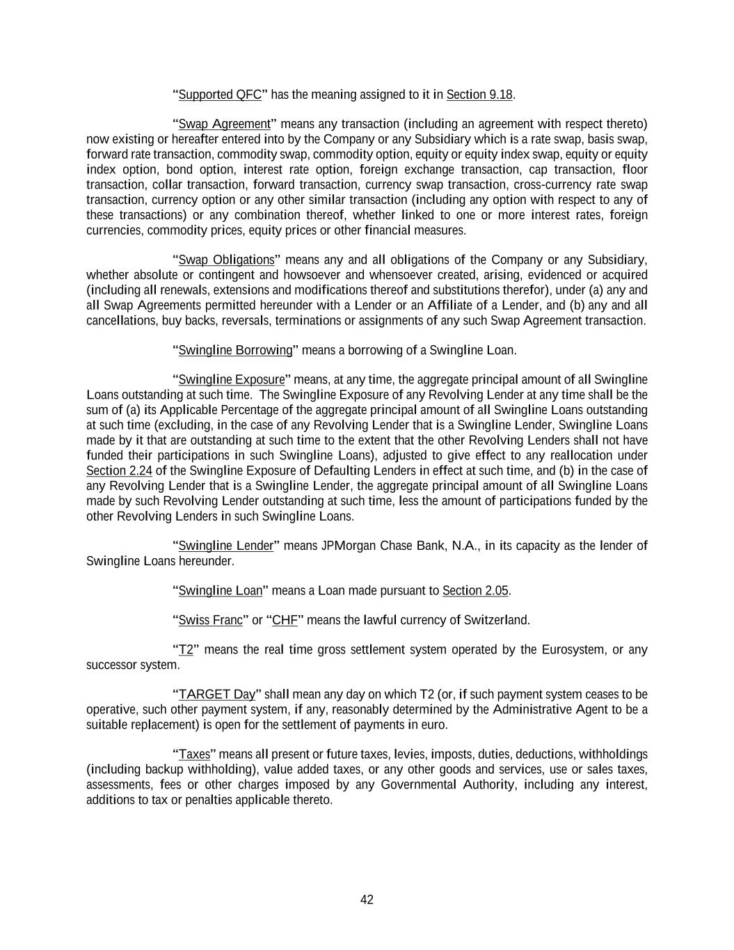 42 “Supported QFC” has the meaning assigned to it in Section 9.18. “Swap Agreement” means any transaction (including an agreement with respect thereto) now existing or hereafter entered into by the Company or any Subsidiary which is a rate swap, basis swap, forward rate transaction, commodity swap, commodity option, equity or equity index swap, equity or equity index option, bond option, interest rate option, foreign exchange transaction, cap transaction, floor transaction, collar transaction, forward transaction, currency swap transaction, cross-currency rate swap transaction, currency option or any other similar transaction (including any option with respect to any of these transactions) or any combination thereof, whether linked to one or more interest rates, foreign currencies, commodity prices, equity prices or other financial measures. “Swap Obligations” means any and all obligations of the Company or any Subsidiary, whether absolute or contingent and howsoever and whensoever created, arising, evidenced or acquired (including all renewals, extensions and modifications thereof and substitutions therefor), under (a) any and all Swap Agreements permitted hereunder with a Lender or an Affiliate of a Lender, and (b) any and all cancellations, buy backs, reversals, terminations or assignments of any such Swap Agreement transaction. “Swingline Borrowing” means a borrowing of a Swingline Loan. “Swingline Exposure” means, at any time, the aggregate principal amount of all Swingline Loans outstanding at such time. The Swingline Exposure of any Revolving Lender at any time shall be the sum of (a) its Applicable Percentage of the aggregate principal amount of all Swingline Loans outstanding at such time (excluding, in the case of any Revolving Lender that is a Swingline Lender, Swingline Loans made by it that are outstanding at such time to the extent that the other Revolving Lenders shall not have funded their participations in such Swingline Loans), adjusted to give effect to any reallocation under Section 2.24 of the Swingline Exposure of Defaulting Lenders in effect at such time, and (b) in the case of any Revolving Lender that is a Swingline Lender, the aggregate principal amount of all Swingline Loans made by such Revolving Lender outstanding at such time, less the amount of participations funded by the other Revolving Lenders in such Swingline Loans. “Swingline Lender” means JPMorgan Chase Bank, N.A., in its capacity as the lender of Swingline Loans hereunder. “Swingline Loan” means a Loan made pursuant to Section 2.05. “Swiss Franc” or “CHF” means the lawful currency of Switzerland. “T2” means the real time gross settlement system operated by the Eurosystem, or any successor system. “TARGET Day” shall mean any day on which T2 (or, if such payment system ceases to be operative, such other payment system, if any, reasonably determined by the Administrative Agent to be a suitable replacement) is open for the settlement of payments in euro. “Taxes” means all present or future taxes, levies, imposts, duties, deductions, withholdings (including backup withholding), value added taxes, or any other goods and services, use or sales taxes, assessments, fees or other charges imposed by any Governmental Authority, including any interest, additions to tax or penalties applicable thereto.