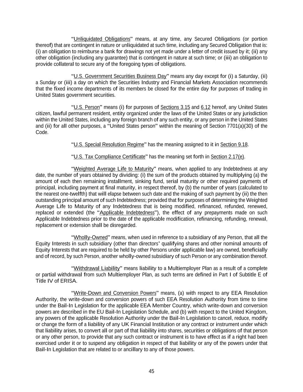 45 “Unliquidated Obligations” means, at any time, any Secured Obligations (or portion thereof) that are contingent in nature or unliquidated at such time, including any Secured Obligation that is: (i) an obligation to reimburse a bank for drawings not yet made under a letter of credit issued by it; (ii) any other obligation (including any guarantee) that is contingent in nature at such time; or (iii) an obligation to provide collateral to secure any of the foregoing types of obligations. “U.S. Government Securities Business Day” means any day except for (i) a Saturday, (ii) a Sunday or (iii) a day on which the Securities Industry and Financial Markets Association recommends that the fixed income departments of its members be closed for the entire day for purposes of trading in United States government securities. “U.S. Person” means (i) for purposes of Sections 3.15 and 6.12 hereof, any United States citizen, lawful permanent resident, entity organized under the laws of the United States or any jurisdiction within the United States, including any foreign branch of any such entity, or any person in the United States and (ii) for all other purposes, a “United States person” within the meaning of Section 7701(a)(30) of the Code. “U.S. Special Resolution Regime” has the meaning assigned to it in Section 9.18. “U.S. Tax Compliance Certificate” has the meaning set forth in Section 2.17(e). “Weighted Average Life to Maturity” means, when applied to any Indebtedness at any date, the number of years obtained by dividing: (i) the sum of the products obtained by multiplying (a) the amount of each then remaining installment, sinking fund, serial maturity or other required payments of principal, including payment at final maturity, in respect thereof, by (b) the number of years (calculated to the nearest one-twelfth) that will elapse between such date and the making of such payment by (ii) the then outstanding principal amount of such Indebtedness; provided that for purposes of determining the Weighted Average Life to Maturity of any Indebtedness that is being modified, refinanced, refunded, renewed, replaced or extended (the “Applicable Indebtedness”), the effect of any prepayments made on such Applicable Indebtedness prior to the date of the applicable modification, refinancing, refunding, renewal, replacement or extension shall be disregarded. “Wholly-Owned” means, when used in reference to a subsidiary of any Person, that all the Equity Interests in such subsidiary (other than directors’ qualifying shares and other nominal amounts of Equity Interests that are required to be held by other Persons under applicable law) are owned, beneficially and of record, by such Person, another wholly-owned subsidiary of such Person or any combination thereof. “Withdrawal Liability” means liability to a Multiemployer Plan as a result of a complete or partial withdrawal from such Multiemployer Plan, as such terms are defined in Part I of Subtitle E of Title IV of ERISA. “Write-Down and Conversion Powers” means, (a) with respect to any EEA Resolution Authority, the write-down and conversion powers of such EEA Resolution Authority from time to time under the Bail-In Legislation for the applicable EEA Member Country, which write-down and conversion powers are described in the EU Bail-In Legislation Schedule, and (b) with respect to the United Kingdom, any powers of the applicable Resolution Authority under the Bail-In Legislation to cancel, reduce, modify or change the form of a liability of any UK Financial Institution or any contract or instrument under which that liability arises, to convert all or part of that liability into shares, securities or obligations of that person or any other person, to provide that any such contract or instrument is to have effect as if a right had been exercised under it or to suspend any obligation in respect of that liability or any of the powers under that Bail-In Legislation that are related to or ancillary to any of those powers.