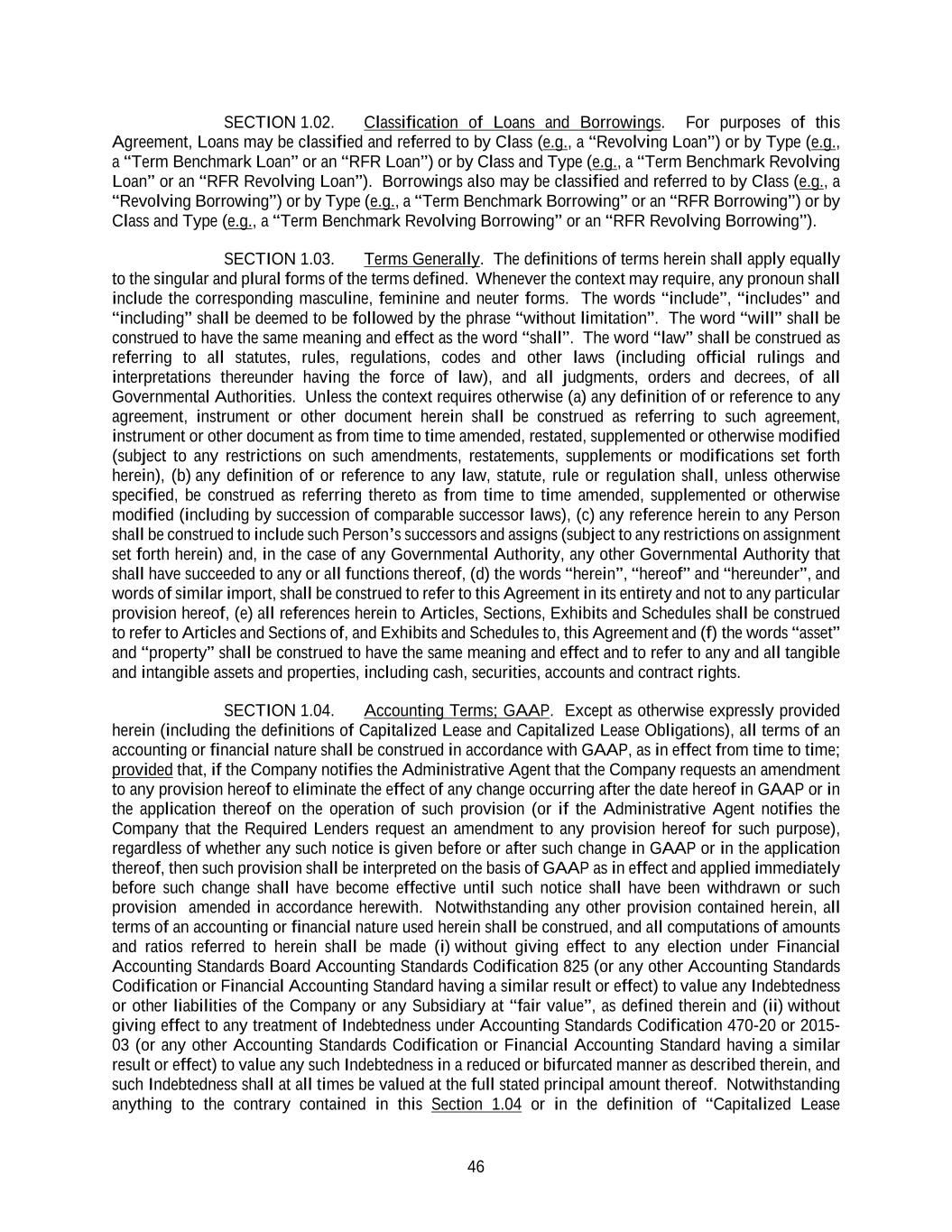 46 SECTION 1.02. Classification of Loans and Borrowings. For purposes of this Agreement, Loans may be classified and referred to by Class (e.g., a “Revolving Loan”) or by Type (e.g., a “Term Benchmark Loan” or an “RFR Loan”) or by Class and Type (e.g., a “Term Benchmark Revolving Loan” or an “RFR Revolving Loan”). Borrowings also may be classified and referred to by Class (e.g., a “Revolving Borrowing”) or by Type (e.g., a “Term Benchmark Borrowing” or an “RFR Borrowing”) or by Class and Type (e.g., a “Term Benchmark Revolving Borrowing” or an “RFR Revolving Borrowing”). SECTION 1.03. Terms Generally. The definitions of terms herein shall apply equally to the singular and plural forms of the terms defined. Whenever the context may require, any pronoun shall include the corresponding masculine, feminine and neuter forms. The words “include”, “includes” and “including” shall be deemed to be followed by the phrase “without limitation”. The word “will” shall be construed to have the same meaning and effect as the word “shall”. The word “law” shall be construed as referring to all statutes, rules, regulations, codes and other laws (including official rulings and interpretations thereunder having the force of law), and all judgments, orders and decrees, of all Governmental Authorities. Unless the context requires otherwise (a) any definition of or reference to any agreement, instrument or other document herein shall be construed as referring to such agreement, instrument or other document as from time to time amended, restated, supplemented or otherwise modified (subject to any restrictions on such amendments, restatements, supplements or modifications set forth herein), (b) any definition of or reference to any law, statute, rule or regulation shall, unless otherwise specified, be construed as referring thereto as from time to time amended, supplemented or otherwise modified (including by succession of comparable successor laws), (c) any reference herein to any Person shall be construed to include such Person’s successors and assigns (subject to any restrictions on assignment set forth herein) and, in the case of any Governmental Authority, any other Governmental Authority that shall have succeeded to any or all functions thereof, (d) the words “herein”, “hereof” and “hereunder”, and words of similar import, shall be construed to refer to this Agreement in its entirety and not to any particular provision hereof, (e) all references herein to Articles, Sections, Exhibits and Schedules shall be construed to refer to Articles and Sections of, and Exhibits and Schedules to, this Agreement and (f) the words “asset” and “property” shall be construed to have the same meaning and effect and to refer to any and all tangible and intangible assets and properties, including cash, securities, accounts and contract rights. SECTION 1.04. Accounting Terms; GAAP. Except as otherwise expressly provided herein (including the definitions of Capitalized Lease and Capitalized Lease Obligations), all terms of an accounting or financial nature shall be construed in accordance with GAAP, as in effect from time to time; provided that, if the Company notifies the Administrative Agent that the Company requests an amendment to any provision hereof to eliminate the effect of any change occurring after the date hereof in GAAP or in the application thereof on the operation of such provision (or if the Administrative Agent notifies the Company that the Required Lenders request an amendment to any provision hereof for such purpose), regardless of whether any such notice is given before or after such change in GAAP or in the application thereof, then such provision shall be interpreted on the basis of GAAP as in effect and applied immediately before such change shall have become effective until such notice shall have been withdrawn or such provision amended in accordance herewith. Notwithstanding any other provision contained herein, all terms of an accounting or financial nature used herein shall be construed, and all computations of amounts and ratios referred to herein shall be made (i) without giving effect to any election under Financial Accounting Standards Board Accounting Standards Codification 825 (or any other Accounting Standards Codification or Financial Accounting Standard having a similar result or effect) to value any Indebtedness or other liabilities of the Company or any Subsidiary at “fair value”, as defined therein and (ii) without giving effect to any treatment of Indebtedness under Accounting Standards Codification 470-20 or 2015- 03 (or any other Accounting Standards Codification or Financial Accounting Standard having a similar result or effect) to value any such Indebtedness in a reduced or bifurcated manner as described therein, and such Indebtedness shall at all times be valued at the full stated principal amount thereof. Notwithstanding anything to the contrary contained in this Section 1.04 or in the definition of “Capitalized Lease