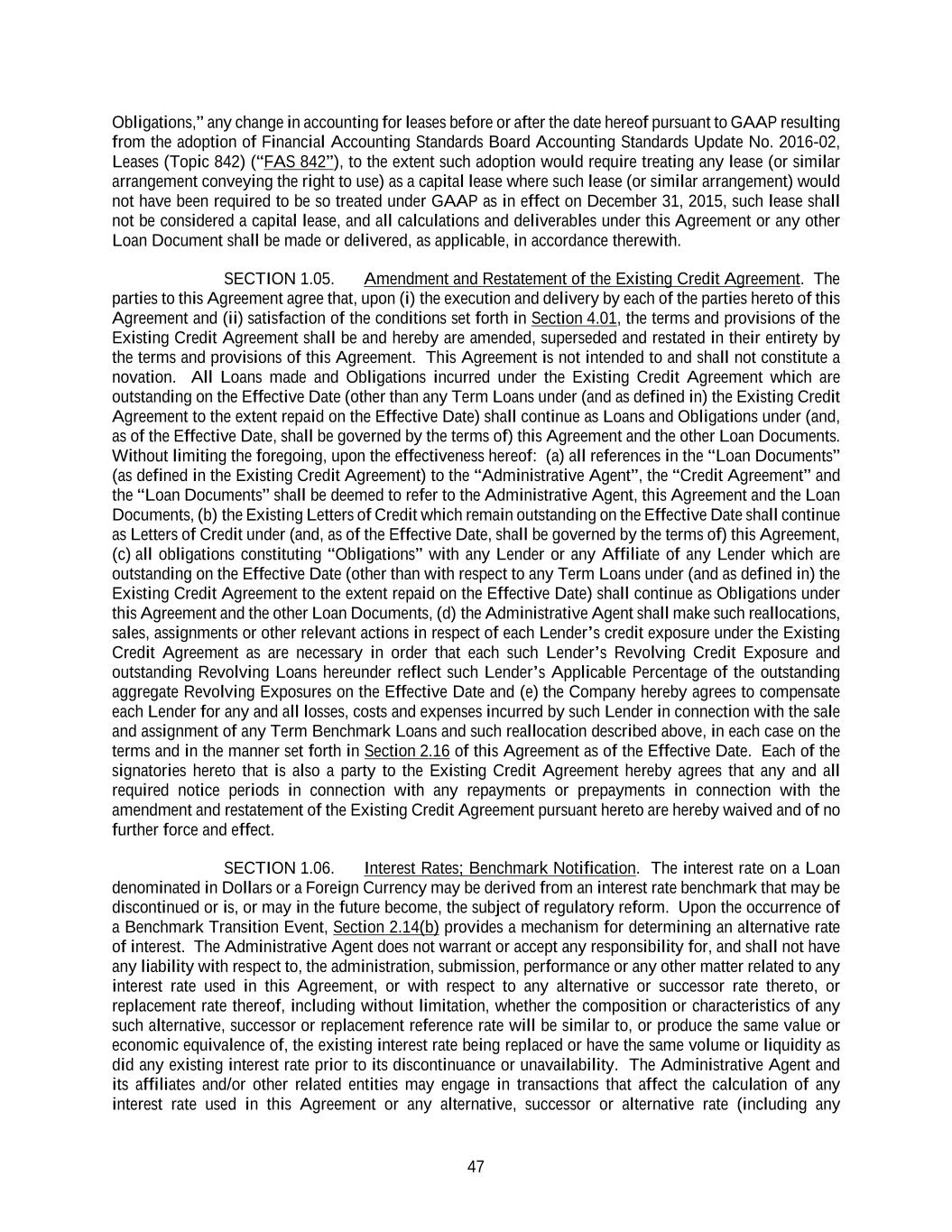 47 Obligations,” any change in accounting for leases before or after the date hereof pursuant to GAAP resulting from the adoption of Financial Accounting Standards Board Accounting Standards Update No. 2016-02, Leases (Topic 842) (“FAS 842”), to the extent such adoption would require treating any lease (or similar arrangement conveying the right to use) as a capital lease where such lease (or similar arrangement) would not have been required to be so treated under GAAP as in effect on December 31, 2015, such lease shall not be considered a capital lease, and all calculations and deliverables under this Agreement or any other Loan Document shall be made or delivered, as applicable, in accordance therewith. SECTION 1.05. Amendment and Restatement of the Existing Credit Agreement. The parties to this Agreement agree that, upon (i) the execution and delivery by each of the parties hereto of this Agreement and (ii) satisfaction of the conditions set forth in Section 4.01, the terms and provisions of the Existing Credit Agreement shall be and hereby are amended, superseded and restated in their entirety by the terms and provisions of this Agreement. This Agreement is not intended to and shall not constitute a novation. All Loans made and Obligations incurred under the Existing Credit Agreement which are outstanding on the Effective Date (other than any Term Loans under (and as defined in) the Existing Credit Agreement to the extent repaid on the Effective Date) shall continue as Loans and Obligations under (and, as of the Effective Date, shall be governed by the terms of) this Agreement and the other Loan Documents. Without limiting the foregoing, upon the effectiveness hereof: (a) all references in the “Loan Documents” (as defined in the Existing Credit Agreement) to the “Administrative Agent”, the “Credit Agreement” and the “Loan Documents” shall be deemed to refer to the Administrative Agent, this Agreement and the Loan Documents, (b) the Existing Letters of Credit which remain outstanding on the Effective Date shall continue as Letters of Credit under (and, as of the Effective Date, shall be governed by the terms of) this Agreement, (c) all obligations constituting “Obligations” with any Lender or any Affiliate of any Lender which are outstanding on the Effective Date (other than with respect to any Term Loans under (and as defined in) the Existing Credit Agreement to the extent repaid on the Effective Date) shall continue as Obligations under this Agreement and the other Loan Documents, (d) the Administrative Agent shall make such reallocations, sales, assignments or other relevant actions in respect of each Lender’s credit exposure under the Existing Credit Agreement as are necessary in order that each such Lender’s Revolving Credit Exposure and outstanding Revolving Loans hereunder reflect such Lender’s Applicable Percentage of the outstanding aggregate Revolving Exposures on the Effective Date and (e) the Company hereby agrees to compensate each Lender for any and all losses, costs and expenses incurred by such Lender in connection with the sale and assignment of any Term Benchmark Loans and such reallocation described above, in each case on the terms and in the manner set forth in Section 2.16 of this Agreement as of the Effective Date. Each of the signatories hereto that is also a party to the Existing Credit Agreement hereby agrees that any and all required notice periods in connection with any repayments or prepayments in connection with the amendment and restatement of the Existing Credit Agreement pursuant hereto are hereby waived and of no further force and effect. SECTION 1.06. Interest Rates; Benchmark Notification. The interest rate on a Loan denominated in Dollars or a Foreign Currency may be derived from an interest rate benchmark that may be discontinued or is, or may in the future become, the subject of regulatory reform. Upon the occurrence of a Benchmark Transition Event, Section 2.14(b) provides a mechanism for determining an alternative rate of interest. The Administrative Agent does not warrant or accept any responsibility for, and shall not have any liability with respect to, the administration, submission, performance or any other matter related to any interest rate used in this Agreement, or with respect to any alternative or successor rate thereto, or replacement rate thereof, including without limitation, whether the composition or characteristics of any such alternative, successor or replacement reference rate will be similar to, or produce the same value or economic equivalence of, the existing interest rate being replaced or have the same volume or liquidity as did any existing interest rate prior to its discontinuance or unavailability. The Administrative Agent and its affiliates and/or other related entities may engage in transactions that affect the calculation of any interest rate used in this Agreement or any alternative, successor or alternative rate (including any