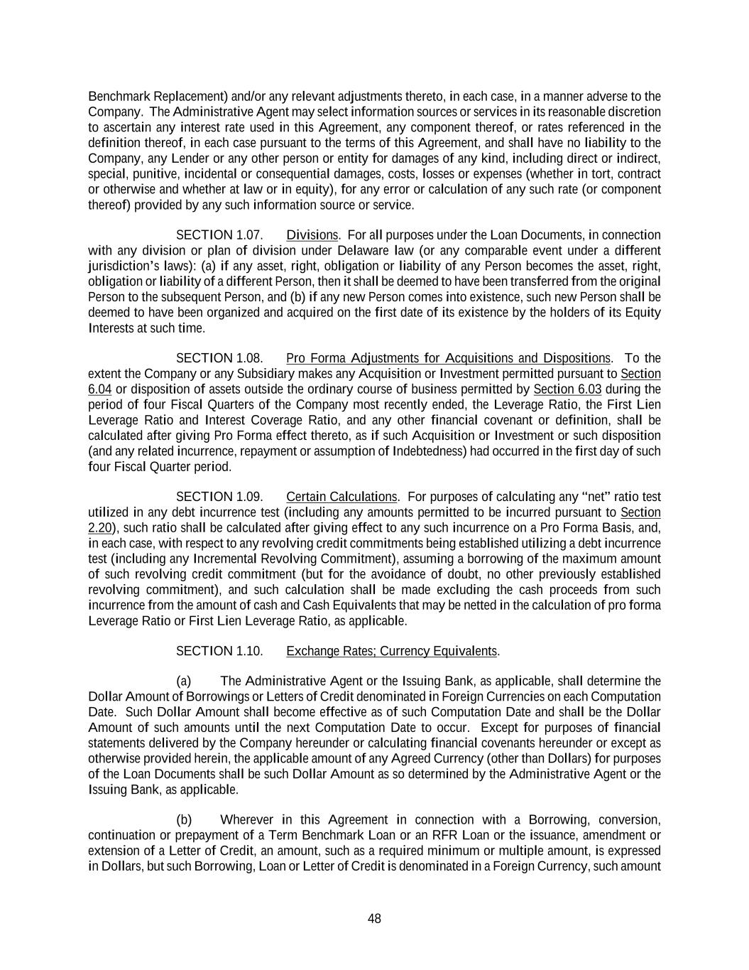 48 Benchmark Replacement) and/or any relevant adjustments thereto, in each case, in a manner adverse to the Company. The Administrative Agent may select information sources or services in its reasonable discretion to ascertain any interest rate used in this Agreement, any component thereof, or rates referenced in the definition thereof, in each case pursuant to the terms of this Agreement, and shall have no liability to the Company, any Lender or any other person or entity for damages of any kind, including direct or indirect, special, punitive, incidental or consequential damages, costs, losses or expenses (whether in tort, contract or otherwise and whether at law or in equity), for any error or calculation of any such rate (or component thereof) provided by any such information source or service. SECTION 1.07. Divisions. For all purposes under the Loan Documents, in connection with any division or plan of division under Delaware law (or any comparable event under a different jurisdiction’s laws): (a) if any asset, right, obligation or liability of any Person becomes the asset, right, obligation or liability of a different Person, then it shall be deemed to have been transferred from the original Person to the subsequent Person, and (b) if any new Person comes into existence, such new Person shall be deemed to have been organized and acquired on the first date of its existence by the holders of its Equity Interests at such time. SECTION 1.08. Pro Forma Adjustments for Acquisitions and Dispositions. To the extent the Company or any Subsidiary makes any Acquisition or Investment permitted pursuant to Section 6.04 or disposition of assets outside the ordinary course of business permitted by Section 6.03 during the period of four Fiscal Quarters of the Company most recently ended, the Leverage Ratio, the First Lien Leverage Ratio and Interest Coverage Ratio, and any other financial covenant or definition, shall be calculated after giving Pro Forma effect thereto, as if such Acquisition or Investment or such disposition (and any related incurrence, repayment or assumption of Indebtedness) had occurred in the first day of such four Fiscal Quarter period. SECTION 1.09. Certain Calculations. For purposes of calculating any “net” ratio test utilized in any debt incurrence test (including any amounts permitted to be incurred pursuant to Section 2.20), such ratio shall be calculated after giving effect to any such incurrence on a Pro Forma Basis, and, in each case, with respect to any revolving credit commitments being established utilizing a debt incurrence test (including any Incremental Revolving Commitment), assuming a borrowing of the maximum amount of such revolving credit commitment (but for the avoidance of doubt, no other previously established revolving commitment), and such calculation shall be made excluding the cash proceeds from such incurrence from the amount of cash and Cash Equivalents that may be netted in the calculation of pro forma Leverage Ratio or First Lien Leverage Ratio, as applicable. SECTION 1.10. Exchange Rates; Currency Equivalents. (a) The Administrative Agent or the Issuing Bank, as applicable, shall determine the Dollar Amount of Borrowings or Letters of Credit denominated in Foreign Currencies on each Computation Date. Such Dollar Amount shall become effective as of such Computation Date and shall be the Dollar Amount of such amounts until the next Computation Date to occur. Except for purposes of financial statements delivered by the Company hereunder or calculating financial covenants hereunder or except as otherwise provided herein, the applicable amount of any Agreed Currency (other than Dollars) for purposes of the Loan Documents shall be such Dollar Amount as so determined by the Administrative Agent or the Issuing Bank, as applicable. (b) Wherever in this Agreement in connection with a Borrowing, conversion, continuation or prepayment of a Term Benchmark Loan or an RFR Loan or the issuance, amendment or extension of a Letter of Credit, an amount, such as a required minimum or multiple amount, is expressed in Dollars, but such Borrowing, Loan or Letter of Credit is denominated in a Foreign Currency, such amount