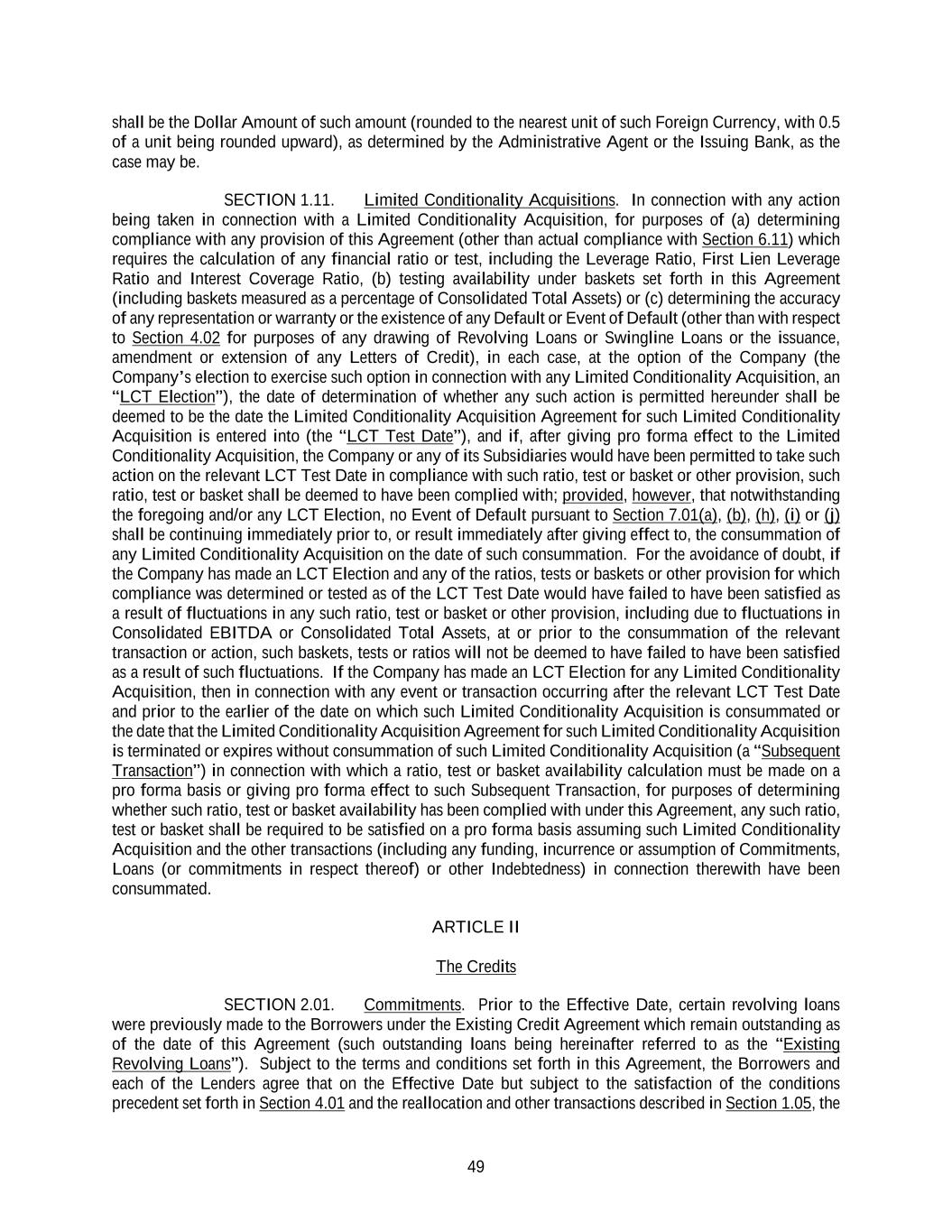 49 shall be the Dollar Amount of such amount (rounded to the nearest unit of such Foreign Currency, with 0.5 of a unit being rounded upward), as determined by the Administrative Agent or the Issuing Bank, as the case may be. SECTION 1.11. Limited Conditionality Acquisitions. In connection with any action being taken in connection with a Limited Conditionality Acquisition, for purposes of (a) determining compliance with any provision of this Agreement (other than actual compliance with Section 6.11) which requires the calculation of any financial ratio or test, including the Leverage Ratio, First Lien Leverage Ratio and Interest Coverage Ratio, (b) testing availability under baskets set forth in this Agreement (including baskets measured as a percentage of Consolidated Total Assets) or (c) determining the accuracy of any representation or warranty or the existence of any Default or Event of Default (other than with respect to Section 4.02 for purposes of any drawing of Revolving Loans or Swingline Loans or the issuance, amendment or extension of any Letters of Credit), in each case, at the option of the Company (the Company’s election to exercise such option in connection with any Limited Conditionality Acquisition, an “LCT Election”), the date of determination of whether any such action is permitted hereunder shall be deemed to be the date the Limited Conditionality Acquisition Agreement for such Limited Conditionality Acquisition is entered into (the “LCT Test Date”), and if, after giving pro forma effect to the Limited Conditionality Acquisition, the Company or any of its Subsidiaries would have been permitted to take such action on the relevant LCT Test Date in compliance with such ratio, test or basket or other provision, such ratio, test or basket shall be deemed to have been complied with; provided, however, that notwithstanding the foregoing and/or any LCT Election, no Event of Default pursuant to Section 7.01(a), (b), (h), (i) or (j) shall be continuing immediately prior to, or result immediately after giving effect to, the consummation of any Limited Conditionality Acquisition on the date of such consummation. For the avoidance of doubt, if the Company has made an LCT Election and any of the ratios, tests or baskets or other provision for which compliance was determined or tested as of the LCT Test Date would have failed to have been satisfied as a result of fluctuations in any such ratio, test or basket or other provision, including due to fluctuations in Consolidated EBITDA or Consolidated Total Assets, at or prior to the consummation of the relevant transaction or action, such baskets, tests or ratios will not be deemed to have failed to have been satisfied as a result of such fluctuations. If the Company has made an LCT Election for any Limited Conditionality Acquisition, then in connection with any event or transaction occurring after the relevant LCT Test Date and prior to the earlier of the date on which such Limited Conditionality Acquisition is consummated or the date that the Limited Conditionality Acquisition Agreement for such Limited Conditionality Acquisition is terminated or expires without consummation of such Limited Conditionality Acquisition (a “Subsequent Transaction”) in connection with which a ratio, test or basket availability calculation must be made on a pro forma basis or giving pro forma effect to such Subsequent Transaction, for purposes of determining whether such ratio, test or basket availability has been complied with under this Agreement, any such ratio, test or basket shall be required to be satisfied on a pro forma basis assuming such Limited Conditionality Acquisition and the other transactions (including any funding, incurrence or assumption of Commitments, Loans (or commitments in respect thereof) or other Indebtedness) in connection therewith have been consummated. ARTICLE II The Credits SECTION 2.01. Commitments. Prior to the Effective Date, certain revolving loans were previously made to the Borrowers under the Existing Credit Agreement which remain outstanding as of the date of this Agreement (such outstanding loans being hereinafter referred to as the “Existing Revolving Loans”). Subject to the terms and conditions set forth in this Agreement, the Borrowers and each of the Lenders agree that on the Effective Date but subject to the satisfaction of the conditions precedent set forth in Section 4.01 and the reallocation and other transactions described in Section 1.05, the