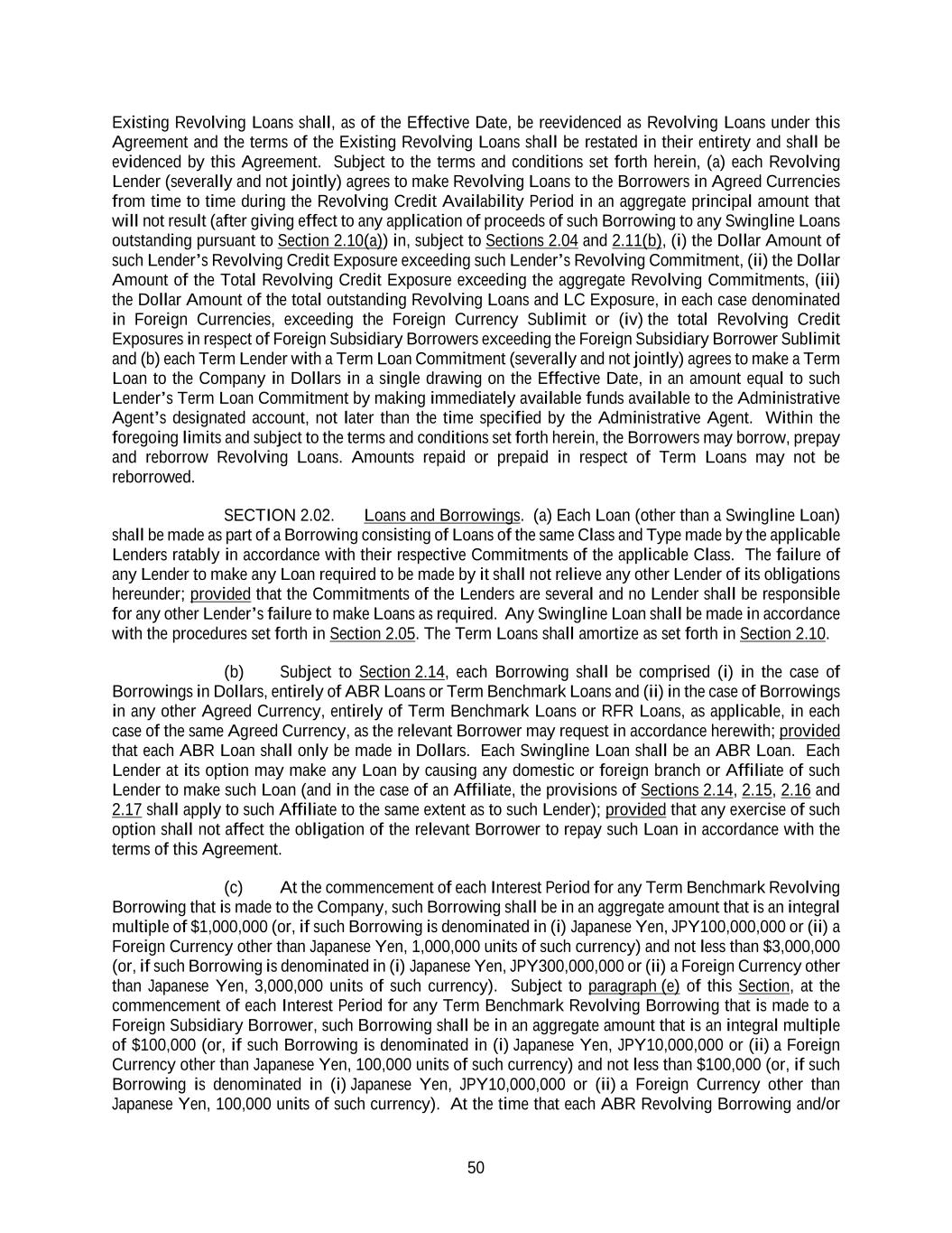 50 Existing Revolving Loans shall, as of the Effective Date, be reevidenced as Revolving Loans under this Agreement and the terms of the Existing Revolving Loans shall be restated in their entirety and shall be evidenced by this Agreement. Subject to the terms and conditions set forth herein, (a) each Revolving Lender (severally and not jointly) agrees to make Revolving Loans to the Borrowers in Agreed Currencies from time to time during the Revolving Credit Availability Period in an aggregate principal amount that will not result (after giving effect to any application of proceeds of such Borrowing to any Swingline Loans outstanding pursuant to Section 2.10(a)) in, subject to Sections 2.04 and 2.11(b), (i) the Dollar Amount of such Lender’s Revolving Credit Exposure exceeding such Lender’s Revolving Commitment, (ii) the Dollar Amount of the Total Revolving Credit Exposure exceeding the aggregate Revolving Commitments, (iii) the Dollar Amount of the total outstanding Revolving Loans and LC Exposure, in each case denominated in Foreign Currencies, exceeding the Foreign Currency Sublimit or (iv) the total Revolving Credit Exposures in respect of Foreign Subsidiary Borrowers exceeding the Foreign Subsidiary Borrower Sublimit and (b) each Term Lender with a Term Loan Commitment (severally and not jointly) agrees to make a Term Loan to the Company in Dollars in a single drawing on the Effective Date, in an amount equal to such Lender’s Term Loan Commitment by making immediately available funds available to the Administrative Agent’s designated account, not later than the time specified by the Administrative Agent. Within the foregoing limits and subject to the terms and conditions set forth herein, the Borrowers may borrow, prepay and reborrow Revolving Loans. Amounts repaid or prepaid in respect of Term Loans may not be reborrowed. SECTION 2.02. Loans and Borrowings. (a) Each Loan (other than a Swingline Loan) shall be made as part of a Borrowing consisting of Loans of the same Class and Type made by the applicable Lenders ratably in accordance with their respective Commitments of the applicable Class. The failure of any Lender to make any Loan required to be made by it shall not relieve any other Lender of its obligations hereunder; provided that the Commitments of the Lenders are several and no Lender shall be responsible for any other Lender’s failure to make Loans as required. Any Swingline Loan shall be made in accordance with the procedures set forth in Section 2.05. The Term Loans shall amortize as set forth in Section 2.10. (b) Subject to Section 2.14, each Borrowing shall be comprised (i) in the case of Borrowings in Dollars, entirely of ABR Loans or Term Benchmark Loans and (ii) in the case of Borrowings in any other Agreed Currency, entirely of Term Benchmark Loans or RFR Loans, as applicable, in each case of the same Agreed Currency, as the relevant Borrower may request in accordance herewith; provided that each ABR Loan shall only be made in Dollars. Each Swingline Loan shall be an ABR Loan. Each Lender at its option may make any Loan by causing any domestic or foreign branch or Affiliate of such Lender to make such Loan (and in the case of an Affiliate, the provisions of Sections 2.14, 2.15, 2.16 and 2.17 shall apply to such Affiliate to the same extent as to such Lender); provided that any exercise of such option shall not affect the obligation of the relevant Borrower to repay such Loan in accordance with the terms of this Agreement. (c) At the commencement of each Interest Period for any Term Benchmark Revolving Borrowing that is made to the Company, such Borrowing shall be in an aggregate amount that is an integral multiple of $1,000,000 (or, if such Borrowing is denominated in (i) Japanese Yen, JPY100,000,000 or (ii) a Foreign Currency other than Japanese Yen, 1,000,000 units of such currency) and not less than $3,000,000 (or, if such Borrowing is denominated in (i) Japanese Yen, JPY300,000,000 or (ii) a Foreign Currency other than Japanese Yen, 3,000,000 units of such currency). Subject to paragraph (e) of this Section, at the commencement of each Interest Period for any Term Benchmark Revolving Borrowing that is made to a Foreign Subsidiary Borrower, such Borrowing shall be in an aggregate amount that is an integral multiple of $100,000 (or, if such Borrowing is denominated in (i) Japanese Yen, JPY10,000,000 or (ii) a Foreign Currency other than Japanese Yen, 100,000 units of such currency) and not less than $100,000 (or, if such Borrowing is denominated in (i) Japanese Yen, JPY10,000,000 or (ii) a Foreign Currency other than Japanese Yen, 100,000 units of such currency). At the time that each ABR Revolving Borrowing and/or
