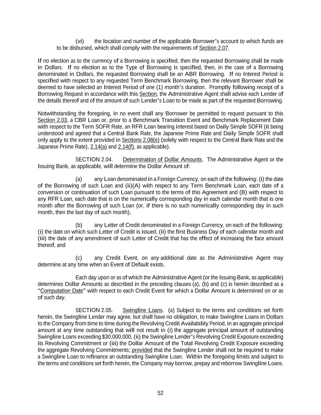 52 (vi) the location and number of the applicable Borrower’s account to which funds are to be disbursed, which shall comply with the requirements of Section 2.07. If no election as to the currency of a Borrowing is specified, then the requested Borrowing shall be made in Dollars. If no election as to the Type of Borrowing is specified, then, in the case of a Borrowing denominated in Dollars, the requested Borrowing shall be an ABR Borrowing. If no Interest Period is specified with respect to any requested Term Benchmark Borrowing, then the relevant Borrower shall be deemed to have selected an Interest Period of one (1) month’s duration. Promptly following receipt of a Borrowing Request in accordance with this Section, the Administrative Agent shall advise each Lender of the details thereof and of the amount of such Lender’s Loan to be made as part of the requested Borrowing. Notwithstanding the foregoing, in no event shall any Borrower be permitted to request pursuant to this Section 2.03, a CBR Loan or, prior to a Benchmark Transition Event and Benchmark Replacement Date with respect to the Term SOFR Rate, an RFR Loan bearing interest based on Daily Simple SOFR (it being understood and agreed that a Central Bank Rate, the Japanese Prime Rate and Daily Simple SOFR shall only apply to the extent provided in Sections 2.08(e) (solely with respect to the Central Bank Rate and the Japanese Prime Rate), 2.14(a) and 2.14(f), as applicable). SECTION 2.04. Determination of Dollar Amounts. The Administrative Agent or the Issuing Bank, as applicable, will determine the Dollar Amount of: (a) any Loan denominated in a Foreign Currency, on each of the following: (i) the date of the Borrowing of such Loan and (ii)(A) with respect to any Term Benchmark Loan, each date of a conversion or continuation of such Loan pursuant to the terms of this Agreement and (B) with respect to any RFR Loan, each date that is on the numerically corresponding day in each calendar month that is one month after the Borrowing of such Loan (or, if there is no such numerically corresponding day in such month, then the last day of such month), (b) any Letter of Credit denominated in a Foreign Currency, on each of the following: (i) the date on which such Letter of Credit is issued, (ii) the first Business Day of each calendar month and (iii) the date of any amendment of such Letter of Credit that has the effect of increasing the face amount thereof, and (c) any Credit Event, on any additional date as the Administrative Agent may determine at any time when an Event of Default exists. Each day upon or as of which the Administrative Agent (or the Issuing Bank, as applicable) determines Dollar Amounts as described in the preceding clauses (a), (b) and (c) is herein described as a “Computation Date” with respect to each Credit Event for which a Dollar Amount is determined on or as of such day. SECTION 2.05. Swingline Loans. (a) Subject to the terms and conditions set forth herein, the Swingline Lender may agree, but shall have no obligation, to make Swingline Loans in Dollars to the Company from time to time during the Revolving Credit Availability Period, in an aggregate principal amount at any time outstanding that will not result in (i) the aggregate principal amount of outstanding Swingline Loans exceeding $30,000,000, (ii) the Swingline Lender’s Revolving Credit Exposure exceeding its Revolving Commitment or (iii) the Dollar Amount of the Total Revolving Credit Exposure exceeding the aggregate Revolving Commitments; provided that the Swingline Lender shall not be required to make a Swingline Loan to refinance an outstanding Swingline Loan. Within the foregoing limits and subject to the terms and conditions set forth herein, the Company may borrow, prepay and reborrow Swingline Loans.